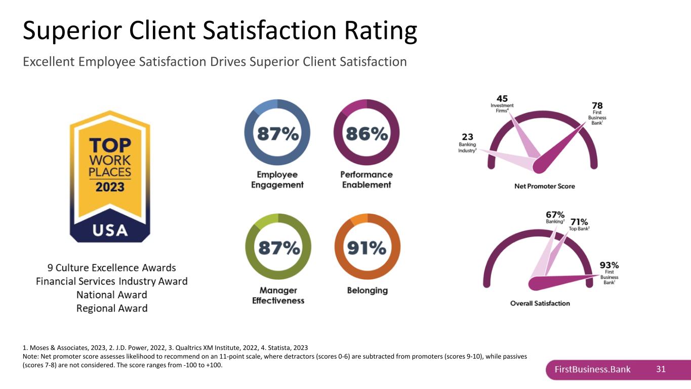 FirstBusiness.Bank31 Superior Client Satisfaction Rating Excellent Employee Satisfaction Drives Superior Client Satisfaction 1. Moses & Associates, 2023, 2. J.D. Power, 2022, 3. Qualtrics XM Institute, 2022, 4. Statista, 2023 Note: Net promoter score assesses likelihood to recommend on an 11-point scale, where detractors (scores 0-6) are subtracted from promoters (scores 9-10), while passives (scores 7-8) are not considered. The score ranges from -100 to +100.