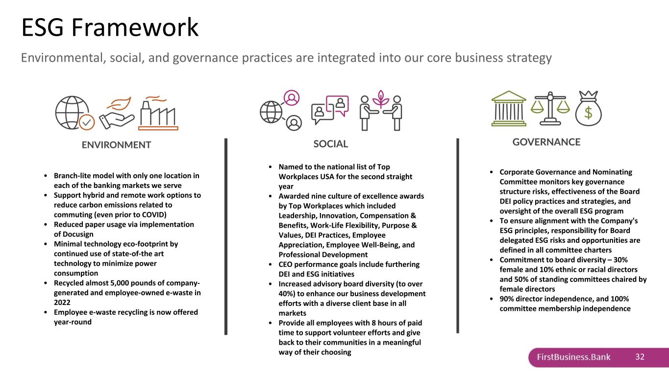FirstBusiness.Bank32 ESG Framework Environmental, social, and governance practices are integrated into our core business strategy • Branch-lite model with only one location in each of the banking markets we serve • Support hybrid and remote work options to reduce carbon emissions related to commuting (even prior to COVID) • Reduced paper usage via implementation of Docusign • Minimal technology eco-footprint by continued use of state-of-the art technology to minimize power consumption • Recycled almost 5,000 pounds of company- generated and employee-owned e-waste in 2022 • Employee e-waste recycling is now offered year-round • Named to the national list of Top Workplaces USA for the second straight year • Awarded nine culture of excellence awards by Top Workplaces which included Leadership, Innovation, Compensation & Benefits, Work-Life Flexibility, Purpose & Values, DEI Practices, Employee Appreciation, Employee Well-Being, and Professional Development • CEO performance goals include furthering DEI and ESG initiatives • Increased advisory board diversity (to over 40%) to enhance our business development efforts with a diverse client base in all markets • Provide all employees with 8 hours of paid time to support volunteer efforts and give back to their communities in a meaningful way of their choosing • Corporate Governance and Nominating Committee monitors key governance structure risks, effectiveness of the Board DEI policy practices and strategies, and oversight of the overall ESG program • To ensure alignment with the Company's ESG principles, responsibility for Board delegated ESG risks and opportunities are defined in all committee charters • Commitment to board diversity – 30% female and 10% ethnic or racial directors and 50% of standing committees chaired by female directors • 90% director independence, and 100% committee membership independence
