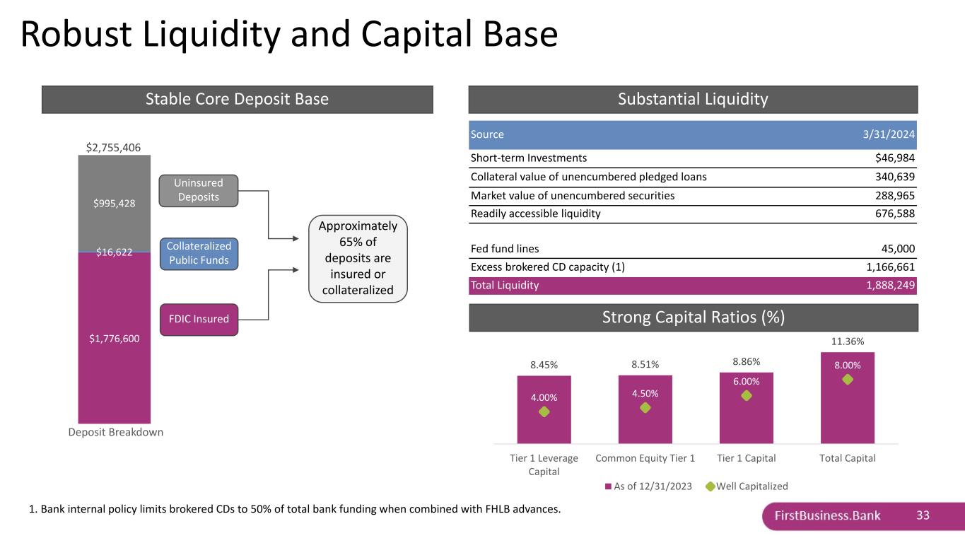 FirstBusiness.Bank33 $1,776,600 $16,622 $995,428 $2,755,406 Deposit Breakdown Robust Liquidity and Capital Base Stable Core Deposit Base Substantial Liquidity Strong Capital Ratios (%) Source 3/31/2024 Short-term Investments $46,984 Collateral value of unencumbered pledged loans 340,639 Market value of unencumbered securities 288,965 Readily accessible liquidity 676,588 Fed fund lines 45,000 Excess brokered CD capacity (1) 1,166,661 Total Liquidity 1,888,249 Uninsured Deposits Collateralized Public Funds FDIC Insured Approximately 65% of deposits are insured or collateralized 8.45% 8.51% 8.86% 11.36% 4.00% 4.50% 6.00% 8.00% Tier 1 Leverage Capital Common Equity Tier 1 Tier 1 Capital Total Capital As of 12/31/2023 Well Capitalized 1. Bank internal policy limits brokered CDs to 50% of total bank funding when combined with FHLB advances.