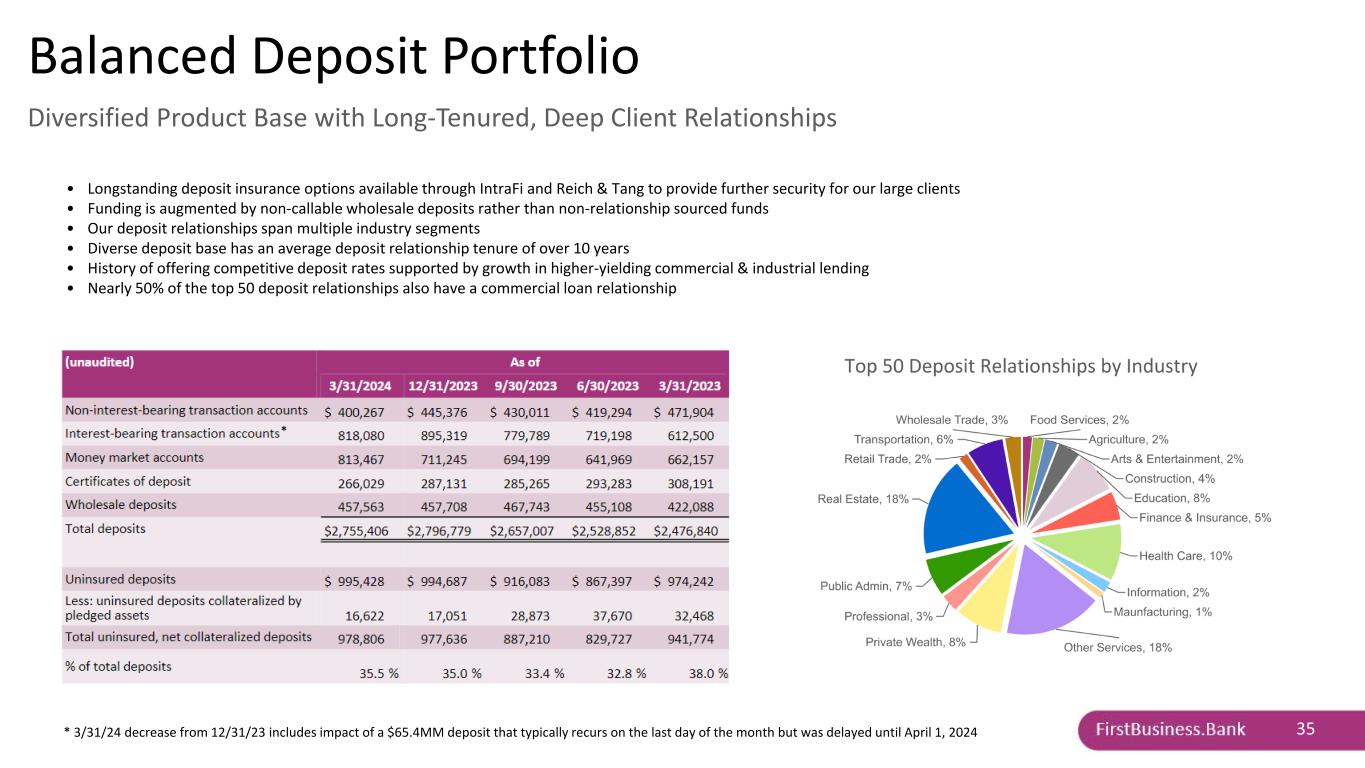 FirstBusiness.Bank35 Balanced Deposit Portfolio Diversified Product Base with Long-Tenured, Deep Client Relationships • Longstanding deposit insurance options available through IntraFi and Reich & Tang to provide further security for our large clients • Funding is augmented by non-callable wholesale deposits rather than non-relationship sourced funds • Our deposit relationships span multiple industry segments • Diverse deposit base has an average deposit relationship tenure of over 10 years • History of offering competitive deposit rates supported by growth in higher-yielding commercial & industrial lending • Nearly 50% of the top 50 deposit relationships also have a commercial loan relationship * 3/31/24 decrease from 12/31/23 includes impact of a $65.4MM deposit that typically recurs on the last day of the month but was delayed until April 1, 2024 *