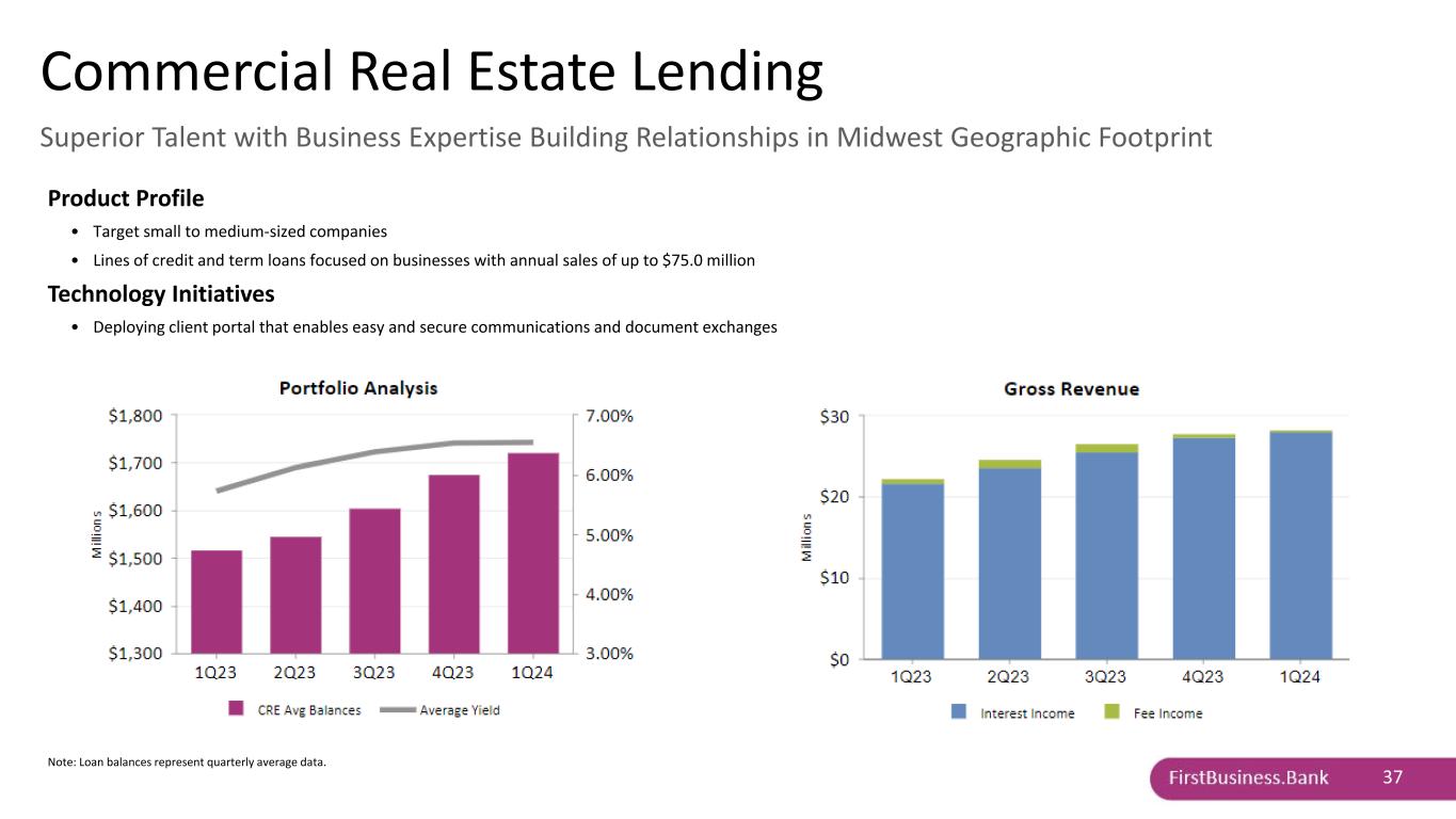 FirstBusiness.Bank36 Diversified Lending Products Double digit loan growth driven by stellar performance across all areas of the bank Note: Period end balances as of 3/31/2024 presented.