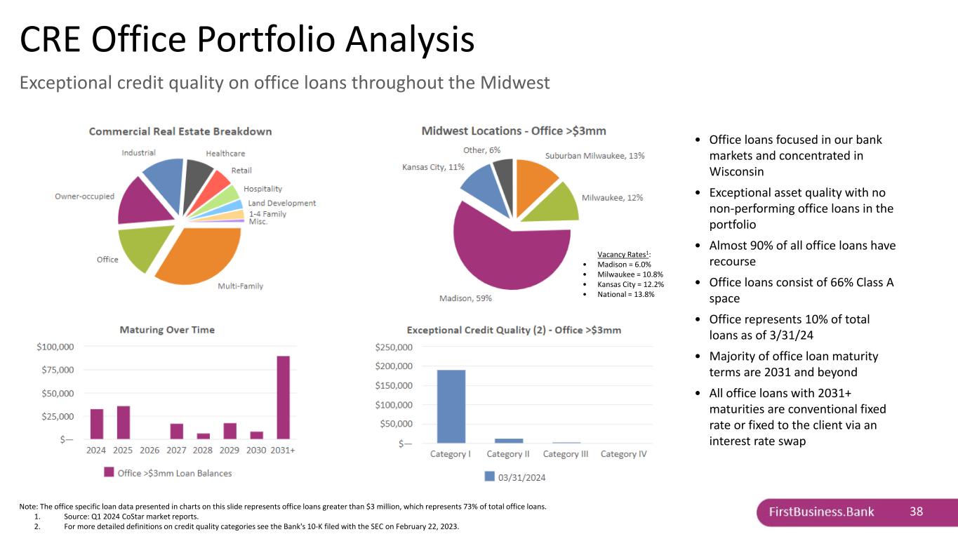 FirstBusiness.Bank28 19% 15% 14% 9% 6% 4% 4% 4% 3% 2% 20% 3/31/2024 Truck Transportation Construction of Buildings Specialty Trade Contractors Support Activities for Transp. Crop Farming Ambulatory Health Care Svcs Rental and Leasing Svcs Admin. and Support Svcs Prof., Scientific, and Technical Svcs Merch. Wholesalers, Durable Goods All Others Maturing Over Time $0.0 MM $10.0 MM $20.0 MM $30.0 MM $40.0 MM $50.0 MM $60.0 MM $70.0 MM 2024 2025 2026 2027 2028 2029 2030 2031 2032 Equip. Finance Excl Transp. Transportation Equipment Finance Portfolio by Industry 1. For more detailed definitions on credit quality categories see the Bank's 10-K filed with the SEC on February 28, 2024. Category IV represents non-performing loans. Equipment Finance Portfolio Analysis Strong and diversified portfolio; Transportation sub-category showing sector-specific weakness Asset Quality Breakdown1 • Equipment Finance (EF) loans diversified across industries ◦ EF comprised 26% of C&I loans and 10% of Total Loans at 3/31/2024 ◦ Transportation sector comprised 19% of EF, 5% of C&I, and 2% of Total Loans • Stable asset quality in EF portfolio excluding Transportation sector, which is experiencing isolated industry weakness Equipment Finance excl. Transportation 3/31/2023 12/31/2023 3/31/2024 Total Portfolio $164.7 MM $226.4 MM $237.1 MM Category I 96% 96% 96% Category II 1% 1% 1% Category III 1% 1% 1% Category IV 1% 2% 2% Transportation 3/31/2023 12/31/2023 3/31/2024 Total Portfolio $64.0 MM $60.9 MM $57.0 MM Category I 97% 90% 88% Category II 1% 1% 1% Category III 1% 2% 2% Category IV 1% 7% 9%