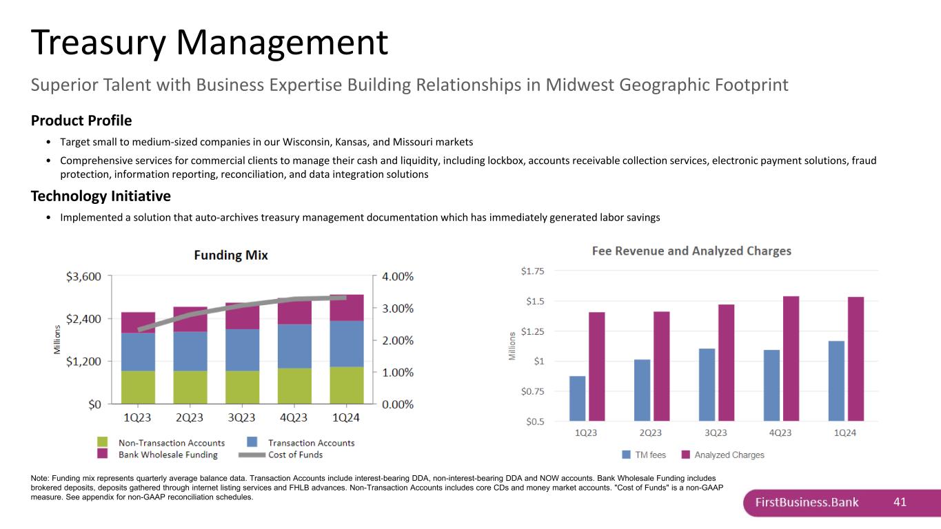 FirstBusiness.Bank40 Product Profile • Target small and medium companies in a variety of industries • Financings range from $250,000 to $10 million Technology Initiatives • Deploying client portal that enables easy and secure communications and document exchanges Note: Loan balances represent quarterly average data. C&I Lending Diversified commercial product offerings target companies nationwide