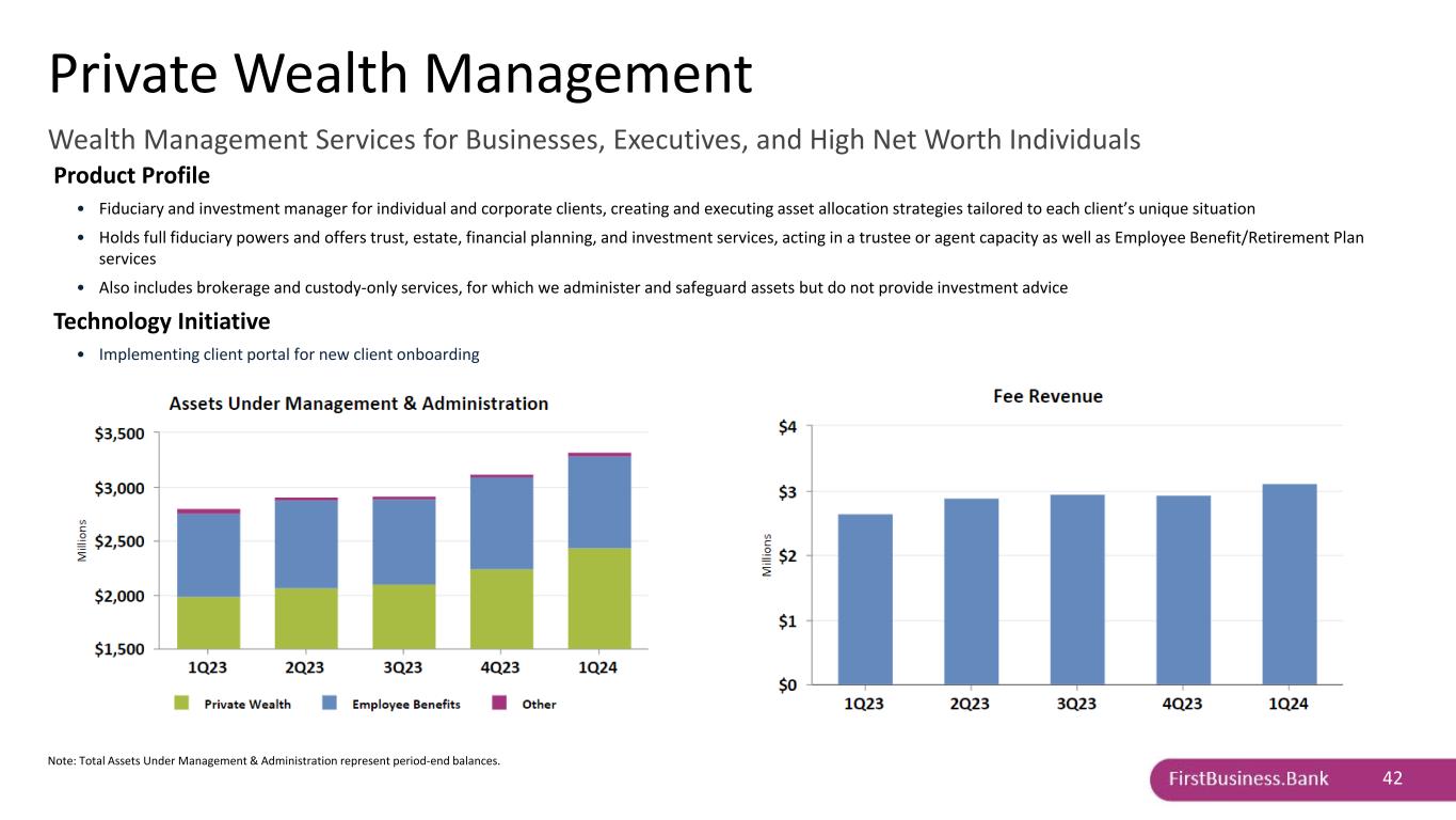 FirstBusiness.Bank42 Product Profile • Fiduciary and investment manager for individual and corporate clients, creating and executing asset allocation strategies tailored to each client’s unique situation • Holds full fiduciary powers and offers trust, estate, financial planning, and investment services, acting in a trustee or agent capacity as well as Employee Benefit/Retirement Plan services • Also includes brokerage and custody-only services, for which we administer and safeguard assets but do not provide investment advice Technology Initiative • Implementing client portal for new client onboarding Note: Total Assets Under Management & Administration represent period-end balances. Private Wealth Management Wealth Management Services for Businesses, Executives, and High Net Worth Individuals
