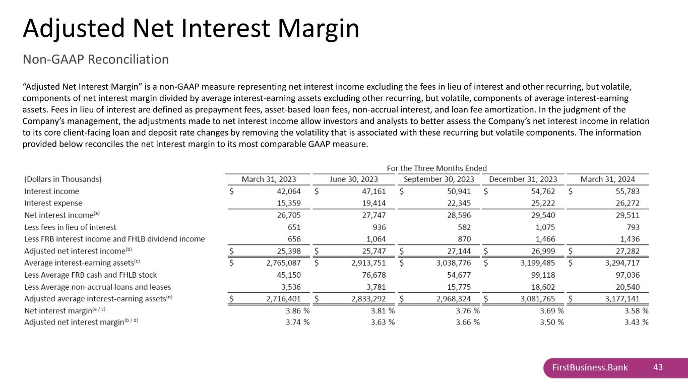 FirstBusiness.Bank43 “Adjusted Net Interest Margin” is a non-GAAP measure representing net interest income excluding the fees in lieu of interest and other recurring, but volatile, components of net interest margin divided by average interest-earning assets excluding other recurring, but volatile, components of average interest-earning assets. Fees in lieu of interest are defined as prepayment fees, asset-based loan fees, non-accrual interest, and loan fee amortization. In the judgment of the Company’s management, the adjustments made to net interest income allow investors and analysts to better assess the Company’s net interest income in relation to its core client-facing loan and deposit rate changes by removing the volatility that is associated with these recurring but volatile components. The information provided below reconciles the net interest margin to its most comparable GAAP measure. Adjusted Net Interest Margin Non-GAAP Reconciliation