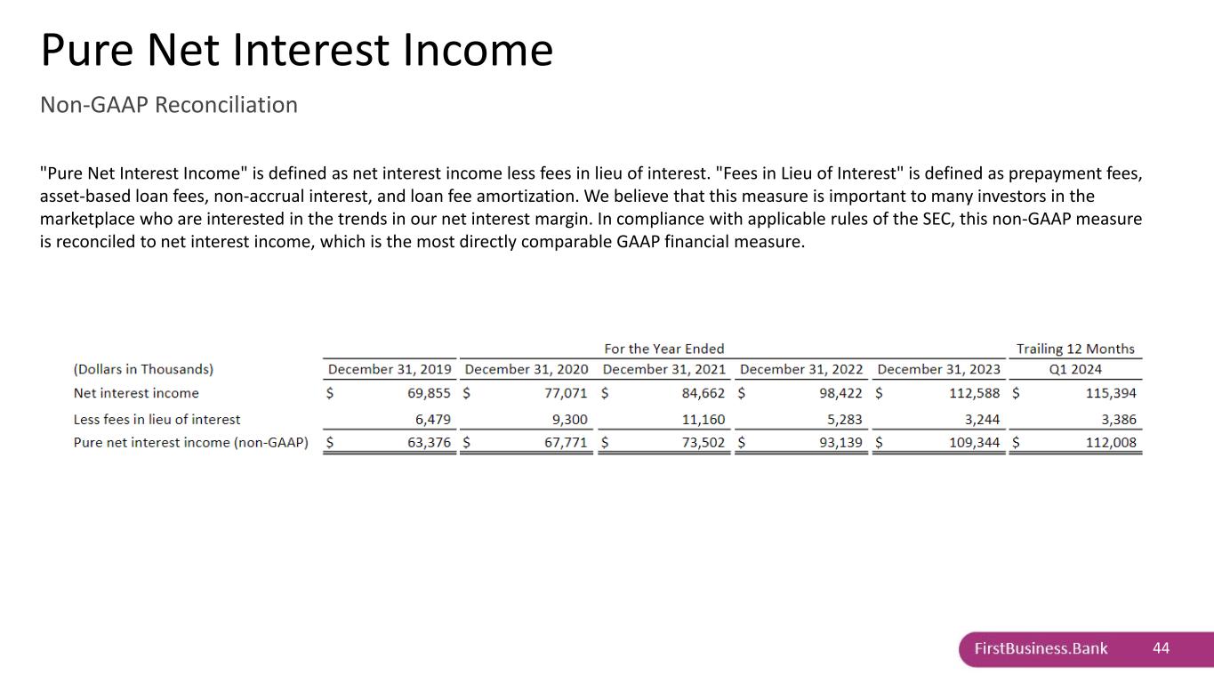 FirstBusiness.Bank44 "Pure Net Interest Income" is defined as net interest income less fees in lieu of interest. "Fees in Lieu of Interest" is defined as prepayment fees, asset-based loan fees, non-accrual interest, and loan fee amortization. We believe that this measure is important to many investors in the marketplace who are interested in the trends in our net interest margin. In compliance with applicable rules of the SEC, this non-GAAP measure is reconciled to net interest income, which is the most directly comparable GAAP financial measure. Pure Net Interest Income Non-GAAP Reconciliation