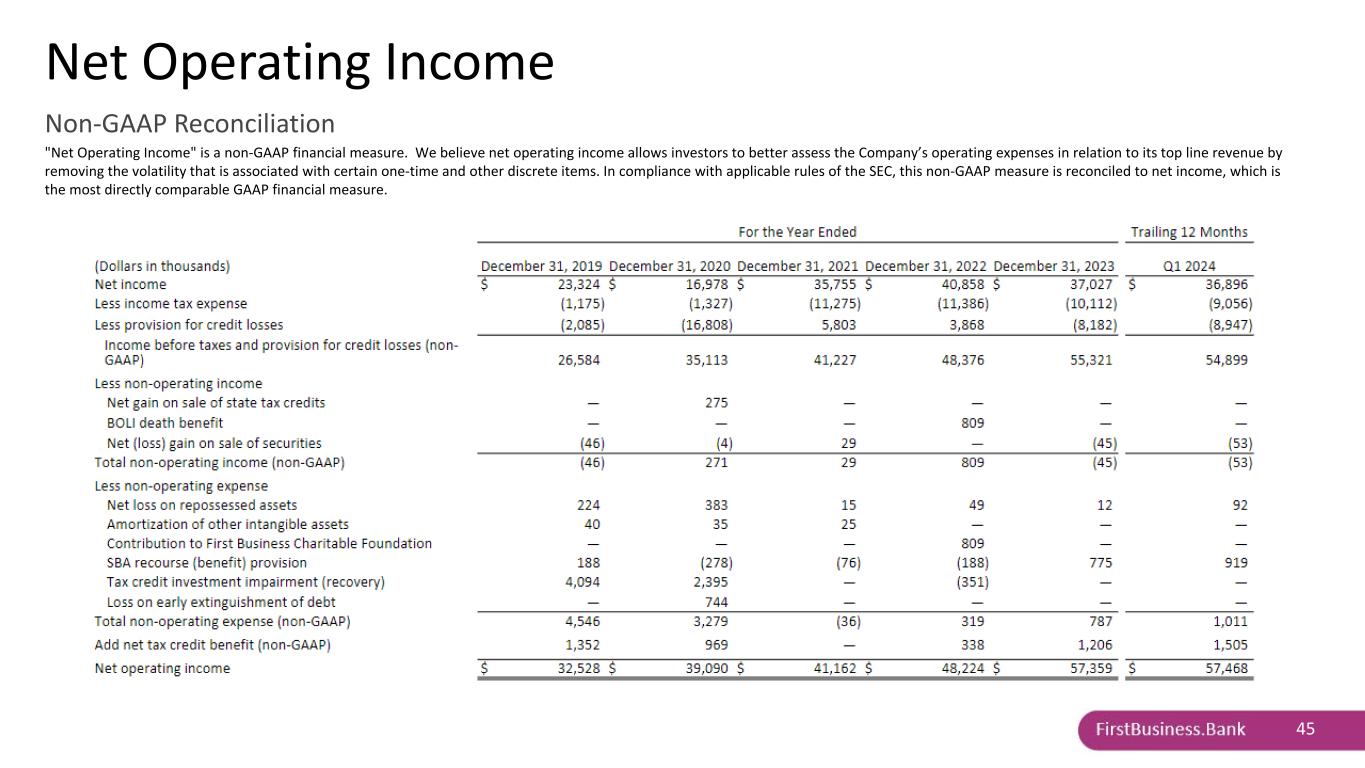 FirstBusiness.Bank45 "Net Operating Income" is a non-GAAP financial measure. We believe net operating income allows investors to better assess the Company’s operating expenses in relation to its top line revenue by removing the volatility that is associated with certain one-time and other discrete items. In compliance with applicable rules of the SEC, this non-GAAP measure is reconciled to net income, which is the most directly comparable GAAP financial measure. Net Operating Income Non-GAAP Reconciliation