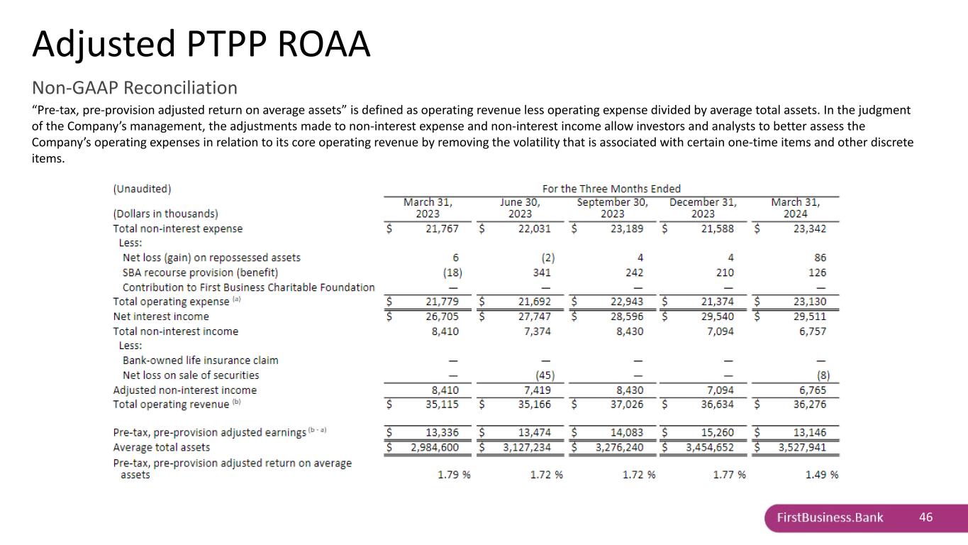 FirstBusiness.Bank46 “Pre-tax, pre-provision adjusted return on average assets” is defined as operating revenue less operating expense divided by average total assets. In the judgment of the Company’s management, the adjustments made to non-interest expense and non-interest income allow investors and analysts to better assess the Company’s operating expenses in relation to its core operating revenue by removing the volatility that is associated with certain one-time items and other discrete items. Adjusted PTPP ROAA Non-GAAP Reconciliation