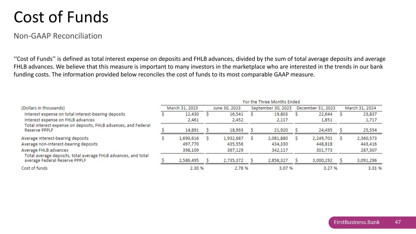 FirstBusiness.Bank47 ‘‘Cost of Funds’’ is defined as total interest expense on deposits and FHLB advances, divided by the sum of total average deposits and average FHLB advances. We believe that this measure is important to many investors in the marketplace who are interested in the trends in our bank funding costs. The information provided below reconciles the cost of funds to its most comparable GAAP measure. Cost of Funds Non-GAAP Reconciliation