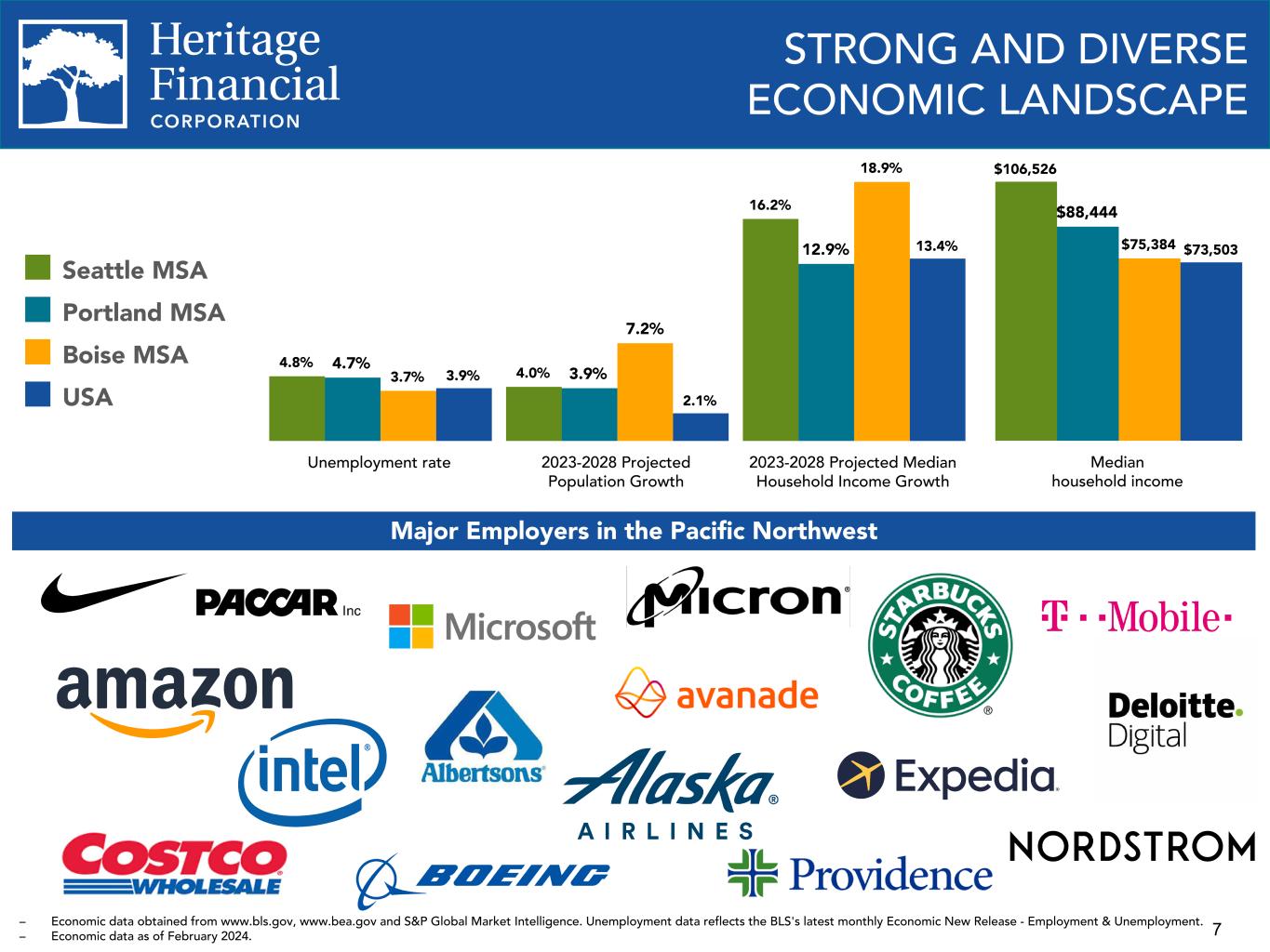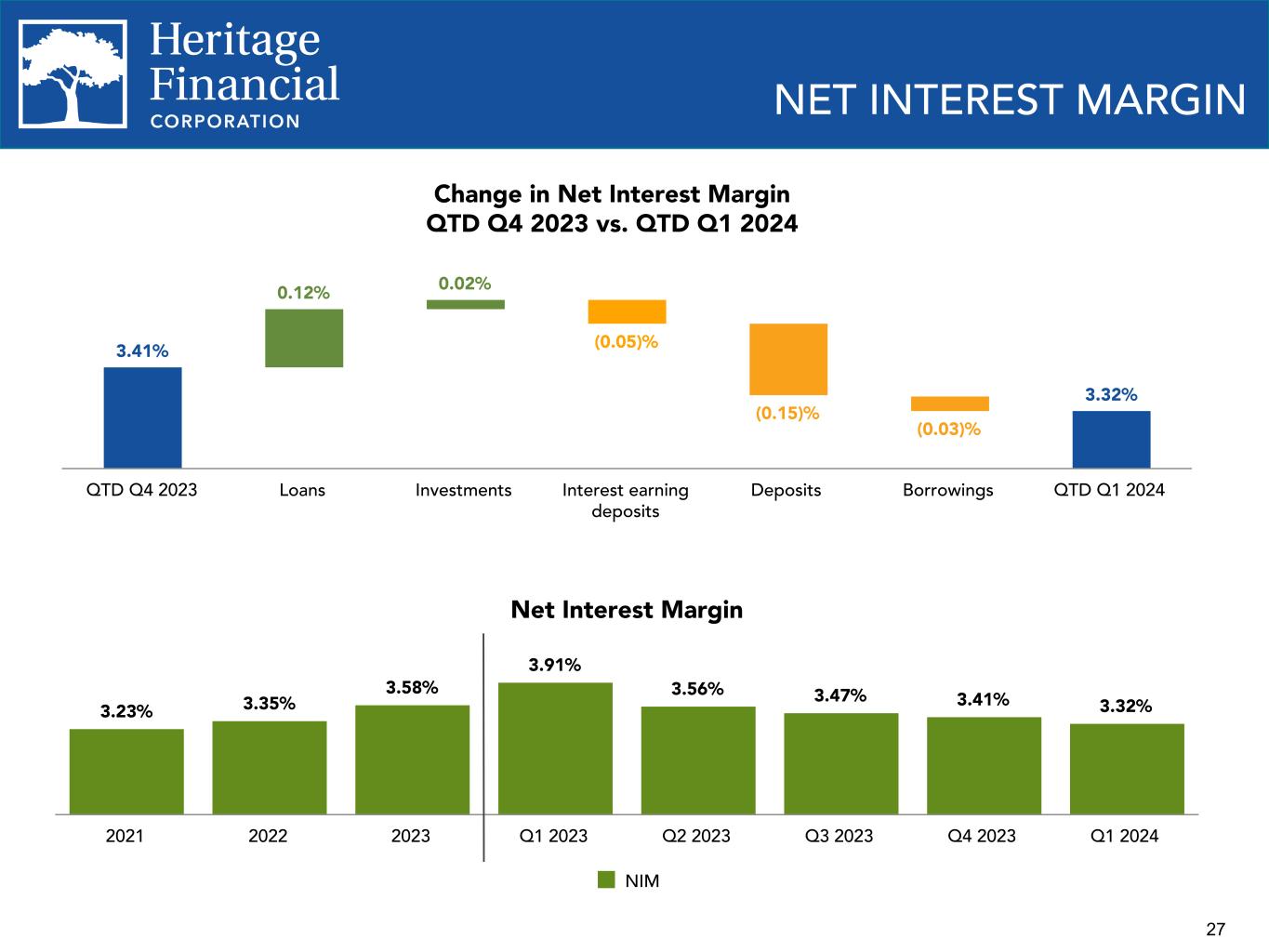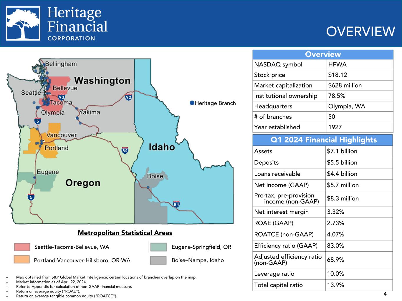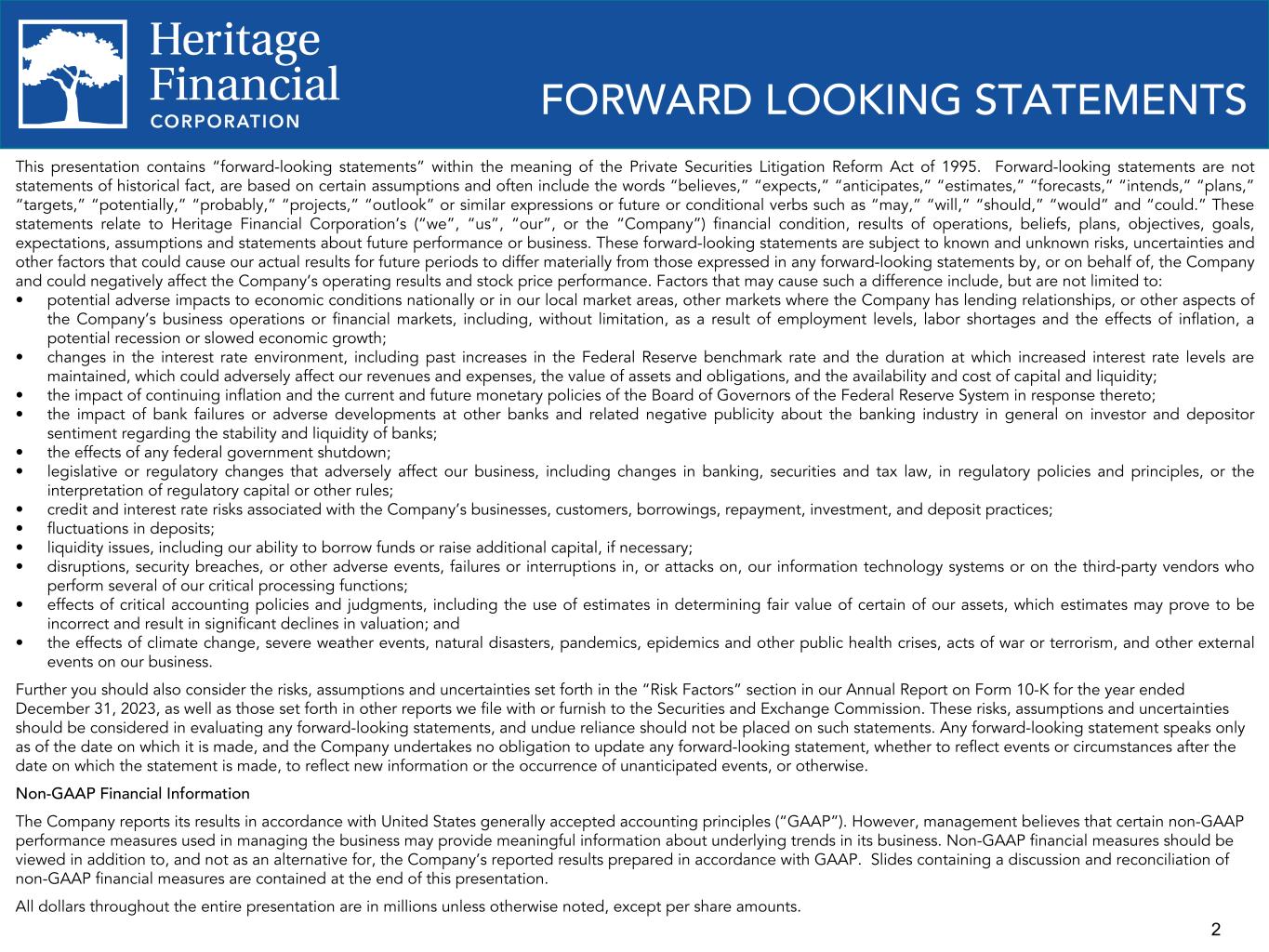 2 This presentation contains “forward-looking statements” within the meaning of the Private Securities Litigation Reform Act of 1995. Forward-looking statements are not statements of historical fact, are based on certain assumptions and often include the words “believes,” “expects,” “anticipates,” “estimates,” “forecasts,” “intends,” “plans,” “targets,” “potentially,” “probably,” “projects,” “outlook” or similar expressions or future or conditional verbs such as “may,” “will,” “should,” “would” and “could.” These statements relate to Heritage Financial Corporation’s (“we”, “us”, “our”, or the “Company”) financial condition, results of operations, beliefs, plans, objectives, goals, expectations, assumptions and statements about future performance or business. These forward-looking statements are subject to known and unknown risks, uncertainties and other factors that could cause our actual results for future periods to differ materially from those expressed in any forward-looking statements by, or on behalf of, the Company and could negatively affect the Company’s operating results and stock price performance. Factors that may cause such a difference include, but are not limited to: • potential adverse impacts to economic conditions nationally or in our local market areas, other markets where the Company has lending relationships, or other aspects of the Company’s business operations or financial markets, including, without limitation, as a result of employment levels, labor shortages and the effects of inflation, a potential recession or slowed economic growth; • changes in the interest rate environment, including past increases in the Federal Reserve benchmark rate and the duration at which increased interest rate levels are maintained, which could adversely affect our revenues and expenses, the value of assets and obligations, and the availability and cost of capital and liquidity; • the impact of continuing inflation and the current and future monetary policies of the Board of Governors of the Federal Reserve System in response thereto; • the impact of bank failures or adverse developments at other banks and related negative publicity about the banking industry in general on investor and depositor sentiment regarding the stability and liquidity of banks; • the effects of any federal government shutdown; • legislative or regulatory changes that adversely affect our business, including changes in banking, securities and tax law, in regulatory policies and principles, or the interpretation of regulatory capital or other rules; • credit and interest rate risks associated with the Company’s businesses, customers, borrowings, repayment, investment, and deposit practices; • fluctuations in deposits; • liquidity issues, including our ability to borrow funds or raise additional capital, if necessary; • disruptions, security breaches, or other adverse events, failures or interruptions in, or attacks on, our information technology systems or on the third-party vendors who perform several of our critical processing functions; • effects of critical accounting policies and judgments, including the use of estimates in determining fair value of certain of our assets, which estimates may prove to be incorrect and result in significant declines in valuation; and • the effects of climate change, severe weather events, natural disasters, pandemics, epidemics and other public health crises, acts of war or terrorism, and other external events on our business. Further you should also consider the risks, assumptions and uncertainties set forth in the “Risk Factors” section in our Annual Report on Form 10-K for the year ended December 31, 2023, as well as those set forth in other reports we file with or furnish to the Securities and Exchange Commission. These risks, assumptions and uncertainties should be considered in evaluating any forward-looking statements, and undue reliance should not be placed on such statements. Any forward-looking statement speaks only as of the date on which it is made, and the Company undertakes no obligation to update any forward-looking statement, whether to reflect events or circumstances after the date on which the statement is made, to reflect new information or the occurrence of unanticipated events, or otherwise. Non-GAAP Financial Information The Company reports its results in accordance with United States generally accepted accounting principles (“GAAP”). However, management believes that certain non-GAAP performance measures used in managing the business may provide meaningful information about underlying trends in its business. Non-GAAP financial measures should be viewed in addition to, and not as an alternative for, the Company’s reported results prepared in accordance with GAAP. Slides containing a discussion and reconciliation of non-GAAP financial measures are contained at the end of this presentation. All dollars throughout the entire presentation are in millions unless otherwise noted, except per share amounts. FORWARD LOOKING STATEMENTS