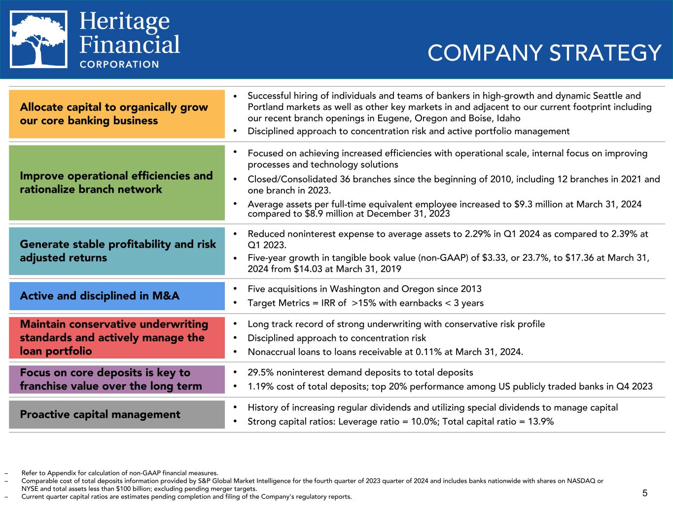 4 OVERVIEW Overview NASDAQ symbol HFWA Stock price $18.12 Market capitalization $628 million Institutional ownership 78.5% Headquarters Olympia, WA # of branches 50 Year established 1927 Q1 2024 Financial Highlights Assets $7.1 billion Deposits $5.5 billion Loans receivable $4.4 billion Net income (GAAP) $5.7 million Pre-tax, pre-provision income (non-GAAP) $8.3 million Net interest margin 3.32% ROAE (GAAP) 2.73% ROATCE (non-GAAP) 4.07% Efficiency ratio (GAAP) 83.0% Adjusted efficiency ratio (non-GAAP) 68.9% Leverage ratio 10.0% Total capital ratio 13.9% – Map obtained from S&P Global Market Intelligence; certain locations of branches overlap on the map. – Market information as of April 22, 2024. – Refer to Appendix for calculation of non-GAAP financial measure. – Return on average equity ("ROAE"). – Return on average tangible common equity ("ROATCE"). Metropolitan Statistical Areas Seattle-Tacoma-Bellevue, WA Portland-Vancouver-Hillsboro, OR-WA Eugene-Springfield, OR Boise–Nampa, Idaho Heritage Branch