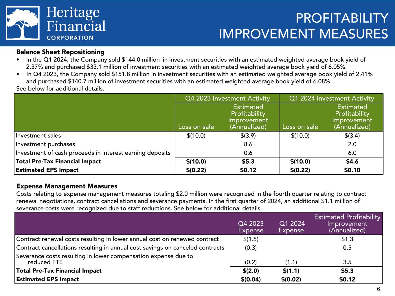 In the first quarter of 2024, the Company incurred a pre-tax loss of $10.0 million on the sale of investment securities due to the strategic repositioning of its balance sheet, which affected diluted earnings per share by $0.22 for the quarter. The Company sold $144.0 million in investment securities with an estimated weighted average book yield of 2.37% and purchased $33.1 million of investment securities with an estimated weighted average book yield of 6.05%. The remaining proceeds from sales were invested in interest earning deposits with a current yield of 5.40%. As a result of these actions, we anticipate an estimated annualized improvement of $4.6 million in interest income. Similar actions were taken during the fourth quarter of 2023 for which we incurred a pre-tax loss of $10.0 million and estimated annualized improvement of $5.3 million in interest income. Further, approximately $1.1 million of severance costs were incurred in the first quarter of 2024 as part of expense management initiatives, which affected diluted earnings per share by $0.02 for the quarter.