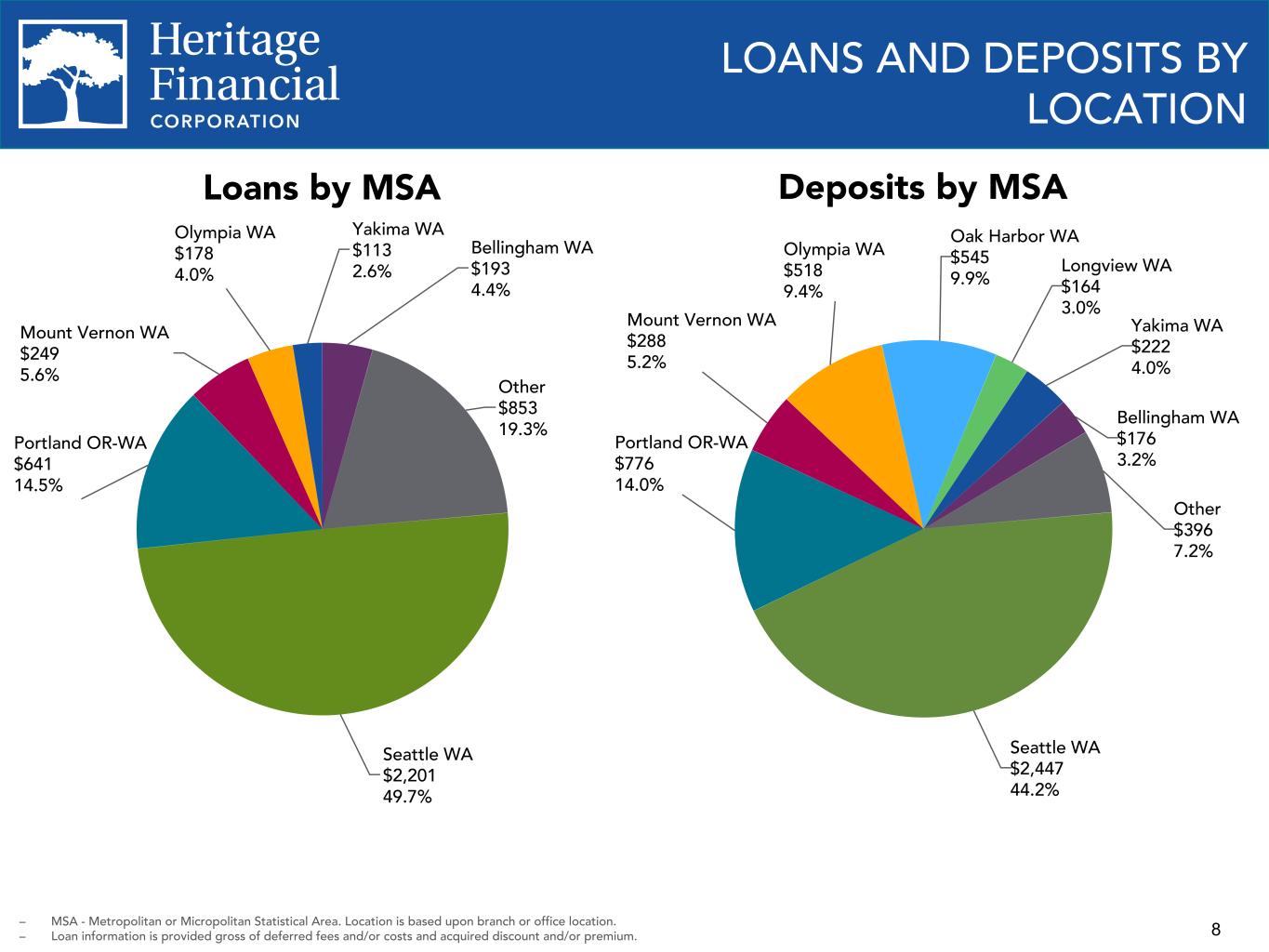 8 LOANS AND DEPOSITS BY LOCATION – MSA - Metropolitan or Micropolitan Statistical Area. Location is based upon branch or office location. – Loan information is provided gross of deferred fees and/or costs and acquired discount and/or premium. Loans by MSA Seattle WA $2,201 49.7% Portland OR-WA $641 14.5% Mount Vernon WA $249 5.6% Olympia WA $178 4.0% Yakima WA $113 2.6% Bellingham WA $193 4.4% Other $853 19.3% Deposits by MSA Seattle WA $2,447 44.2% Portland OR-WA $776 14.0% Mount Vernon WA $288 5.2% Olympia WA $518 9.4% Oak Harbor WA $545 9.9% Longview WA $164 3.0% Yakima WA $222 4.0% Bellingham WA $176 3.2% Other $396 7.2%