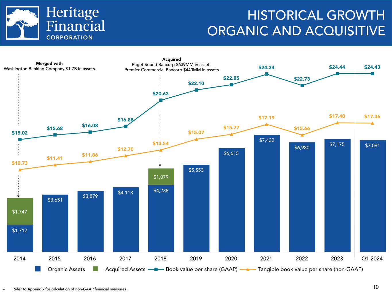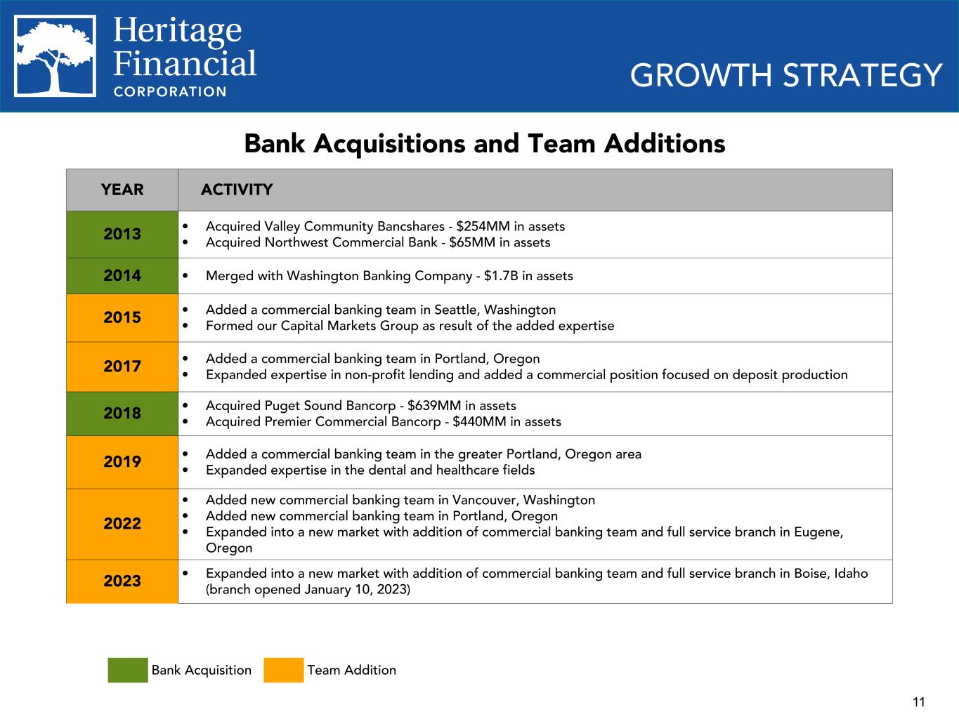 10 $1,712 $3,651 $3,879 $4,113 $4,238 $5,553 $6,615 $7,432 $6,980 $7,175 $7,091 $1,747 $1,079 $15.02 $15.68 $16.08 $16.88 $20.63 $22.10 $22.85 $24.34 $22.73 $24.44 $24.43 $10.73 $11.41 $11.86 $12.70 $13.54 $15.07 $15.77 $17.19 $15.66 $17.40 $17.36 Organic Assets Acquired Assets Book value per share (GAAP) Tangible book value per share (non-GAAP) 2014 2015 2016 2017 2018 2019 2020 2021 2022 2023 Q1 2024 Acquired Puget Sound Bancorp $639MM in assets Premier Commercial Bancorp $440MM in assets HISTORICAL GROWTH ORGANIC AND ACQUISITIVE Merged with Washington Banking Company $1.7B in assets – Refer to Appendix for calculation of non-GAAP financial measures.