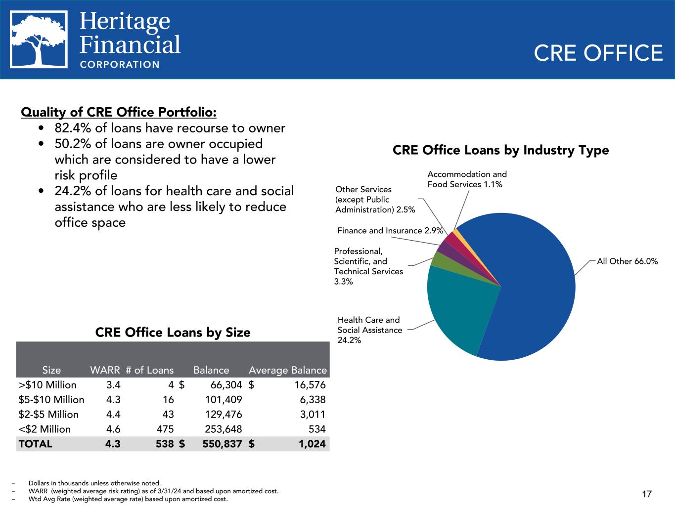 16 CHANGES IN LOANS RECEIVABLE $4,336 $102 $(39) $(33) $62 $4,428 Loans receivable at December 31, 2023 Loans originated Prepayments Maturities / Payoffs Net advances/ payments Loans receivable at March 31, 2024 $4,051 $484 $(197) $(122) $120 $4,336 Loans receivable at December 31, 2022 Loans originated Prepayments Payoffs Net advances/ payments Loans receivable at December 31, 2023 Change in loans - Q1 2024 Change in loans - 2023