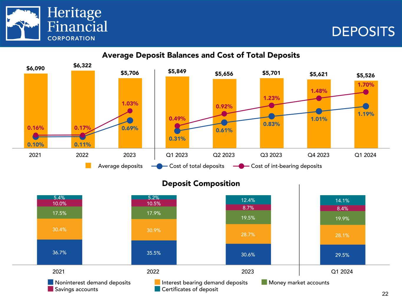 21 CRITICIZED LOANS AND NET CHARGE-OFF HISTORY Criticized Loans to Total Loans 3.63% 3.79% 6.50% 4.81% 3.34% 3.45% 2.61% 2.72% 3.71% 2.79% 2.28% 2.14% Heritage Peer Median 2018 2019 2020 2021 2022 2023 NCOs to Average Loans 0.06% 0.09% 0.07% 0.01% (0.03)% (0.01)% 0.12% 0.12% 0.09% 0.13% 0.03% 0.10% Heritage Peer Median 2018 2019 2020 2021 2022 2023 *Most current data available as of December 31, 2023 *Criticized loans includes loans graded Special Mention or worse *Peer Median is the median of 20 identified peer banks ranging in asset size from $4 billion to $15 billion. *NCOs - Net charge-offs (recoveries) Proactive Credit Management • Heritage proactively downgrades loans that are experiencing financial difficulty. This does not however, translate into higher charge- offs. • Criticized loans to total loans higher than peer median since 2018 • NCOs recognized during the same period were lower than peer median.