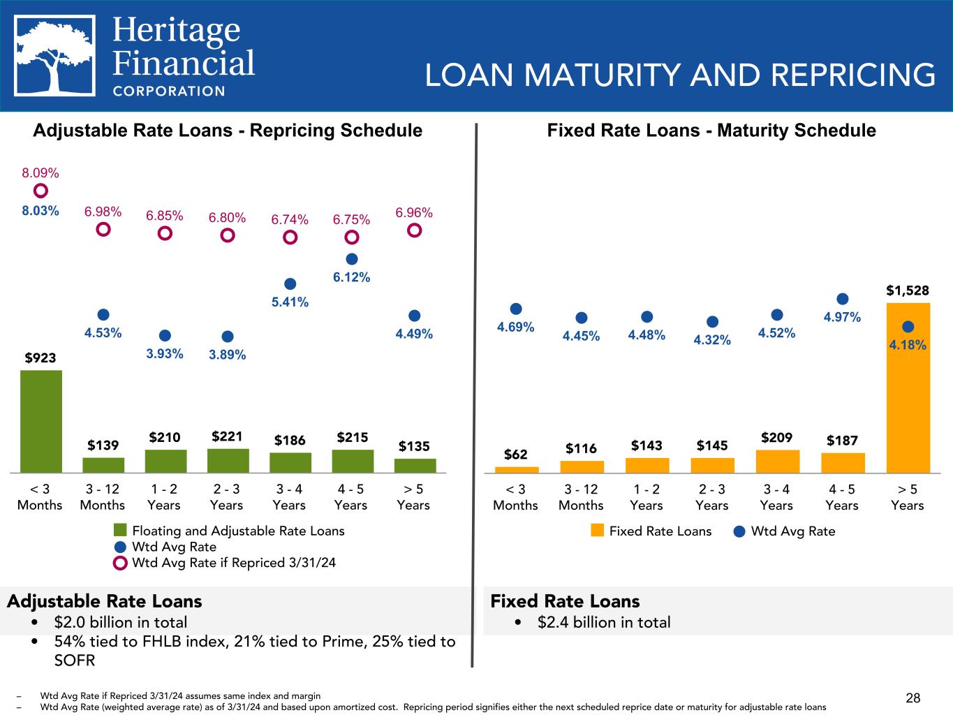 28 Adjustable Rate Loans - Repricing Schedule $923 $139 $210 $221 $186 $215 $135 8.03% 4.53% 3.93% 3.89% 5.41% 6.12% 4.49% 8.09% 6.98% 6.85% 6.80% 6.74% 6.75% 6.96% Floating and Adjustable Rate Loans Wtd Avg Rate Wtd Avg Rate if Repriced 3/31/24 < 3 Months 3 - 12 Months 1 - 2 Years 2 - 3 Years 3 - 4 Years 4 - 5 Years > 5 Years LOAN MATURITY AND REPRICING – Wtd Avg Rate if Repriced 3/31/24 assumes same index and margin – Wtd Avg Rate (weighted average rate) as of 3/31/24 and based upon amortized cost. Repricing period signifies either the next scheduled reprice date or maturity for adjustable rate loans Adjustable Rate Loans • $2.0 billion in total • 54% tied to FHLB index, 21% tied to Prime, 25% tied to SOFR Fixed Rate Loans - Maturity Schedule $62 $116 $143 $145 $209 $187 $1,528 4.69% 4.45% 4.48% 4.32% 4.52% 4.97% 4.18% Fixed Rate Loans Wtd Avg Rate < 3 Months 3 - 12 Months 1 - 2 Years 2 - 3 Years 3 - 4 Years 4 - 5 Years > 5 Years Fixed Rate Loans • $2.4 billion in total