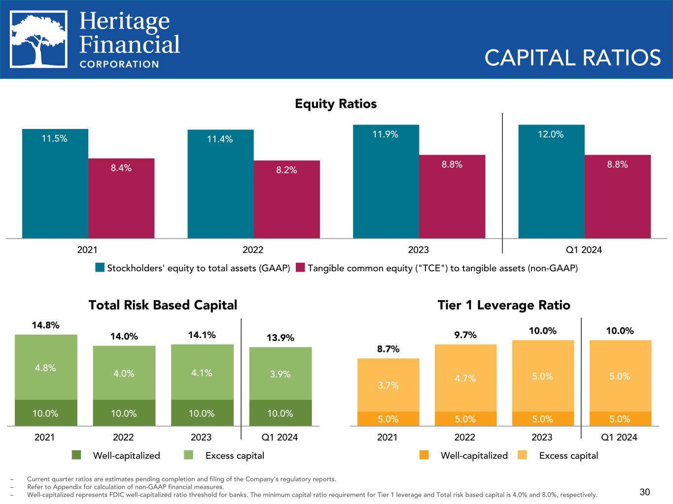 29 $98.0 $81.9 $61.8 $91.1 $98.0 $77.2 Net income (GAAP) PTPP income (non-GAAP) 2021 2022 2023 Q1 2023 Q2 2023 Q3 2023 Q4 2023 Q1 2024 $20.5 $16.8 $18.2 $6.2 $5.7 $26.5 $21.8 $20.9 $8.0 $8.3 PROFITABILITY TRENDS ROAE (GAAP) and ROATCE (non-GAAP) Noninterest Expense/Avg. Assets ROAA (GAAP) and PTPP ROAA (non-GAAP) 1.38% 1.12% 0.86% 1.17% 0.95% 1.00% 0.35% 0.33% 1.28% 1.34% 1.08% 1.52% 1.22% 1.15% 0.44% 0.47% ROAA (GAAP) PTPP ROAA (non-GAAP) 2021 2022 2023 Q1 2023 Q2 2023 Q3 2023 Q4 2023 Q1 2024 Net Income (GAAP) and PTPP Income (non- GAAP), in millions 17.05% 14.94% 11.15% 15.05% 12.04% 12.90% 4.69% 4.07% 11.64% 10.08% 7.55% 10.21% 8.19% 8.80% 3.04% 2.73% ROAE (GAAP) ROATCE (non-GAAP) 2021 2022 2023 Q1 2023 Q2 2023 Q3 2023 Q4 2023 Q1 2024 2.09% 2.06% 2.33% 2.39% 2.32% 2.25% 2.37% 2.29% 2021 2022 2023 Q1 2023 Q2 2023 Q3 2023 Q4 2023 Q1 2024 – Refer to Appendix for calculation of non-GAAP financial measures – ROAA - Return on average assets – PTPP - Pre-tax, pre-provision – ROAE - Return on average equity – ROATCE - Return on average tangible common equity