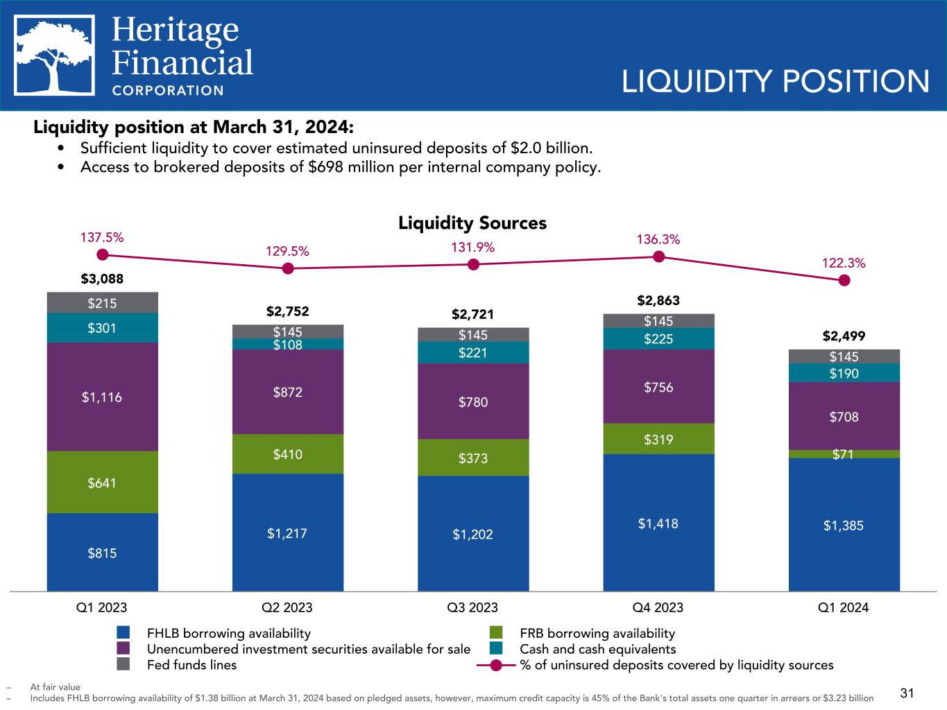 30 Total Risk Based Capital 14.8% 14.0% 14.1% 13.9% 10.0% 10.0% 10.0% 10.0% 4.8% 4.0% 4.1% 3.9% Well-capitalized Excess capital 2021 2022 2023 Q1 2024 – Current quarter ratios are estimates pending completion and filing of the Company's regulatory reports. – Refer to Appendix for calculation of non-GAAP financial measures. – Well-capitalized represents FDIC well-capitalized ratio threshold for banks. The minimum capital ratio requirement for Tier 1 leverage and Total risk based capital is 4.0% and 8.0%, respectively. Tier 1 Leverage Ratio 8.7% 9.7% 10.0% 10.0% 5.0% 5.0% 5.0% 5.0% 3.7% 4.7% 5.0% 5.0% Well-capitalized Excess capital 2021 2022 2023 Q1 2024 CAPITAL RATIOS Equity Ratios 11.5% 11.4% 11.9% 12.0% 8.4% 8.2% 8.8% 8.8% Stockholders' equity to total assets (GAAP) Tangible common equity ("TCE") to tangible assets (non-GAAP) 2021 2022 2023 Q1 2024