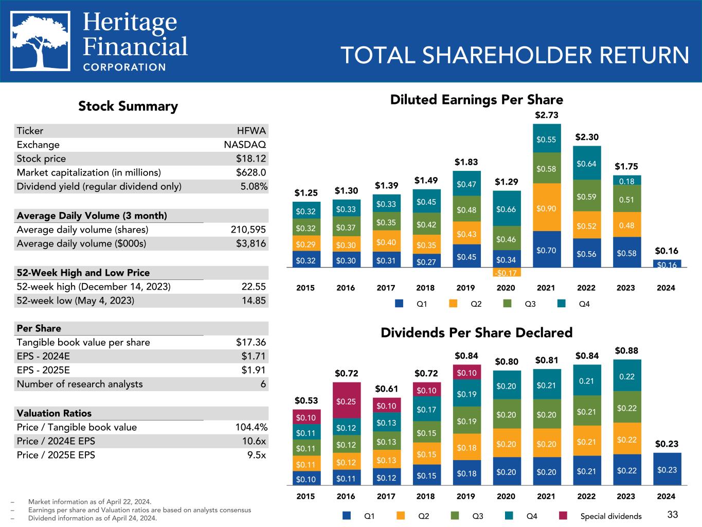33 TOTAL SHAREHOLDER RETURN Stock Summary Ticker HFWA Exchange NASDAQ Stock price $18.12 Market capitalization (in millions) $628.0 Dividend yield (regular dividend only) 5.08% Average Daily Volume (3 month) Average daily volume (shares) 210,595 Average daily volume ($000s) $3,816 52-Week High and Low Price 52-week high (December 14, 2023) 22.55 52-week low (May 4, 2023) 14.85 Per Share Tangible book value per share $17.36 EPS - 2024E $1.71 EPS - 2025E $1.91 Number of research analysts 6 Valuation Ratios Price / Tangible book value 104.4% Price / 2024E EPS 10.6x Price / 2025E EPS 9.5x Dividends Per Share Declared $0.53 $0.72 $0.61 $0.72 $0.84 $0.80 $0.81 $0.84 $0.88 $0.23 $0.10 $0.11 $0.12 $0.15 $0.18 $0.20 $0.20 $0.21 $0.22 $0.23 $0.11 $0.12 $0.13 $0.15 $0.18 $0.20 $0.20 $0.21 $0.22 $0.11 $0.12 $0.13 $0.15 $0.19 $0.20 $0.20 $0.21 $0.22 $0.11 $0.12 $0.13 $0.17 $0.19 $0.20 $0.21 0.21 0.22 $0.10 $0.25 $0.10 $0.10 $0.10 Q1 Q2 Q3 Q4 Special dividends 2015 2016 2017 2018 2019 2020 2021 2022 2023 2024 Diluted Earnings Per Share – Market information as of April 22, 2024. – Earnings per share and Valuation ratios are based on analysts consensus – Dividend information as of April 24, 2024. $1.25 $1.30 $1.39 $1.49 $1.83 $1.29 $2.73 $2.30 $1.75 $0.16 $0.32 $0.30 $0.31 $0.27 $0.45 $0.34 $0.70 $0.56 $0.58 $0.16 $0.29 $0.30 $0.40 $0.35 $0.43 -$0.17 $0.90 $0.52 0.48$0.32 $0.37 $0.35 $0.42 $0.48 $0.46 $0.58 $0.59 0.51 $0.32 $0.33 $0.33 $0.45 $0.47 $0.66 $0.55 $0.64 0.18 Q1 Q2 Q3 Q4 2015 2016 2017 2018 2019 2020 2021 2022 2023 2024