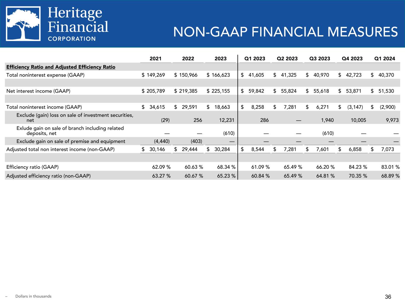 35 NON-GAAP FINANCIAL MEASURES 2021 2022 2023 Q1 2023 Q2 2023 Q3 2023 Q4 2023 Q1 2024 PTPP Income and PTPP ROAA: Net income (GAAP) $ 98,035 $ 81,875 $ 61,755 $ 20,457 $ 16,846 $ 18,219 $ 6,233 $ 5,748 Exclude income tax expense 22,472 17,561 11,160 4,213 3,025 3,578 344 1,120 Exclude provision for (reversal of provision for) credit losses (29,372) (1,426) 4,280 1,825 1,909 (878) 1,424 1,392 PTPP income (non-GAAP) $ 91,135 $ 98,010 $ 77,195 $ 26,495 $ 21,780 $ 20,919 $ 8,001 $ 8,260 Average total assets $ 7,126,250 $ 7,321,455 $ 7,140,024 $ 7,061,959 $ 7,142,865 $7,212,732 $7,140,876 $7,092,452 ROAA, annualized (GAAP) 1.38 % 1.12 % 0.86 % 1.17 % 0.95 % 1.00 % 0.35 % 0.33 % PTPP ROAA, annualized (non-GAAP) 1.28 % 1.34 % 1.08 % 1.52 % 1.22 % 1.15 % 0.44 % 0.47 % ROATCE: Net income (GAAP) $ 98,035 $ 81,875 $ 61,755 $ 20,457 $ 16,846 $ 18,219 $ 6,233 $ 5,748 Add amortization of intangible assets 3,111 2,750 2,434 623 623 595 593 421 Exclude tax effect of adjustment (653) (578) (511) (131) (131) (125) (125) (88) Tangible net income (non-GAAP) $ 100,493 $ 84,047 $ 63,678 $ 20,949 $ 17,338 $ 18,689 $ 6,701 $ 6,081 Average stockholders' equity (GAAP) $ 842,067 $ 811,942 $ 818,042 $ 812,500 $ 824,742 $ 821,494 $ 813,383 $ 846,947 Exclude average intangible assets (252,540) (249,566) (246,965) (247,922) (247,278) (246,663) (246,022) (245,536) Average tangible common stockholders' equity (non- GAAP) $ 589,527 $ 562,376 $ 571,077 $ 564,578 $ 577,464 $ 574,831 $ 567,361 $ 601,411 ROAE, annualized (GAAP) 11.64 % 10.08 % 7.55 % 10.21 % 8.19 % 8.80 % 3.04 % 2.73 % ROATCE, annualized (non-GAAP) 17.05 % 14.94 % 11.15 % 15.05 % 12.04 % 12.90 % 4.69 % 4.07 % – Dollars in thousands – ROAA - Return on average assets – PTPP - Pre-tax, pre-provision – ROATCE - Return on average tangible common equity