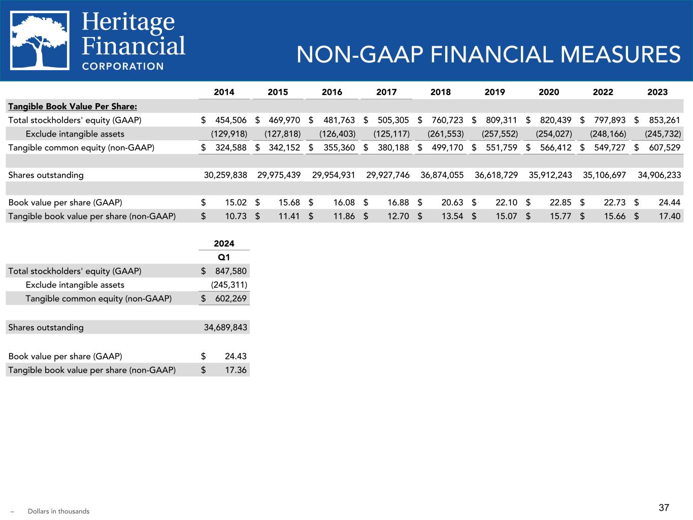 36 NON-GAAP FINANCIAL MEASURES 2021 2022 2023 Q1 2023 Q2 2023 Q3 2023 Q4 2023 Q1 2024 Efficiency Ratio and Adjusted Efficiency Ratio Total noninterest expense (GAAP) $ 149,269 $ 150,966 $ 166,623 $ 41,605 $ 41,325 $ 40,970 $ 42,723 $ 40,370 Net interest income (GAAP) $ 205,789 $ 219,385 $ 225,155 $ 59,842 $ 55,824 $ 55,618 $ 53,871 $ 51,530 Total noninterest income (GAAP) $ 34,615 $ 29,591 $ 18,663 $ 8,258 $ 7,281 $ 6,271 $ (3,147) $ (2,900) Exclude (gain) loss on sale of investment securities, net (29) 256 12,231 286 — 1,940 10,005 9,973 Exlude gain on sale of branch including related deposits, net — — (610) — — (610) — — Exclude gain on sale of premise and equipment (4,440) (403) — — — — — — Adjusted total non interest income (non-GAAP) $ 30,146 $ 29,444 $ 30,284 $ 8,544 $ 7,281 $ 7,601 $ 6,858 $ 7,073 Efficiency ratio (GAAP) 62.09 % 60.63 % 68.34 % 61.09 % 65.49 % 66.20 % 84.23 % 83.01 % Adjusted efficiency ratio (non-GAAP) 63.27 % 60.67 % 65.23 % 60.84 % 65.49 % 64.81 % 70.35 % 68.89 % – Dollars in thousands