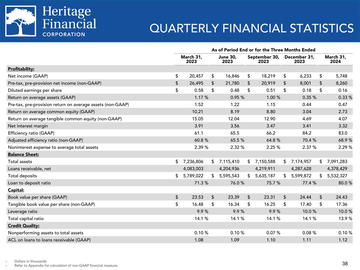 37 2014 2015 2016 2017 2018 2019 2020 2022 2023 Tangible Book Value Per Share: Total stockholders' equity (GAAP) $ 454,506 $ 469,970 $ 481,763 $ 505,305 $ 760,723 $ 809,311 $ 820,439 $ 797,893 $ 853,261 Exclude intangible assets (129,918) (127,818) (126,403) (125,117) (261,553) (257,552) (254,027) (248,166) (245,732) Tangible common equity (non-GAAP) $ 324,588 $ 342,152 $ 355,360 $ 380,188 $ 499,170 $ 551,759 $ 566,412 $ 549,727 $ 607,529 Shares outstanding 30,259,838 29,975,439 29,954,931 29,927,746 36,874,055 36,618,729 35,912,243 35,106,697 34,906,233 Book value per share (GAAP) $ 15.02 $ 15.68 $ 16.08 $ 16.88 $ 20.63 $ 22.10 $ 22.85 $ 22.73 $ 24.44 Tangible book value per share (non-GAAP) $ 10.73 $ 11.41 $ 11.86 $ 12.70 $ 13.54 $ 15.07 $ 15.77 $ 15.66 $ 17.40 Moved to 2nd slide 2024 Q1 Total stockholders' equity (GAAP) $ 847,580 Exclude intangible assets (245,311) Tangible common equity (non-GAAP) $ 602,269 Shares outstanding 34,689,843 Book value per share (GAAP) $ 24.43 Tangible book value per share (non-GAAP) $ 17.36 NON-GAAP FINANCIAL MEASURES – Dollars in thousands
