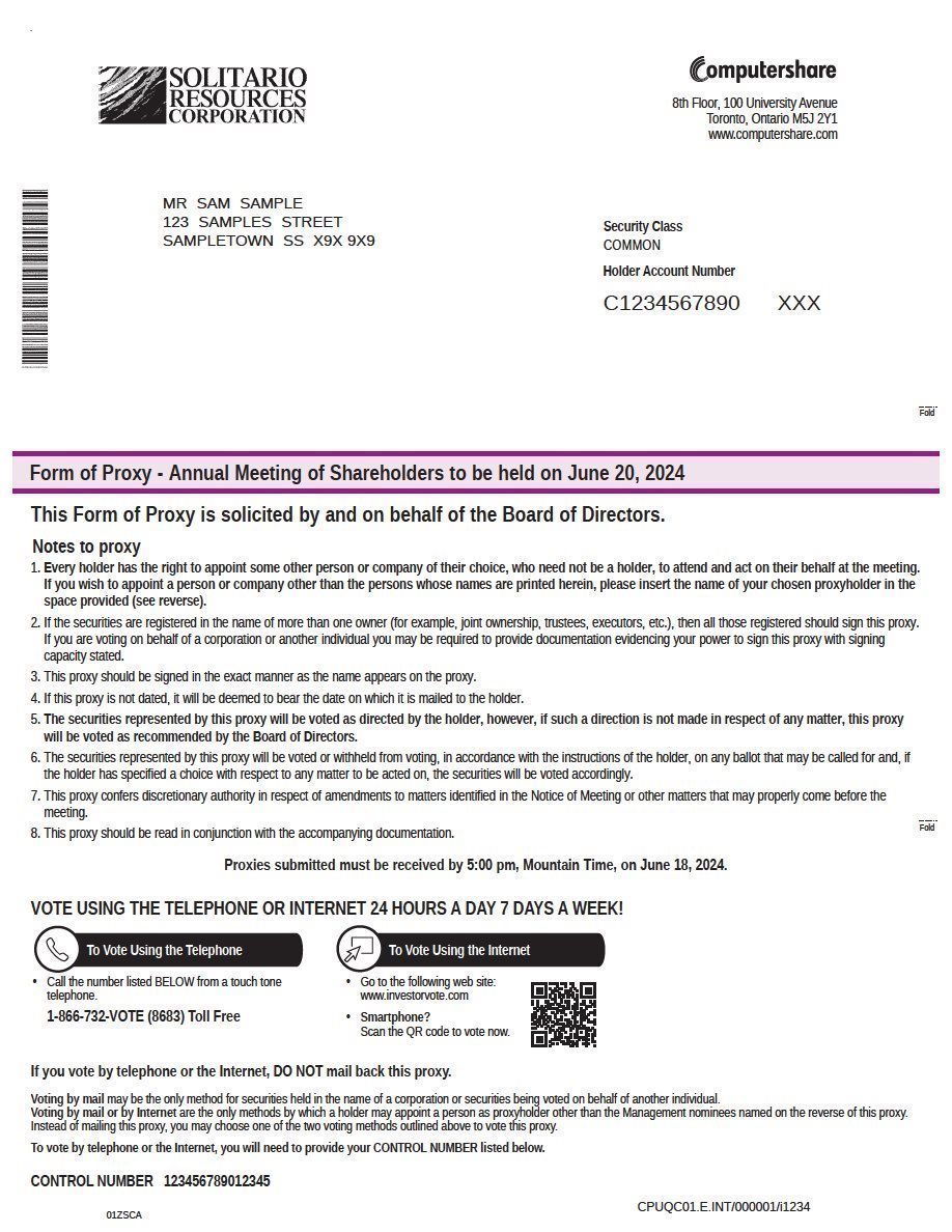 This booklet is a Proxy Statement. It provides you with information you should review before voting on the proposals discussed above, and in the Notice of Annual Meeting of Shareholders. You are receiving these proxy materials because you have the right to vote at the Annual Meeting. Such proxy materials are also available on-line at www.solitarioxr.com.