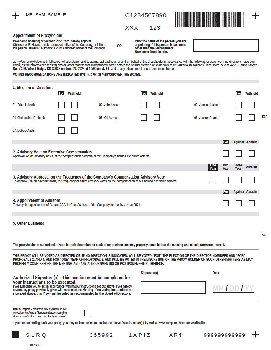 You are invited to attend the annual meeting (the “Annual Meeting”) of shareholders (the “Shareholders”) of Solitario Resources Corp. (the “Company” or “Solitario”). The Annual Meeting will be held at 4251 Kipling Street, Suite 390, Wheat Ridge, CO 80033, on Thursday, June 20, 2024 at 10:00 a.m., Mountain Daylight Time. At the Annual Meeting, you will be asked to consider and vote upon the following proposals: