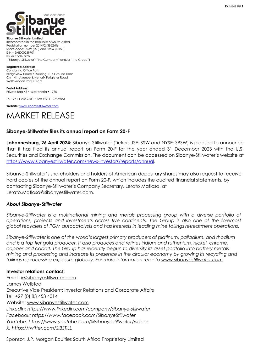 Sibanye Stillwater Limited Incorporated in the Republic of South Africa Registration number 2014/243852/06 Share codes: SSW (JSE) and SBSW (NYSE) ISIN – ZAE000259701 Issuer code: SSW (“Sibanye-Stillwater”,”the Company” and/or “the Group”) Registered Address: Constantia Office Park Bridgeview House • Building 11 • Ground Floor Cnr 14th Avenue & Hendrik Potgieter Road Weltevreden Park • 1709 Postal Address: Private Bag X5 • Westonaria • 1780 Tel +27 11 278 9600 • Fax +27 11 278 9863 Website: www.sibanyestillwater.com MARKET RELEASE Sibanye-Stillwater files its annual report on Form 20-F Johannesburg, 26 April 2024: Sibanye-Stillwater (Tickers JSE: SSW and NYSE: SBSW) is pleased to announce that it has filed its annual report on Form 20-F for the year ended 31 December 2023 with the U.S. Securities and Exchange Commission. The document can be accessed on Sibanye-Stillwater’s website at https://www.sibanyestillwater.com/news-investors/reports/annual. Sibanye-Stillwater’s shareholders and holders of American depositary shares may also request to receive hard copies of the annual report on Form 20-F, which includes the audited financial statements, by contacting Sibanye-Stillwater’s Company Secretary, Lerato Matlosa, at Lerato.Matlosa@sibanyestillwater.com. About Sibanye-Stillwater Sibanye-Stillwater is a multinational mining and metals processing group with a diverse portfolio of operations, projects and investments across five continents. The Group is also one of the foremost global recyclers of PGM autocatalysts and has interests in leading mine tailings retreatment operations. Sibanye-Stillwater is one of the world’s largest primary producers of platinum, palladium, and rhodium and is a top tier gold producer. It also produces and refines iridium and ruthenium, nickel, chrome, copper and cobalt. The Group has recently begun to diversify its asset portfolio into battery metals mining and processing and increase its presence in the circular economy by growing its recycling and tailings reprocessing exposure globally. For more information refer to www.sibanyestillwater.com. Investor relations contact: Email: ir@sibanyestillwater.com James Wellsted Executive Vice President: Investor Relations and Corporate Affairs Tel: +27 (0) 83 453 4014 Website: www.sibanyestillwater.com LinkedIn: https://www.linkedin.com/company/sibanye-stillwater Facebook: https://www.facebook.com/SibanyeStillwater YouTube: https://www.youtube.com/@sibanyestillwater/videos X: https://twitter.com/SIBSTILL Sponsor: J.P. Morgan Equities South Africa Proprietary Limited Exhibit 99.1