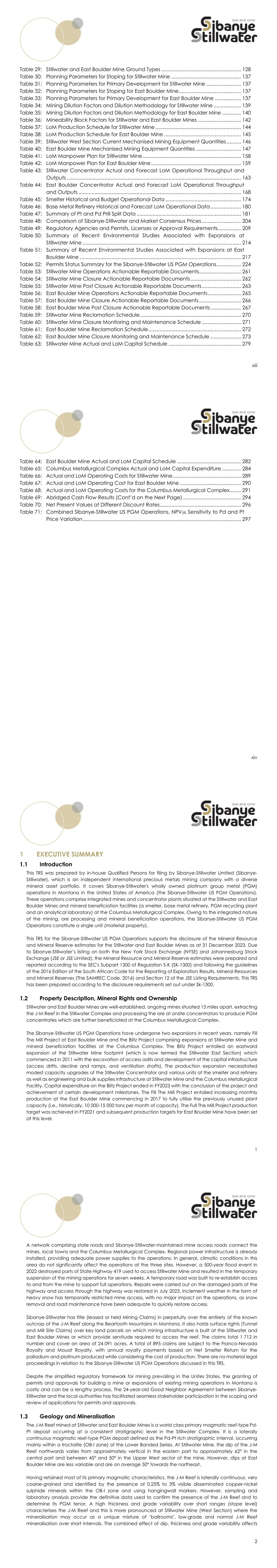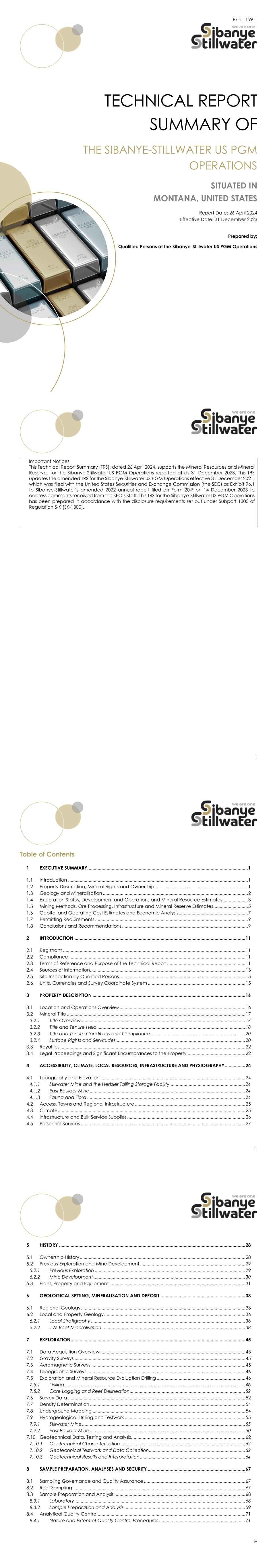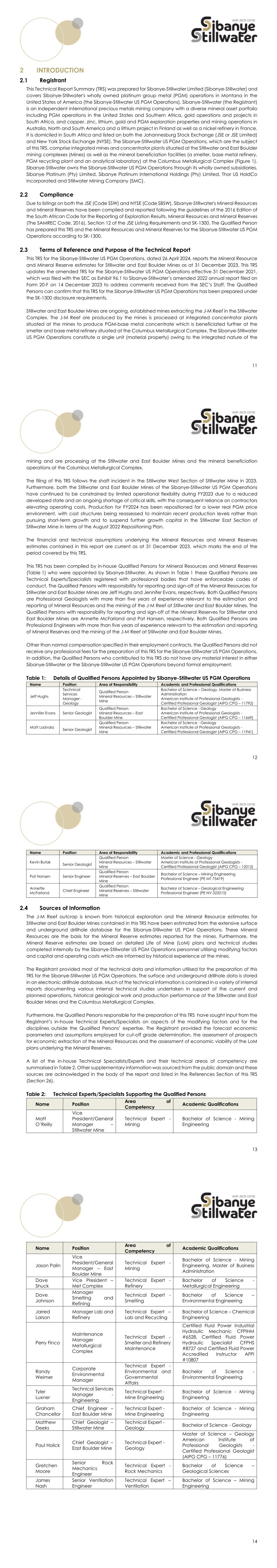 11 INTRODUCTION Registrant This Technical Report Summary (TRS) was prepared for Sibanye-Stillwater Limited (Sibanye-Stillwater) and covers Sibanye-Stillwater's wholly owned platinum group metal (PGM) operations in Montana in the United States of America (the Sibanye-Stillwater US PGM Operations). Sibanye-Stillwater (the Registrant) is an independent international precious metals mining company with a diverse mineral asset portfolio including PGM operations in the United States and Southern Africa, gold operations and projects in South Africa, and copper, zinc, lithium, gold and PGM exploration properties and mining operations in Australia, North and South America and a lithium project in Finland as well as a nickel refinery in France. It is domiciled in South Africa and listed on both the Johannesburg Stock Exchange (JSE or JSE Limited) and New York Stock Exchange (NYSE). The Sibanye-Stillwater US PGM Operations, which are the subject of this TRS, comprise integrated mines and concentrator plants situated at the Stillwater and East Boulder mining complexes (Mines) as well as the mineral beneficiation facilities (a smelter, base metal refinery, PGM recycling plant and an analytical laboratory) at the Columbus Metallurgical Complex (Figure 1). Sibanye-Stillwater owns the Sibanye-Stillwater US PGM Operations through its wholly owned subsidiaries, Sibanye Platinum (Pty) Limited, Sibanye Platinum International Holdings (Pty) Limited, Thor US HoldCo Incorporated and Stillwater Mining Company (SMC). Compliance Due to listings on both the JSE (Code SSW) and NYSE (Code SBSW), Sibanye-Stillwater's Mineral Resources and Mineral Reserves have been compiled and reported following the guidelines of the 2016 Edition of the South African Code for the Reporting of Exploration Results, Mineral Resources and Mineral Reserves (The SAMREC Code, 2016), Section 12 of the JSE Listing Requirements and SK-1300. The Qualified Person has prepared this TRS and the Mineral Resources and Mineral Reserves for the Sibanye-Stillwater US PGM Operations according to SK-1300. Terms of Reference and Purpose of the Technical Report This TRS for the Sibanye-Stillwater US PGM Operations, dated 26 April 2024, reports the Mineral Resource and Mineral Reserve estimates for Stillwater and East Boulder Mines as at 31 December 2023. This TRS updates the amended TRS for the Sibanye-Stillwater US PGM Operations effective 31 December 2021, which was filed with the SEC as Exhibit 96.1 to Sibanye-Stillwater’s amended 2022 annual report filed on Form 20-F on 14 December 2023 to address comments received from the SEC’s Staff. The Qualified Persons can confirm that this TRS for the Sibanye-Stillwater US PGM Operations has been prepared under the SK-1300 disclosure requirements. Stillwater and East Boulder Mines are ongoing, established mines extracting the J-M Reef in the Stillwater Complex. The J-M Reef ore produced by the mines is processed at integrated concentrator plants situated at the mines to produce PGM-base metal concentrate which is beneficiated further at the smelter and base metal refinery situated at the Columbus Metallurgical Complex. The Sibanye-Stillwater US PGM Operations constitute a single unit (material property) owing to the integrated nature of the 12 mining and ore processing at the Stillwater and East Boulder Mines and the mineral beneficiation operations at the Columbus Metallurgical Complex. The filing of this TRS follows the shaft incident in the Stillwater West Section of Stillwater Mine in 2023. Furthermore, both the Stillwater and East Boulder Mines of the Sibanye-Stillwater US PGM Operations have continued to be constrained by limited operational flexibility during FY2023 due to a reduced developed state and an ongoing shortage of critical skills, with the consequent reliance on contractors elevating operating costs. Production for FY2024 has been repositioned for a lower real PGM price environment, with cost structures being reassessed to maintain recent production levels rather than pursuing short-term growth and to suspend further growth capital in the Stillwater East Section of Stillwater Mine in terms of the August 2022 Repositioning Plan. The financial and technical assumptions underlying the Mineral Resources and Mineral Reserves estimates contained in this report are current as at 31 December 2023, which marks the end of the period covered by this TRS. This TRS has been compiled by in-house Qualified Persons for Mineral Resources and Mineral Reserves (Table 1) who were appointed by Sibanye-Stillwater. As shown in Table 1 these Qualified Persons are Technical Experts/Specialists registered with professional bodies that have enforceable codes of conduct. The Qualified Persons with responsibility for reporting and sign-off of the Mineral Resources for Stillwater and East Boulder Mines are Jeff Hughs and Jennifer Evans, respectively. Both Qualified Persons are Professional Geologists with more than five years of experience relevant to the estimation and reporting of Mineral Resources and the mining of the J-M Reef at Stillwater and East Boulder Mines. The Qualified Persons with responsibility for reporting and sign-off of the Mineral Reserves for Stillwater and East Boulder Mines are Annette McFarland and Pat Hansen, respectively. Both Qualified Persons are Professional Engineers with more than five years of experience relevant to the estimation and reporting of Mineral Reserves and the mining of the J-M Reef at Stillwater and East Boulder Mines. Other than normal compensation specified in their employment contracts, the Qualified Persons did not receive any professional fees for the preparation of this TRS for the Sibanye-Stillwater US PGM Operations. In addition, the Qualified Persons who contributed to this TRS do not have any material interest in either Sibanye-Stillwater or the Sibanye-Stillwater US PGM Operations beyond formal employment. Table 1: Details of Qualified Persons Appointed by Sibanye