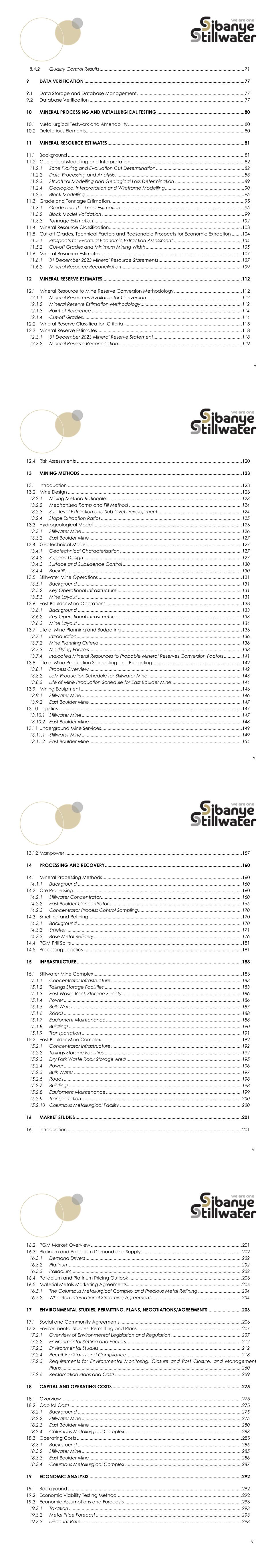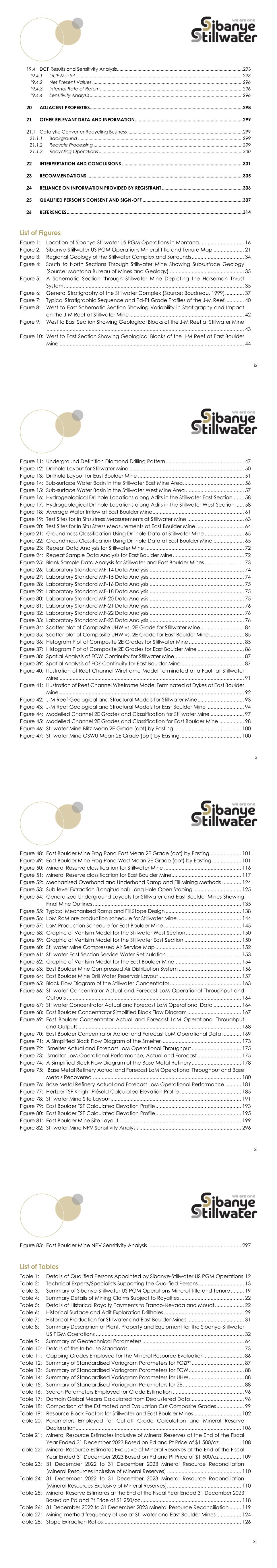 v Quality Control Results ................................................................................................................. 71 DATA VERIFICATION ............................................................................................................................. 77 Data Storage and Database Management .................................................................................... 77 Database Verification ......................................................................................................................... 77 MINERAL PROCESSING AND METALLURGICAL TESTING .................................................................... 80 Metallurgical Testwork and Amenability ........................................................................................... 80 Deleterious Elements............................................................................................................................ 80 MINERAL RESOURCE ESTIMATES ........................................................................................................... 81 Background .......................................................................................................................................... 81 Geological Modelling and Interpretation ......................................................................................... 82 Zone Picking and Evaluation Cut Determination ..................................................................... 82 Data Processing and Analysis ..................................................................................................... 83 Structural Modelling and Geological Loss Determination ...................................................... 89 Geological Interpretation and Wireframe Modelling .............................................................. 90 Block Modelling ............................................................................................................................ 95 Grade and Tonnage Estimation ......................................................................................................... 95 Grade and Thickness Estimation................................................................................................. 95 Block Model Validation ............................................................................................................... 99 Tonnage Estimation .................................................................................................................... 102 Mineral Resource Classification........................................................................................................ 103 Cut-off Grades, Technical Factors and Reasonable Prospects for Economic Extraction ........ 104 Prospects for Eventual Economic Extraction Assessment ..................................................... 104 Cut-off Grades and Minimum Mining Width ........................................................................... 105 Mineral Resource Estimates .............................................................................................................. 107 31 December 2023 Mineral Resource Statements ................................................................. 107 Mineral Resource Reconciliation .............................................................................................. 109 MINERAL RESERVE ESTIMATES ............................................................................................................. 112 Mineral Resource to Mine Reserve Conversion Methodology ..................................................... 112 Mineral Resources Available for Conversion .......................................................................... 112 Mineral Reserve Estimation Methodology ............................................................................... 112 Point of Reference ..................................................................................................................... 114 Cut-off Grades ............................................................................................................................ 114 Mineral Reserve Classification Criteria ............................................................................................ 115 Mineral Reserve Estimates ................................................................................................................. 118 31 December 2023 Mineral Reserve Statement ..................................................................... 118 Mineral Reserve Reconciliation ................................................................................................ 119 vi Risk Assessments ................................................................................................................................. 120 MINING METHODS .............................................................................................................................. 123 Introduction ........................................................................................................................................ 123 Mine Design ........................................................................................................................................ 123 Mining Method Rationale .......................................................................................................... 123 Mechanised Ramp and Fill Method ........................................................................................ 124 Sub-level Extraction and Sub-level Development.................................................................. 124 Stope Extraction Ratios .............................................................................................................. 125 Hydrogeological Model .................................................................................................................... 126 Stillw