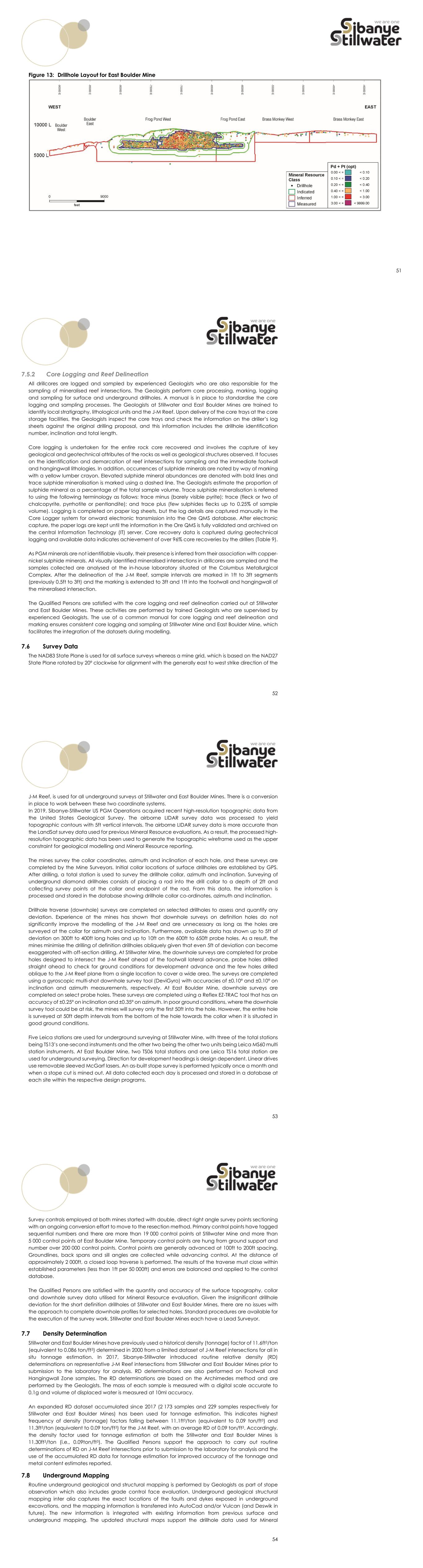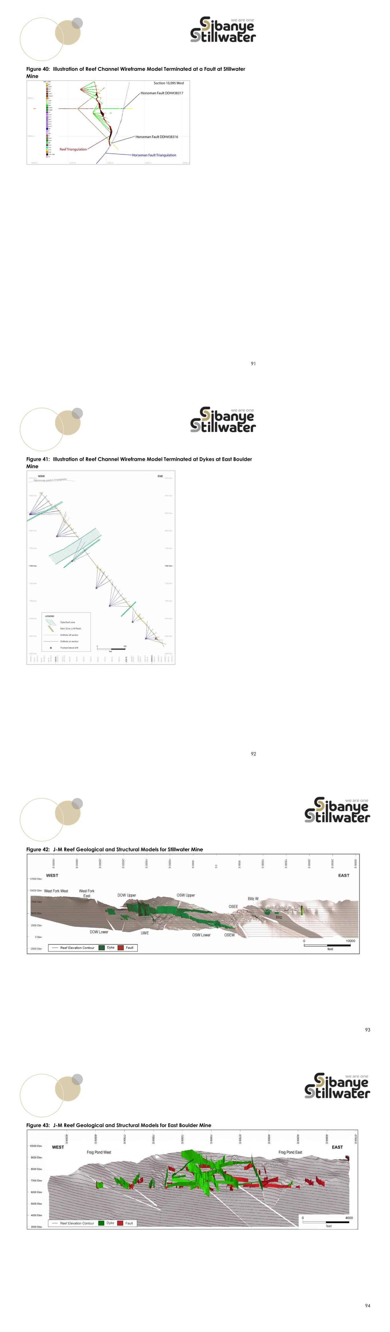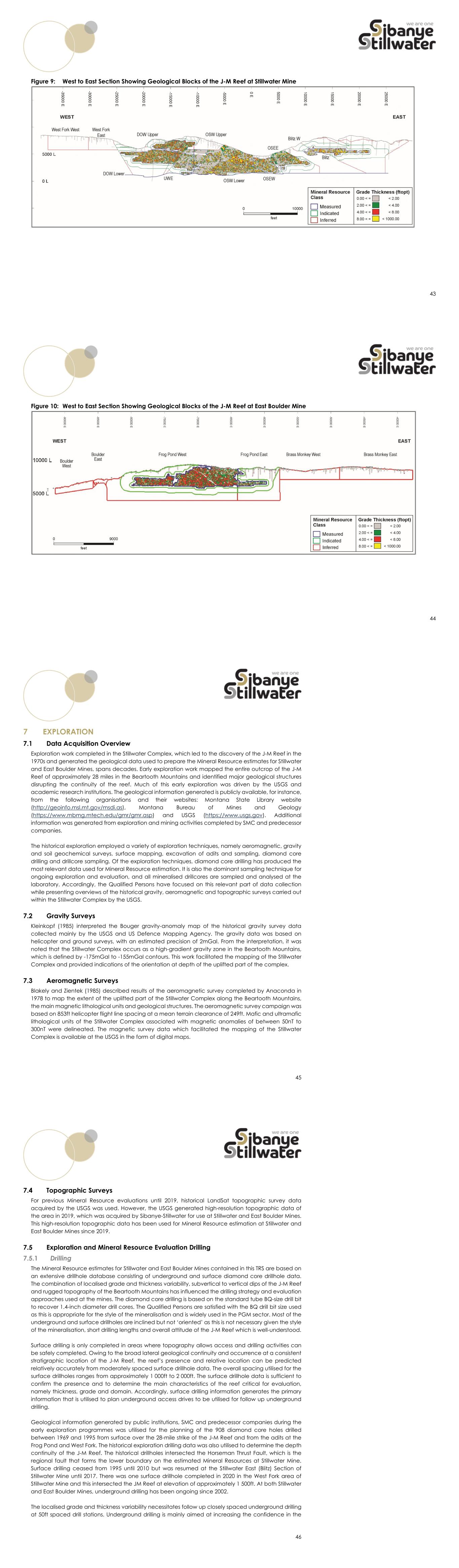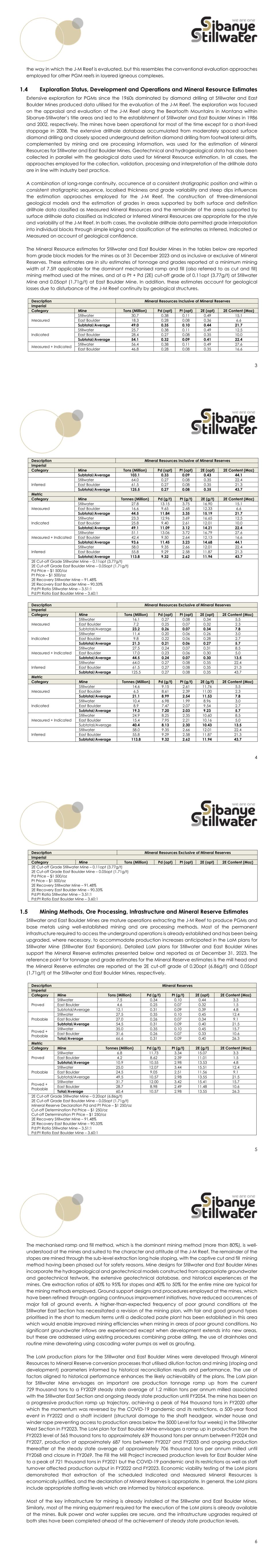 3 the way in which the J-M Reef is evaluated, but this resembles the conventional evaluation approaches employed for other PGM reefs in layered igneous complexes. Exploration Status, Development and Operations and Mineral Resource Estimates Extensive exploration for PGMs since the 1960s dominated by diamond drilling at Stillwater and East Boulder Mines produced data utilised for the evaluation of the J-M Reef. The exploration was focused on the appraisal and evaluation of the J-M Reef along the Beartooth Mountains in Montana within Sibanye-Stillwater’s title areas and led to the establishment of Stillwater and East Boulder Mines in 1986 and 2002, respectively. The mines have been operational for most of the time except for a short-lived stoppage in 2008. The extensive drillhole database accumulated from moderately spaced surface diamond drilling and closely spaced underground definition diamond drilling from footwall lateral drifts, complemented by mining and ore processing information, was used for the estimation of Mineral Resources for Stillwater and East Boulder Mines. Geotechnical and hydrogeological data has also been collected in parallel with the geological data used for Mineral Resource estimation. In all cases, the approaches employed for the collection, validation, processing and interpretation of the drillhole data are in line with industry best practice. A combination of long-range continuity, occurrence at a consistent stratigraphic position and within a consistent stratigraphic sequence, localised thickness and grade variability and steep dips influences the estimation approaches employed for the J-M Reef. The construction of three-dimensional geological models and the estimation of grades in areas supported by both surface and definition drillhole data classified as Measured Mineral Resources and the remainder of the areas supported by surface drillhole data classified as Indicated or Inferred Mineral Resources are appropriate for the style and variability of the J-M Reef. In both cases, the available drillhole data permitted grade interpolation into individual blocks through simple kriging and classification of the estimates as Inferred, Indicated or Measured on account of geological confidence. The Mineral Resource estimates for Stillwater and East Boulder Mines in the tables below are reported from grade block models for the mines as at 31 December 2023 and as inclusive or exclusive of Mineral Reserves. These estimates are in situ estimates of tonnage and grades reported at a minimum mining width of 7.5ft applicable for the dominant mechanised ramp and fill (also referred to as cut and fill) mining method used at the mines, and at a Pt + Pd (2E) cut-off grade of 0.11opt (3.77g/t) at Stillwater Mine and 0.05opt (1.71g/t) at East Boulder Mine. In addition, these estimates account for geological losses due to disturbance of the J-M Reef continuity by geological structures. Description Mineral Resources Inclusive of Mineral Reserves Imperial Category Mine Tons (Million) Pd (opt) Pt (opt) 2E (opt) 2E Content (Moz) Measured Stillwater 30.7 0.38 0.11 0.49 15.1 East Boulder 18.3 0.28 0.08 0.36 6.6 Subtotal/Average 49.0 0.35 0.10 0.44 21.7 Indicated Stillwater 25.7 0.38 0.11 0.49 12.5 East Boulder 28.4 0.27 0.08 0.35 10.0 Subtotal/Average 54.1 0.32 0.09 0.41 22.4 Measured + Indicated Stillwater 56.4 0.38 0.11 0.49 27.6 East Boulder 46.8 0.28 0.08 0.35 16.6 4 Description Mineral Resources Inclusive of Mineral Reserves Imperial Category Mine Tons (Million) Pd (opt) Pt (opt) 2E (opt) 2E Content (Moz) Subtotal/Average 103.1 0.33 0.09 0.43 44.1 Inferred Stillwater 64.0 0.27 0.08 0.35 22.4 East Boulder 61.5 0.27 0.08 0.35 21.3 Subtotal/Average 125.5 0.27 0.08 0.35 43.7 Metric Category Mine Tonnes (Million) Pd (g/t) Pt (g/t) 2E (g/t) 2E Content (Moz) Measured Stillwater 27.8 13.15 3.75 16.90 15.1 East Boulder 16.6 9.65 2.68 12.33 6.6 Subtotal/Average 44.5 11.84 3.35 15.19 21.7 Indicated Stillwater 23.3 12.96 3.69 16.65 12.5 East Boulder 25.8 9.40 2.61 12.01 10.0 Subtotal/Average 49.1 11.09 3.12 14.21 22.4 Measured + Indicated Stillwater 51.1 13.06 3.72 16.79 27.6 East Boulder 42.4 9.50 2.64 12.13 16.6 Subtotal/Average 93.6 11.45 3.23 14.68 44.1 Inferred Stillwater 58.0 9.35 2.66 12.01 22.4 East Boulder 55.8 9.29 2.58 11.87 21.3 Subtotal/Average 113.8 9.32 2.62 11.94 43.7 2E Cut-off Grade Stillwater Mine – 0.11opt (3.77g/t) 2E Cut-off Grade East Boulder Mine – 0.05opt (1.71g/t) Pd Price – $1 500/oz Pt Price – $1 500/oz 2E Recovery Stillwater Mine – 91.48% 2E Recovery East Boulder Mine – 90.33% Pd:Pt Ratio Stillwater Mine – 3.51:1 Pd:Pt Ratio East Boulder Mine – 3.60:1 Description Mineral Resources Exclusive of Mineral Reserves Imperial Category Mine Tons (Million) Pd (opt) Pt (opt) 2E (opt) 2E Content (Moz) Measured Stillwater 16.1 0.27 0.08 0.34 5.5 East Boulder 7.2 0.25 0.07 0.32 2.3 Subtotal/Average 23.2 0.26 0.07 0.34 7.8 Indicated Stillwater 11.4 0.20 0.06 0.26 3.0 East Boulder 9.8 0.22 0.06 0.28 2.7 Subtotal/Average 21.3 0.21 0.06 0.27 5.7 Measured + Indicated Stillwater 27.5 0.24 0.07 0.31 8.5 East Boulder 17.0 0.23 0.06 0.30 5.0 Subtotal/Average 44.5 0.24 0.07 0.30 13.5 Inferred Stillwater 64.0 0.27 0.08 0.35 22.4 East Boulder 61.5 0.27 0.08 0.35 21.3 Subtotal/Average 125.5 0.27 0.08 0.35 43.7 Metric Category Mine Tonnes (Million) Pd (g/t) Pt (g/t) 2E (g/t) 2E Content (Moz) Measured Stillwater 14.6 9.15 2.61 11.76 5.5 East Boulder 6.5 8.61 2.39 11.00 2.3 Subtotal/Average 21.1 8.99 2.54 11.53 7.8 Indicated Stillwater 10.4 6.98 1.99 8.96 3.0 East Boulder 8.9 7.47 2.07 9.54 2.7 Subtotal/Average 19.3 7.20 2.03 9.23 5.7 Measured + Indicated Stillwater 24.9 8.25 2.35 10.60 8.5 East Boulder 15.4 7.95 2.21 10.16 5.0 Subtotal/Average 40.4 8.13 2.30 10.43 13.5 Inferred Stillwater 58.0 9.35 2.66 12.01 22.4 East Boulder 55.8 9.29 2.58 11.87 21.3 Subtotal/Average 113.8 9.32 2.62 11.94 43.7 5 Description Mineral Resources Exclusive of Mineral Reserves Imperial Category Mine