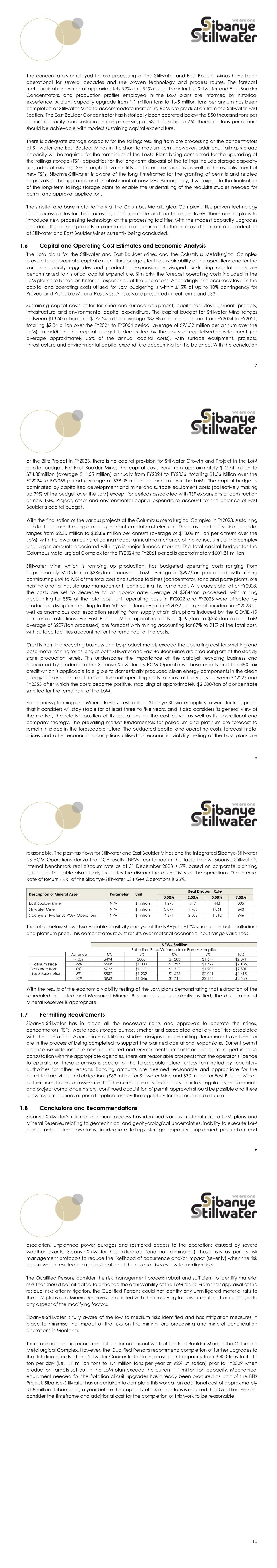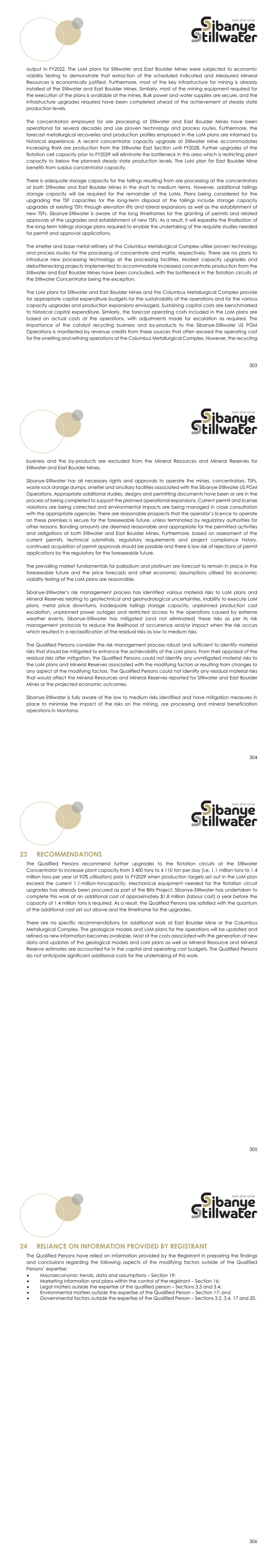 303 output in FY2022. The LoM plans for Stillwater and East Boulder Mines were subjected to economic viability testing to demonstrate that extraction of the scheduled Indicated and Measured Mineral Resources is economically justified. Furthermore, most of the key infrastructure for mining is already installed at the Stillwater and East Boulder Mines. Similarly, most of the mining equipment required for the execution of the plans is available at the mines. Bulk power and water supplies are secure, and the infrastructure upgrades required have been completed ahead of the achievement of steady state production levels. The concentrators employed for ore processing at Stillwater and East Boulder Mines have been operational for several decades and use proven technology and process routes. Furthermore, the forecast metallurgical recoveries and production profiles employed in the LoM plans are informed by historical experience. A recent concentrator capacity upgrade at Stillwater Mine accommodates increasing RoM ore production from the Stillwater East Section until FY2028. Further upgrades of the flotation cell capacity prior to FY2029 will eliminate the bottleneck in this area which is restricting plant capacity to below the planned steady state production levels. The LoM plan for East Boulder Mine benefits from surplus concentrator capacity. There is adequate storage capacity for the tailings resulting from ore processing at the concentrators at both Stillwater and East Boulder Mines in the short to medium terms. However, additional tailings storage capacity will be required for the remainder of the LoMs. Plans being considered for the upgrading the TSF capacities for the long-term disposal of the tailings include storage capacity upgrades at existing TSFs through elevation lifts and lateral expansions as well as the establishment of new TSFs. Sibanye-Stillwater is aware of the long timeframes for the granting of permits and related approvals of the upgrades and establishment of new TSFs. As a result, it will expedite the finalisation of the long-term tailings storage plans required to enable the undertaking of the requisite studies needed for permit and approval applications. The smelter and base metal refinery at the Columbus Metallurgical Complex utilise proven technology and process routes for the processing of concentrate and matte, respectively. There are no plans to introduce new processing technology at the processing facilities. Modest capacity upgrades and debottlenecking projects implemented to accommodate increased concentrate production from the Stillwater and East Boulder Mines have been concluded, with the bottleneck in the flotation circuits at the Stillwater Concentrator being the exception. The LoM plans for Stillwater and East Boulder Mines and the Columbus Metallurgical Complex provide for appropriate capital expenditure budgets for the sustainability of the operations and for the various capacity upgrades and production expansions envisaged. Sustaining capital costs are benchmarked to historical capital expenditure. Similarly, the forecast operating costs included in the LoM plans are based on actual costs at the operations, with adjustments made for escalation as required. The importance of the catalyst recycling business and by-products to the Sibanye-Stillwater US PGM Operations is manifested by revenue credits from these sources that often exceed the operating cost for the smelting and refining operations at the Columbus Metallurgical Complex. However, the recycling 304 business and the by-products are excluded from the Mineral Resources and Mineral Reserves for Stillwater and East Boulder Mines. Sibanye-Stillwater has all necessary rights and approvals to operate the mines, concentrators, TSFs, waste rock storage dumps, smelter and ancillary facilities associated with the Sibanye-Stillwater US PGM Operations. Appropriate additional studies, designs and permitting documents have been or are in the process of being completed to support the planned operational expansions. Current permit and license violations are being corrected and environmental impacts are being managed in close consultation with the appropriate agencies. There are reasonable prospects that the operator’s licence to operate on these premises is secure for the foreseeable future, unless terminated by regulatory authorities for other reasons. Bonding amounts are deemed reasonable and appropriate for the permitted activities and obligations at both Stillwater and East Boulder Mines. Furthermore, based on assessment of the current permits, technical submittals, regulatory requirements and project compliance history, continued acquisition of permit approvals should be possible and there is low risk of rejections of permit applications by the regulatory for the foreseeable future. The prevailing market fundamentals for palladium and platinum are forecast to remain in place in the foreseeable future and the price forecasts and other economic assumptions utilised for economic viability testing of the LoM plans are reasonable. Sibanye-Stillwater’s risk management process has identified various material risks to LoM plans and Mineral Reserves relating to geotechnical and geohydrological uncertainties, inability to execute LoM plans, metal price downturns, inadequate tailings storage capacity, unplanned production cost escalation, unplanned power outages and restricted access to the operations caused by extreme weather events. Sibanye-Stillwater has mitigated (and not eliminated) these risks as per its risk management protocols to reduce the likelihood of occurrence and/or impact when the risk occurs which resulted in a reclassification of the residual risks as low to medium risks. The Qualified Persons consider the risk management process robust and sufficient to identify material risks that should be mitigated to enhance the achievability of the LoM plans. From their appraisal of the residual risks after mi