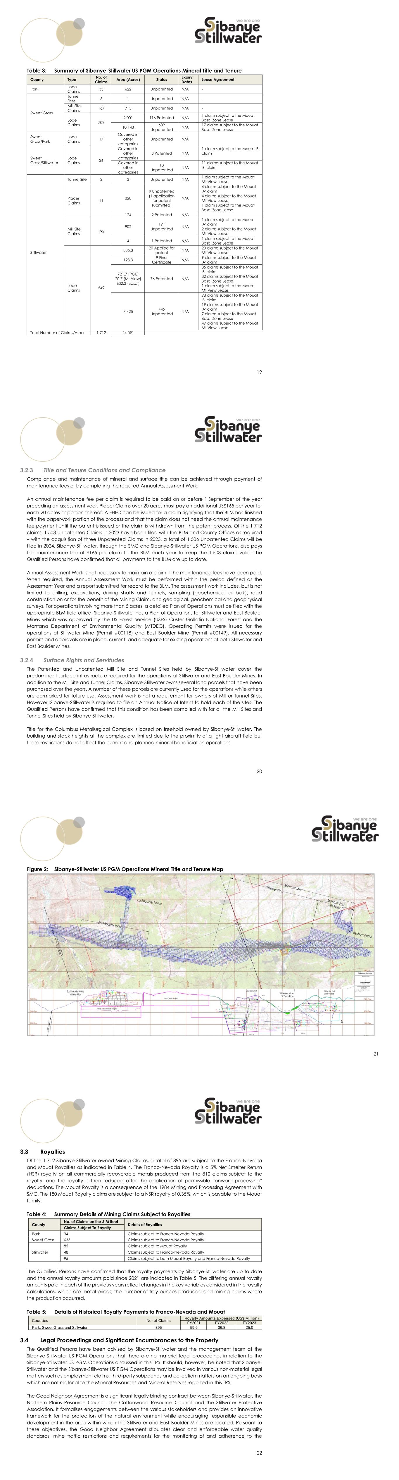 19 Table 3: Summary of Sibanye-Stillwater US PGM Operations Mineral Title and Tenure County Type No. of Claims Area (Acres) Status Expiry Dates Lease Agreement Park Lode Claims 33 622 Unpatented N/A - Sweet Grass Tunnel Sites 6 1 Unpatented N/A - Mill Site Claims 167 713 Unpatented N/A - Lode Claims 709 2 001 116 Patented N/A 1 claim subject to the Mouat Basal Zone Lease 10 143 609 Unpatented N/A 17 claims subject to the Mouat Basal Zone Lease Sweet Grass/Park Lode Claims 17 Covered in other categories Unpatented N/A Sweet Grass/Stillwater Lode Claims 26 Covered in other categories 3 Patented N/A 1 claim subject to the Mouat 'B' claim Covered in other categories 13 Unpatented N/A 11 claims subject to the Mouat 'B' claim Stillwater Tunnel Site 2 3 Unpatented N/A 1 claim subject to the Mouat Mt View Lease Placer Claims 11 320 9 Unpatented (1 application for patent submitted) N/A 4 claims subject to the Mouat 'A' claim 4 claims subject to the Mouat Mt View Lease 1 claim subject to the Mouat Basal Zone Lease 124 2 Patented N/A Mill Site Claims 192 902 191 Unpatented N/A 1 claim subject to the Mouat 'A' claim 2 claims subject to the Mouat Mt View Lease 4 1 Patented N/A 1 claim subject to the Mouat Basal Zone Lease Lode Claims 549 335.3 20 Applied for patent N/A 20 claims subject to the Mouat Mt View Lease 123.3 9 Final Certificate N/A 9 claims subject to the Mouat 'A' claim 721.7 (PGE) 20.7 (Mt View) 632.3 (Basal) 76 Patented N/A 35 claims subject to the Mouat 'B' claim 32 claims subject to the Mouat Basal Zone Lease 1 claim subject to the Mouat Mt View Lease 7 425 445 Unpatented N/A 98 claims subject to the Mouat 'B' claim 19 claims subject to the Mouat 'A' claim 7 claims subject to the Mouat Basal Zone Lease 49 claims subject to the Mouat Mt View Lease Total Number of Claims/Area 1 712 24 091 20 Title and Tenure Conditions and Compliance Compliance and maintenance of mineral and surface title can be achieved through payment of maintenance fees or by completing the required Annual Assessment Work. An annual maintenance fee per claim is required to be paid on or before 1 September of the year preceding an assessment year. Placer Claims over 20 acres must pay an additional US$165 per year for each 20 acres or portion thereof. A FHFC can be issued for a claim signifying that the BLM has finished with the paperwork portion of the process and that the claim does not need the annual maintenance fee payment until the patent is issued or the claim is withdrawn from the patent process. Of the 1 712 claims, 1 503 Unpatented Claims in 2023 have been filed with the BLM and County Offices as required – with the acquisition of three Unpatented Claims in 2023, a total of 1 506 Unpatented Claims will be filed in 2024. Sibanye-Stillwater, through the SMC and Sibanye-Stillwater US PGM Operations, also pays the maintenance fee of $165 per claim to the BLM each year to keep the 1 503 claims valid. The Qualified Persons have confirmed that all payments to the BLM are up to date. Annual Assessment Work is not necessary to maintain a claim if the maintenance fees have been paid. When required, the Annual Assessment Work must be performed within the period defined as the Assessment Year and a report submitted for record to the BLM. The assessment work includes, but is not limited to drilling, excavations, driving shafts and tunnels, sampling (geochemical or bulk), road construction on or for the benefit of the Mining Claim, and geological, geochemical and geophysical surveys. For operations involving more than 5 acres, a detailed Plan of Operations must be filed with the appropriate BLM field office. Sibanye-Stillwater has a Plan of Operations for Stillwater and East Boulder Mines which was approved by the US Forest Service (USFS) Custer Gallatin National Forest and the Montana Department of Environmental Quality (MTDEQ). Operating Permits were issued for the operations at Stillwater Mine (Permit #00118) and East Boulder Mine (Permit #00149). All necessary permits and approvals are in place, current, and adequate for existing operations at both Stillwater and East Boulder Mines. Surface Rights and Servitudes The Patented and Unpatented Mill Site and Tunnel Sites held by Sibanye-Stillwater cover the predominant surface infrastructure required for the operations at Stillwater and East Boulder Mines. In addition to the Mill Site and Tunnel Claims, Sibanye-Stillwater owns several land parcels that have been purchased over the years. A number of these parcels are currently used for the operations while others are earmarked for future use. Assessment work is not a requirement for owners of Mill or Tunnel Sites. However, Sibanye-Stillwater is required to file an Annual Notice of Intent to hold each of the sites. The Qualified Persons have confirmed that this condition has been complied with for all the Mill Sites and Tunnel Sites held by Sibanye-Stillwater. Title for the Columbus Metallurgical Complex is based on freehold owned by Sibanye-Stillwater. The building and stack heights at the complex are limited due to the proximity of a light aircraft field but these restrictions do not affect the current and planned mineral beneficiation operations. 21 Figure 2: Sibanye-Stillwater US PGM Operations Mineral Title and Tenure Map 22 Royalties Of the 1 712 Sibanye-Stillwater owned Mining Claims, a total of 895 are subject to the Franco-Nevada and Mouat Royalties as indicated in Table 4. The Franco-Nevada Royalty is a 5% Net Smelter Return (NSR) royalty on all commercially recoverable metals produced from the 810 claims subject to the royalty, and the royalty is then reduced after the application of permissible “onward processing” deductions. The Mouat Royalty is a consequence of the 1984 Mining and Processing Agreement with SMC. The 180 Mouat Royalty claims are subject to a NSR royalty of 0.35%, which is payable to the Mouat family. Table 4: Summary Details of Mining Claims Subject to Royalties County No. of Claims on the 
