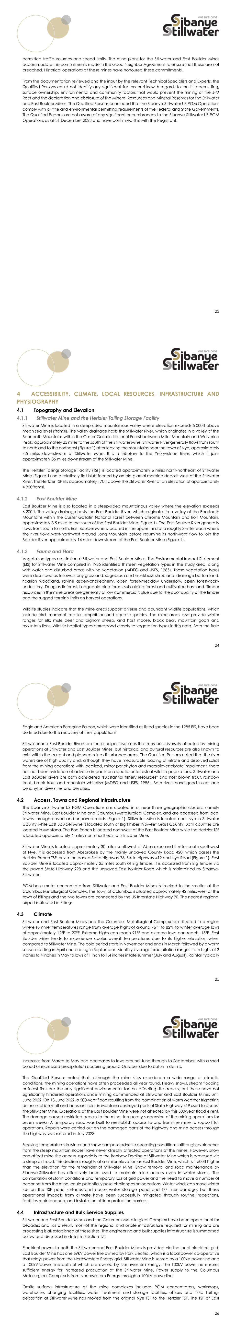 23 permitted traffic volumes and speed limits. The mine plans for the Stillwater and East Boulder Mines accommodate the commitments made in the Good Neighbor Agreement to ensure that these are not breached. Historical operations at these mines have honoured these commitments. From the documentation reviewed and the input by the relevant Technical Specialists and Experts, the Qualified Persons could not identify any significant factors or risks with regards to the title permitting, surface ownership, environmental and community factors that would prevent the mining of the J-M Reef and the declaration and disclosure of the Mineral Resources and Mineral Reserves for the Stillwater and East Boulder Mines. The Qualified Persons concluded that the Sibanye-Stillwater US PGM Operations comply with all title and environmental permitting requirements of the Federal and State Governments. The Qualified Persons are not aware of any significant encumbrances to the Sibanye-Stillwater US PGM Operations as at 31 December 2023 and have confirmed this with the Registrant. 24 ACCESSIBILITY, CLIMATE, LOCAL RESOURCES, INFRASTRUCTURE AND PHYSIOGRAPHY Topography and Elevation Stillwater Mine and the Hertzler Tailing Storage Facility Stillwater Mine is located in a steep-sided mountainous valley where elevation exceeds 5 000ft above mean sea level (ftamsl). The valley drainage hosts the Stillwater River, which originates in a valley of the Beartooth Mountains within the Custer Gallatin National Forest between Miller Mountain and Wolverine Peak, approximately 25 miles to the south of the Stillwater Mine. Stillwater River generally flows from south to north and to the northeast (Figure 1) after leaving the mountains near the town of Nye, approximately 4.5 miles downstream of Stillwater Mine. It is a tributary to the Yellowstone River, which it joins approximately 36 miles downstream of the Stillwater Mine. The Hertzler Tailings Storage Facility (TSF) is located approximately 6 miles north-northeast of Stillwater Mine (Figure 1) on a relatively flat bluff formed by an old glacial moraine deposit west of the Stillwater River. The Hertzler TSF sits approximately 170ft above the Stillwater River at an elevation of approximately 4 900ftamsl. East Boulder Mine East Boulder Mine is also located in a steep-sided mountainous valley where the elevation exceeds 6 200ft. The valley drainage hosts the East Boulder River, which originates in a valley of the Beartooth Mountains within the Custer Gallatin National Forest between Chrome Mountain and Iron Mountain, approximately 8.5 miles to the south of the East Boulder Mine (Figure 1). The East Boulder River generally flows from south to north. East Boulder Mine is located in the upper third of a roughly 3-mile reach where the river flows west-northwest around Long Mountain before resuming its northward flow to join the Boulder River approximately 14 miles downstream of the East Boulder Mine (Figure 1). Fauna and Flora Vegetation types are similar at Stillwater and East Boulder Mines. The Environmental Impact Statement (EIS) for Stillwater Mine compiled in 1985 identified thirteen vegetation types in the study area, along with water and disturbed areas with no vegetation (MDEQ and USFS, 1985). These vegetation types were described as follows: stony grassland, sagebrush and skunkbush shrubland, drainage bottomland, riparian woodland, ravine aspen-chokecherry, open forest-meadow understory, open forest-rocky understory, Douglas-fir forest, Lodgepole pine forest, sub-alpine forest and cultivated hay land. Timber resources in the mine areas are generally of low commercial value due to the poor quality of the timber and the rugged terrain's limits on harvest operations. Wildlife studies indicate that the mine areas support diverse and abundant wildlife populations, which include bird, mammal, reptile, amphibian and aquatic species. The mine areas also provide winter ranges for elk, mule deer and bighorn sheep, and host moose, black bear, mountain goats and mountain lions. Wildlife habitat types correspond closely to vegetation types in this area. Both the Bald 25 Eagle and American Peregrine Falcon, which were identified as listed species in the 1985 EIS, have been de-listed due to the recovery of their populations. Stillwater and East Boulder Rivers are the principal resources that may be adversely affected by mining operations at Stillwater and East Boulder Mines, but historical and cultural resources are also known to exist within the current and planned mine disturbance areas. The Qualified Persons noted that the river waters are of high quality and, although they have measurable loading of nitrate and dissolved solids from the mining operations with localized, minor periphyton and macroinvertebrate impairment, there has not been evidence of adverse impacts on aquatic or terrestrial wildlife populations. Stillwater and East Boulder Rivers are both considered "substantial fishery resources” and host brown trout, rainbow trout, brook trout and mountain whitefish (MDEQ and USFS, 1985). Both rivers have good insect and periphyton diversities and densities. Access, Towns and Regional Infrastructure The Sibanye-Stillwater US PGM Operations are situated in or near three geographic clusters, namely Stillwater Mine, East Boulder Mine and Columbus Metallurgical Complex, and are accessed from local towns through paved and unpaved roads (Figure 1). Stillwater Mine is located near Nye in Stillwater County while East Boulder Mine is located south of Big Timber in Sweet Grass County. Both counties are located in Montana. The Boe Ranch is located northwest of the East Boulder Mine while the Hertzler TSF is located approximately 6 miles north-northeast of Stillwater Mine. Stillwater Mine is located approximately 30 miles southwest of Absarokee and 4 miles south-southwest of Nye. It is accessed from Absarokee by the mainly unpaved County Road 420, which passes the Hertzler Ranch TSF, or via the 