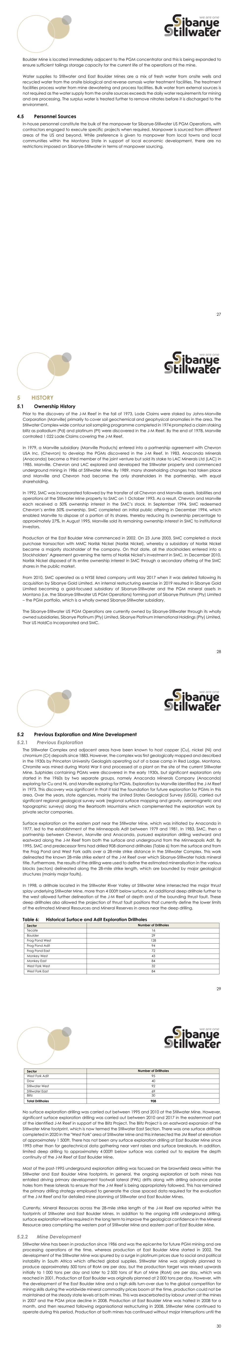 27 Boulder Mine is located immediately adjacent to the PGM concentrator and this is being expanded to ensure sufficient tailings storage capacity for the current life of the operations at the mine. Water supplies to Stillwater and East Boulder Mines are a mix of fresh water from onsite wells and recycled water from the onsite biological and reverse osmosis water treatment facilities. The treatment facilities process water from mine dewatering and process facilities. Bulk water from external sources is not required as the water supply from the onsite sources exceeds the daily water requirements for mining and ore processing. The surplus water is treated further to remove nitrates before it is discharged to the environment. Personnel Sources In-house personnel constitute the bulk of the manpower for Sibanye-Stillwater US PGM Operations, with contractors engaged to execute specific projects when required. Manpower is sourced from different areas of the US and beyond. While preference is given to manpower from local towns and local communities within the Montana State in support of local economic development, there are no restrictions imposed on Sibanye-Stillwater in terms of manpower sourcing. 28 HISTORY Ownership History Prior to the discovery of the J-M Reef in the fall of 1973, Lode Claims were staked by Johns-Manville Corporation (Manville) primarily to cover soil geochemical and geophysical anomalies in the area. The Stillwater Complex-wide contour soil sampling programme completed in 1974 prompted a claim staking blitz as palladium (Pd) and platinum (Pt) were discovered in the J-M Reef. By the end of 1978, Manville controlled 1 022 Lode Claims covering the J-M Reef. In 1979, a Manville subsidiary (Manville Products) entered into a partnership agreement with Chevron USA Inc. (Chevron) to develop the PGMs discovered in the J-M Reef. In 1983, Anaconda Minerals (Anaconda) became a third member of the joint venture but sold its stake to LAC Minerals Ltd (LAC) in 1985. Manville, Chevron and LAC explored and developed the Stillwater property and commenced underground mining in 1986 at Stillwater Mine. By 1989, many shareholding changes had taken place and Manville and Chevron had become the only shareholders in the partnership, with equal shareholding. In 1992, SMC was incorporated followed by the transfer of all Chevron and Manville assets, liabilities and operations at the Stillwater Mine property to SMC on 1 October 1993. As a result, Chevron and Manville each received a 50% ownership interest in the SMC’s stock. In September 1994, SMC redeemed Chevron’s entire 50% ownership. SMC completed an initial public offering in December 1994, which enabled Manville to dispose of a portion of its shares, thereby reducing its ownership percentage to approximately 27%. In August 1995, Manville sold its remaining ownership interest in SMC to institutional investors. Production at the East Boulder Mine commenced in 2002. On 23 June 2003, SMC completed a stock purchase transaction with MMC Norilsk Nickel (Norilsk Nickel), whereby a subsidiary of Norilsk Nickel became a majority stockholder of the company. On that date, all the stockholders entered into a Stockholders’ Agreement governing the terms of Norilsk Nickel’s investment in SMC. In December 2010, Norilsk Nickel disposed of its entire ownership interest in SMC through a secondary offering of the SMC shares in the public market. From 2010, SMC operated as a NYSE listed company until May 2017 when it was delisted following its acquisition by Sibanye Gold Limited. An internal restructuring exercise in 2019 resulted in Sibanye Gold Limited becoming a gold-focused subsidiary of Sibanye-Stillwater and the PGM mineral assets in Montana (i.e. the Sibanye-Stillwater US PGM Operations) forming part of Sibanye Platinum (Pty) Limited – the PGM portfolio, which is a wholly owned Sibanye-Stillwater subsidiary. The Sibanye-Stillwater US PGM Operations are currently owned by Sibanye-Stillwater through its wholly owned subsidiaries, Sibanye Platinum (Pty) Limited, Sibanye Platinum International Holdings (Pty) Limited, Thor US HoldCo Incorporated and SMC. 29 Previous Exploration and Mine Development Previous Exploration The Stillwater Complex and adjacent areas have been known to host copper (Cu), nickel (Ni) and chromium (Cr) deposits since 1883. However, the complex was first geologically mapped and described in the 1930s by Princeton University Geologists operating out of a base camp in Red Lodge, Montana. Chromite was mined during World War II and processed at a plant on the site of the current Stillwater Mine. Sulphides containing PGMs were discovered in the early 1930s, but significant exploration only started in the 1960s by two separate groups, namely Anaconda Minerals Company (Anaconda) exploring for Cu and Ni, and Manville exploring for PGMs. Exploration by Manville identified the J-M Reef in 1973. This discovery was significant in that it laid the foundation for future exploration for PGMs in this area. Over the years, state agencies, mainly the United States Geological Survey (USGS), carried out significant regional geological survey work (regional surface mapping and gravity, aeromagnetic and topographic surveys) along the Beartooth Mountains which complemented the exploration work by private sector companies. Surface exploration on the eastern part near the Stillwater Mine, which was initiated by Anaconda in 1977, led to the establishment of the Minneapolis Adit between 1979 and 1981. In 1983, SMC, then a partnership between Chevron, Manville and Anaconda, pursued exploration drilling westward and eastward along the J-M Reef from both the surface and underground from the Minneapolis Adit. By 1995, SMC and predecessor firms had drilled 908 diamond drillholes (Table 6) from the surface and from the Frog Pond and West Fork adits over a 28-mile strike distance in the Stillwater Complex. This work delineated the known 28-mile strike extent of the