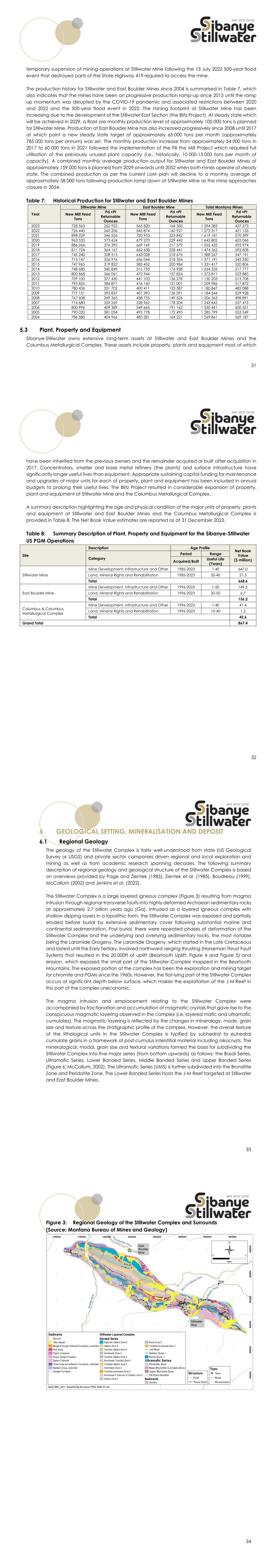 31 temporary suspension of mining operations at Stillwater Mine following the 13 July 2022 500-year flood event that destroyed parts of the State Highway 419 required to access the mine. The production history for Stillwater and East Boulder Mines since 2004 is summarised in Table 7, which also indicates that the mines have been on progressive production ramp-up since 2015 until the ramp up momentum was disrupted by the COVID-19 pandemic and associated restrictions between 2020 and 2022 and the 500-year flood event in 2022. The mining footprint at Stillwater Mine has been increasing due to the development of the Stillwater East Section (the Blitz Project). At steady state which will be achieved in 2029, a RoM ore monthly production level of approximately 100 000 tons is planned for Stillwater Mine. Production at East Boulder Mine has also increased progressively since 2008 until 2017 at which point a new steady state target of approximately 65 000 tons per month (approximately 785 000 tons per annum) was set. The monthly production increase from approximately 54 000 tons in 2017 to 60 000 tons in 2021 followed the implementation of the Fill the Mill Project which required full utilisation of the previously unused plant capacity (i.e., historically, 10 000-15 000 tons per month of capacity). A combined monthly average production output for Stillwater and East Boulder Mines of approximately 159 000 tons is planned from 2029 onwards until 2052 when both mines operate at steady state. The combined production as per the current LoM plan will decline to a monthly average of approximately 58 000 tons following production ramp down at Stillwater Mine as the mine approaches closure in 2054. Table 7: Historical Production for Stillwater and East Boulder Mines Year Stillwater Mine East Boulder Mine Total Montana Mines New Mill Feed Tons Pd +Pt Returnable Ounces New Mill Feed Tons Pd +Pt Returnable Ounces New Mill Feed Tons Pd +Pt Returnable Ounces 2023 728 563 262 923 565 820 164 350 1 294 383 427 273 2022 726 443 260 206 545 874 160 927 1 272 317 421 133 2021 898 229 346 556 720 953 223 842 1 619 181 570 399 2020 963 533 373 624 679 270 229 442 1 642 802 603 066 2019 886 264 376 395 669 169 217 579 1 555 433 593 974 2018 811 724 364 167 662 638 228 441 1 474 362 592 608 2017 745 240 328 515 643 028 218 676 1 388 267 547 191 2016 715 147 326 976 656 044 218 354 1 371 191 545 330 2015 747 965 319 822 583 452 200 984 1 331 417 520 806 2014 748 680 340 849 515 753 176 928 1 264 333 517 777 2013 800 868 366 061 472 944 157 824 1 273 811 523 885 2012 709 100 377 430 441 103 136 278 1 150 203 513 708 2011 793 826 386 871 416 160 131 001 1 209 986 517 872 2010 780 436 351 702 400 411 133 387 1 180 847 485 088 2009 777 151 393 837 407 393 136 091 1 184 544 529 928 2008 767 608 349 365 438 755 149 526 1 206 363 498 891 2007 714 680 359 269 528 962 178 204 1 243 642 537 473 2006 800 996 409 389 549 665 191 162 1 350 661 600 551 2005 790 020 381 054 495 778 172 495 1 285 799 553 549 2004 786 580 404 966 483 281 164 221 1 269 861 569 187 Plant, Property and Equipment Sibanye-Stillwater owns extensive long-term assets at Stillwater and East Boulder Mines and the Columbus Metallurgical Complex. These assets include property, plants and equipment most of which 32 have been inherited from the previous owners and the remainder acquired or built after acquisition in 2017. Concentrators, smelter and base metal refinery (the plants) and surface infrastructure have significantly longer useful lives than equipment. Appropriate sustaining capital funding for maintenance and upgrades of major units for each of property, plant and equipment has been included in annual budgets to prolong their useful lives. The Blitz Project resulted in considerable expansion of property, plant and equipment at Stillwater Mine and the Columbus Metallurgical Complex. A summary description highlighting the age and physical condition of the major units of property, plants and equipment at Stillwater and East Boulder Mines and the Columbus Metallurgical Complex is provided in Table 8. The Net Book Value estimates are reported as at 31 December 2023. Table 8: Summary Description of Plant, Property and Equipment for the Sibanye-Stillwater US PGM Operations Site Description Age Profile Net Book Value ($ million) Category Period Range Acquired/Built Useful Life (Years) Stillwater Mine Mine Development, Infrastructure and Other 1985-2023 1-40 647.0 Land, Mineral Rights and Rehabilitation 1985-2023 20-40 21.5 Total 668.6 East Boulder Mine Mine Development, Infrastructure and Other 1996-2023 1-50 149.5 Land, Mineral Rights and Rehabilitation 1996-2023 30-50 6.7 Total 156.2 Columbus & Columbus Metallurgical Complex Mine Development, Infrastructure and Other 1996-2023 1-40 41.4 Land, Mineral Rights and Rehabilitation 1996-2023 10-40 1.2 Total 42.6 Grand Total 867.4 33 GEOLOGICAL SETTING, MINERALISATION AND DEPOSIT Regional Geology The geology of the Stillwater Complex is fairly well-understood from state (US Geological Survey or USGS) and private sector companies driven regional and local exploration and mining as well as from academic research spanning decades. The following summary description of regional geology and geological structure of the Stillwater Complex is based on overviews provided by Page and Zientek (1985), Zientek et al. (1985), Boudreau (1999), McCallum (2002) and Jenkins et al. (2022). The Stillwater Complex is a large layered igneous complex (Figure 3) resulting from magma intrusion through regional transverse faults into highly deformed Archaean sedimentary rocks at approximately 2.7 billion years ago (Ga). Intruded as a layered igneous complex with shallow dipping layers in a lopolithic form, the Stillwater Complex was exposed and partially eroded before burial by extensive sedimentary cover following substantial marine and continental sedimentation. Post burial, there were repeated phases of deformation of the Stillwater Complex a