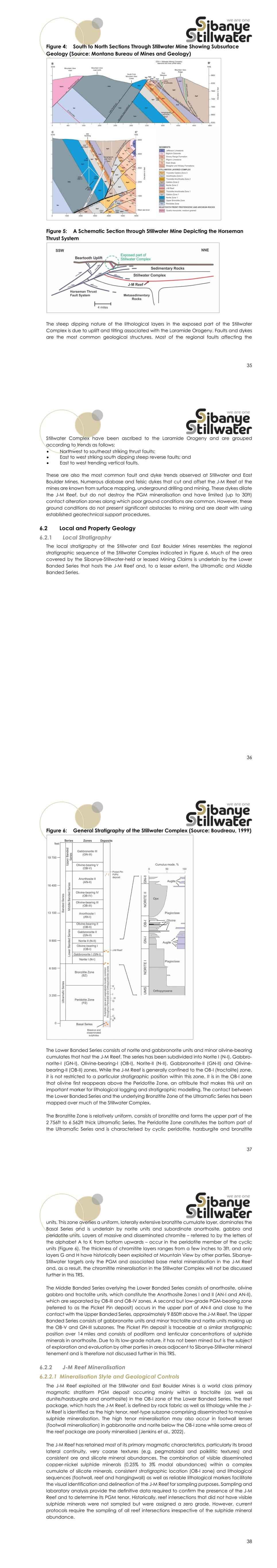 35 Figure 4: South to North Sections Through Stillwater Mine Showing Subsurface Geology (Source: Montana Bureau of Mines and Geology) Figure 5: A Schematic Section through Stillwater Mine Depicting the Horseman Thrust System The steep dipping nature of the lithological layers in the exposed part of the Stillwater Complex is due to uplift and tilting associated with the Laramide Orogeny. Faults and dykes are the most common geological structures. Most of the regional faults affecting the 36 Stillwater Complex have been ascribed to the Laramide Orogeny and are grouped according to trends as follows:  Northwest to southeast striking thrust faults;  East to west striking south dipping steep reverse faults; and  East to west trending vertical faults. These are also the most common fault and dyke trends observed at Stillwater and East Boulder Mines. Numerous diabase and felsic dykes that cut and offset the J-M Reef at the mines are known from surface mapping, underground drilling and mining. These dykes dilate the J-M Reef, but do not destroy the PGM mineralisation and have limited (up to 30ft) contact alteration zones along which poor ground conditions are common. However, these ground conditions do not present significant obstacles to mining and are dealt with using established geotechnical support procedures. Local and Property Geology Local Stratigraphy The local stratigraphy at the Stillwater and East Boulder Mines resembles the regional stratigraphic sequence of the Stillwater Complex indicated in Figure 6. Much of the area covered by the Sibanye-Stillwater-held or leased Mining Claims is underlain by the Lower Banded Series that hosts the J-M Reef and, to a lesser extent, the Ultramafic and Middle Banded Series. 37 Figure 6: General Stratigraphy of the Stillwater Complex (Source: Boudreau, 1999) The Lower Banded Series consists of norite and gabbronorite units and minor olivine-bearing cumulates that host the J-M Reef. The series has been subdivided into Norite I (N-I), Gabbro- norite-I (GN-I), Olivine-bearing-I (OB-I), Norite-II (N-II), Gabbronorite-II (GN-II) and Olivine- bearing-II (OB-II) zones. While the J-M Reef is generally confined to the OB-I (troctolite) zone, it is not restricted to a particular stratigraphic position within this zone. It is in the OB-I zone that olivine first reappears above the Peridotite Zone, an attribute that makes this unit an important marker for lithological logging and stratigraphic modelling. The contact between the Lower Banded Series and the underlying Bronzitite Zone of the Ultramafic Series has been mapped over much of the Stillwater Complex. The Bronzitite Zone is relatively uniform, consists of bronzitite and forms the upper part of the 2 756ft to 6 562ft thick Ultramafic Series. The Peridotite Zone constitutes the bottom part of the Ultramafic Series and is characterised by cyclic peridotite, harzburgite and bronzitite 38 units. This zone overlies a uniform, laterally extensive bronzitite cumulate layer, dominates the Basal Series and is underlain by norite units and subordinate anorthosite, gabbro and peridotite units. Layers of massive and disseminated chromite – referred to by the letters of the alphabet A to K from bottom upwards – occur in the peridotite member of the cyclic units (Figure 6). The thickness of chromitite layers ranges from a few inches to 3ft, and only layers G and H have historically been exploited at Mountain View by other parties. Sibanye- Stillwater targets only the PGM and associated base metal mineralisation in the J-M Reef and, as a result, the chromitite mineralisation in the Stillwater Complex will not be discussed further in this TRS. The Middle Banded Series overlying the Lower Banded Series consists of anorthosite, olivine gabbro and troctolite units, which constitute the Anorthosite Zones I and II (AN-I and AN-II), which are separated by OB-III and OB-IV zones. A second but low-grade PGM-bearing zone (referred to as the Picket Pin deposit) occurs in the upper part of AN-II and close to the contact with the Upper Banded Series, approximately 9 850ft above the J-M Reef. The Upper Banded Series consists of gabbronorite units and minor troctolite and norite units making up the OB-V and GN-III subzones. The Picket Pin deposit is traceable at a similar stratigraphic position over 14 miles and consists of podiform and lenticular concentrations of sulphide minerals in anorthosite. Due to its low-grade nature, it has not been mined but is the subject of exploration and evaluation by other parties in areas adjacent to Sibanye-Stillwater mineral tenement and is therefore not discussed further in this TRS. J-M Reef Mineralisation 6.2.2.1 Mineralisation Style and Geological Controls The J-M Reef exploited at the Stillwater and East Boulder Mines is a world class primary magmatic stratiform PGM deposit occurring mainly within a troctolite (as well as dunite/harzburgite and anorthosite) in the OB-I zone of the Lower Banded Series. The reef package, which hosts the J-M Reef, is defined by rock fabric as well as lithology while the J- M Reef is identified as the high tenor, reef-type subzone comprising disseminated to massive sulphide mineralisation. The high tenor mineralisation may also occur in footwall lenses (footwall mineralisation) in gabbronorite and norite below the OB-I zone while some areas of the reef package are poorly mineralised (Jenkins et al., 2022). The J-M Reef has retained most of its primary magmatic characteristics, particularly its broad lateral continuity, very coarse textures (e.g. pegmatoidal and poikilitic textures) and consistent ore and silicate mineral abundances. The combination of visible disseminated copper-nickel sulphide minerals (0.25% to 3% modal abundances) within a complex cumulate of silicate minerals, consistent stratigraphic location (OB-I zone) and lithological sequences (footwall, reef and hangingwall) as well as reliable lithological markers facilitate the visual ident