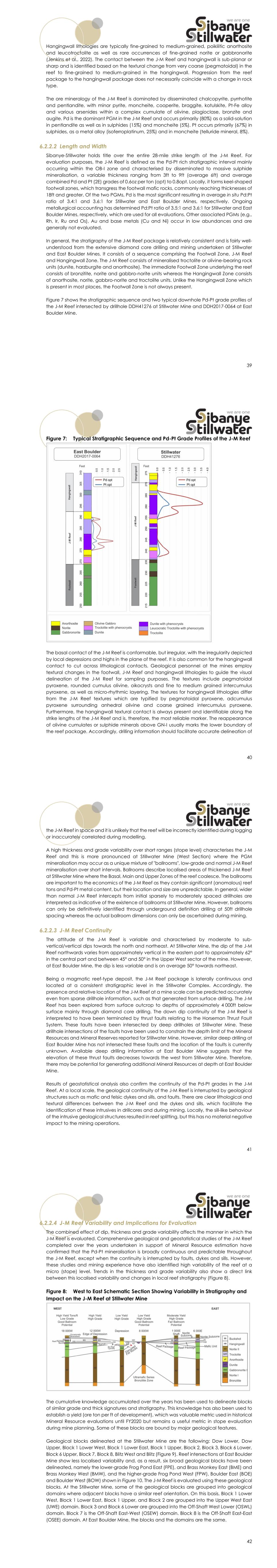 39 Hangingwall lithologies are typically fine-grained to medium-grained, poikilitic anorthosite and leucotroctolite as well as rare occurrences of fine-grained norite or gabbronorite (Jenkins et al., 2022). The contact between the J-M Reef and hangingwall is sub-planar or sharp and is identified based on the textural change from very coarse (pegmatoidal) in the reef to fine-grained to medium-grained in the hangingwall. Progression from the reef package to the hangingwall package does not necessarily coincide with a change in rock type. The ore mineralogy of the J-M Reef is dominated by disseminated chalcopyrite, pyrrhotite and pentlandite, with minor pyrite, moncheite, cooperite, braggite, kotulskite, Pt-Fe alloy and various arsenides within a complex cumulate of olivine, plagioclase, bronzite and augite. Pd is the dominant PGM in the J-M Reef and occurs primarily (80%) as a solid-solution in pentlandite as well as in sulphides (15%) and moncheite (5%). Pt occurs primarily (67%) in sulphides, as a metal alloy (isoferroplatinum, 25%) and in moncheite (telluride mineral, 8%). 6.2.2.2 Length and Width Sibanye-Stillwater holds title over the entire 28-mile strike length of the J-M Reef. For evaluation purposes, the J-M Reef is defined as the Pd-Pt rich stratigraphic interval mainly occurring within the OB-I zone and characterised by disseminated to massive sulphide mineralisation, a variable thickness ranging from 3ft to 9ft (average 6ft) and average combined Pd and Pt (2E) grades of 0.6oz per ton (opt) to 0.8opt. Locally, it forms keel-shaped footwall zones, which transgress the footwall mafic rocks, commonly reaching thicknesses of 18ft and greater. Of the two PGMs, Pd is the most significant resulting in average in situ Pd:Pt ratio of 3.4:1 and 3.6:1 for Stillwater and East Boulder Mines, respectively. Ongoing metallurgical accounting has determined Pd:Pt ratio of 3.5:1 and 3.6:1 for Stillwater and East Boulder Mines, respectively, which are used for all evaluations. Other associated PGMs (e.g., Rh, Ir, Ru and Os), Au and base metals (Cu and Ni) occur in low abundances and are generally not evaluated. In general, the stratigraphy of the J-M Reef package is relatively consistent and is fairly well- understood from the extensive diamond core drilling and mining undertaken at Stillwater and East Boulder Mines. It consists of a sequence comprising the Footwall Zone, J-M Reef and Hangingwall Zone. The J-M Reef consists of mineralised troctolite or olivine-bearing rock units (dunite, harzburgite and anorthosite). The immediate Footwall Zone underlying the reef consists of bronzitite, norite and gabbro-norite units whereas the Hangingwall Zone consists of anorthosite, norite, gabbro-norite and troctolite units. Unlike the Hangingwall Zone which is present in most places, the Footwall Zone is not always present. Figure 7 shows the stratigraphic sequence and two typical downhole Pd-Pt grade profiles of the J-M Reef intersected by drillhole DDH41276 at Stillwater Mine and DDH2017-0064 at East Boulder Mine. 40 Figure 7: Typical Stratigraphic Sequence and Pd-Pt Grade Profiles of the J-M Reef The basal contact of the J-M Reef is conformable, but irregular, with the irregularity depicted by local depressions and highs in the plane of the reef. It is also common for the hangingwall contact to cut across lithological contacts. Geological personnel at the mines employ textural changes in the footwall, J-M Reef and hangingwall lithologies to guide the visual delineation of the J-M Reef for sampling purposes. The textures include pegmatoidal pyroxene, rounded cumulus olivine, oikocrysts and fine to medium grained intercumulus pyroxene, as well as micro-rhythmic layering. The textures for hangingwall lithologies differ from the J-M Reef textures which are typified by pegmatoidal pyroxene, adcumulus pyroxene surrounding anhedral olivine and coarse grained intercumulus pyroxene. Furthermore, the hangingwall textural contact is always present and identifiable along the strike lengths of the J-M Reef and is, therefore, the most reliable marker. The reappearance of olivine cumulates or sulphide minerals above GN-I usually marks the lower boundary of the reef package. Accordingly, drilling information should facilitate accurate delineation of 41 the J-M Reef in space and it is unlikely that the reef will be incorrectly identified during logging or inaccurately correlated during modelling. A high thickness and grade variability over short ranges (stope level) characterises the J-M Reef and this is more pronounced at Stillwater Mine (West Section) where the PGM mineralisation may occur as a unique mixture of "ballrooms", low-grade and normal J-M Reef mineralisation over short intervals. Ballrooms describe localised areas of thickened J-M Reef at Stillwater Mine where the Basal, Main and Upper Zones of the reef coalesce. The ballrooms are important to the economics of the J-M Reef as they contain significant (anomalous) reef tons and Pd-Pt metal content, but their location and size are unpredictable. In general, wider than normal J-M Reef intercepts from initial sparsely to moderately spaced drillholes are interpreted as indicative of the existence of ballrooms at Stillwater Mine. However, ballrooms can only be definitively identified through underground definition drilling at 50ft drillhole spacing whereas the actual ballroom dimensions can only be ascertained during mining. 6.2.2.3 J-M Reef Continuity The attitude of the J-M Reef is variable and characterised by moderate to sub- vertical/vertical dips towards the north and northeast. At Stillwater Mine, the dip of the J-M Reef northwards varies from approximately vertical in the eastern part to approximately 62° in the central part and between 45° and 50° in the Upper West sector of the mine. However, at East Boulder Mine, the dip is less variable and is on average 50° towards northeast. Being a magmatic reef-type deposit, the J-M Reef package is laterally cont