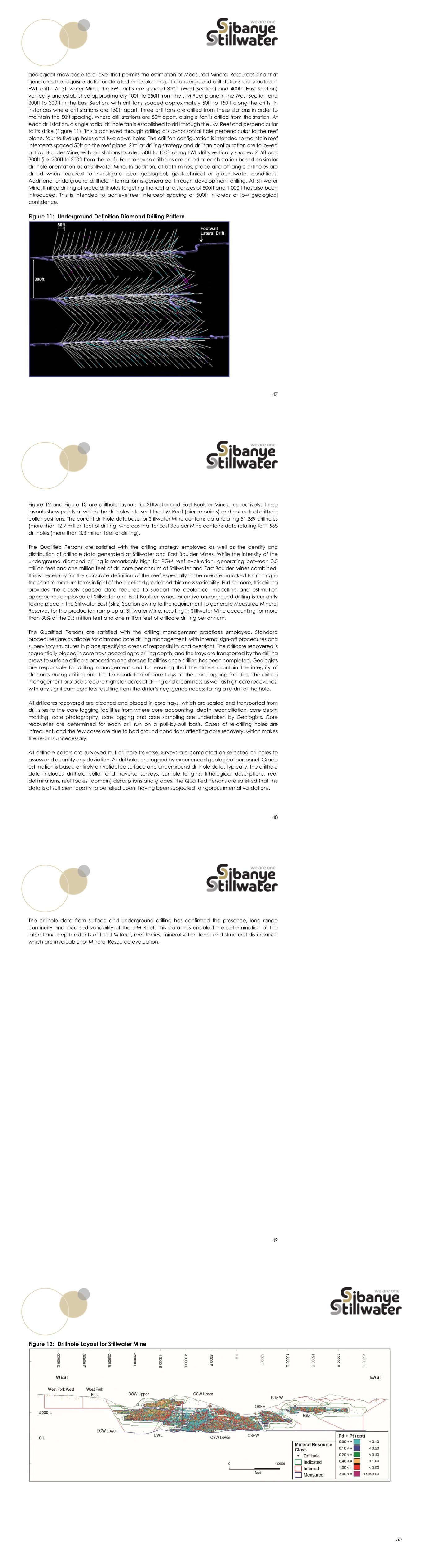 47 geological knowledge to a level that permits the estimation of Measured Mineral Resources and that generates the requisite data for detailed mine planning. The underground drill stations are situated in FWL drifts. At Stillwater Mine, the FWL drifts are spaced 300ft (West Section) and 400ft (East Section) vertically and established approximately 100ft to 250ft from the J-M Reef plane in the West Section and 200ft to 300ft in the East Section, with drill fans spaced approximately 50ft to 150ft along the drifts. In instances where drill stations are 150ft apart, three drill fans are drilled from these stations in order to maintain the 50ft spacing. Where drill stations are 50ft apart, a single fan is drilled from the station. At each drill station, a single radial drillhole fan is established to drill through the J-M Reef and perpendicular to its strike (Figure 11). This is achieved through drilling a sub-horizontal hole perpendicular to the reef plane, four to five up-holes and two down-holes. The drill fan configuration is intended to maintain reef intercepts spaced 50ft on the reef plane. Similar drilling strategy and drill fan configuration are followed at East Boulder Mine, with drill stations located 50ft to 100ft along FWL drifts vertically spaced 215ft and 300ft (i.e. 200ft to 300ft from the reef). Four to seven drillholes are drilled at each station based on similar drillhole orientation as at Stillwater Mine. In addition, at both mines, probe and off-angle drillholes are drilled when required to investigate local geological, geotechnical or groundwater conditions. Additional underground drillhole information is generated through development drilling. At Stillwater Mine, limited drilling of probe drillholes targeting the reef at distances of 500ft and 1 000ft has also been introduced. This is intended to achieve reef intercept spacing of 500ft in areas of low geological confidence. Figure 11: Underground Definition Diamond Drilling Pattern 48 Figure 12 and Figure 13 are drillhole layouts for Stillwater and East Boulder Mines, respectively. These layouts show points at which the drillholes intersect the J-M Reef (pierce points) and not actual drillhole collar positions. The current drillhole database for Stillwater Mine contains data relating 51 289 drillholes (more than 12.7 million feet of drilling) whereas that for East Boulder Mine contains data relating to11 568 drillholes (more than 3.3 million feet of drilling). The Qualified Persons are satisfied with the drilling strategy employed as well as the density and distribution of drillhole data generated at Stillwater and East Boulder Mines. While the intensity of the underground diamond drilling is remarkably high for PGM reef evaluation, generating between 0.5 million feet and one million feet of drillcore per annum at Stillwater and East Boulder Mines combined, this is necessary for the accurate definition of the reef especially in the areas earmarked for mining in the short to medium terms in light of the localised grade and thickness variability. Furthermore, this drilling provides the closely spaced data required to support the geological modelling and estimation approaches employed at Stillwater and East Boulder Mines. Extensive underground drilling is currently taking place in the Stillwater East (Blitz) Section owing to the requirement to generate Measured Mineral Reserves for the production ramp-up at Stillwater Mine, resulting in Stillwater Mine accounting for more than 80% of the 0.5 million feet and one million feet of drillcore drilling per annum. The Qualified Persons are satisfied with the drilling management practices employed. Standard procedures are available for diamond core drilling management, with internal sign-off procedures and supervisory structures in place specifying areas of responsibility and oversight. The drillcore recovered is sequentially placed in core trays according to drilling depth, and the trays are transported by the drilling crews to surface drillcore processing and storage facilities once drilling has been completed. Geologists are responsible for drilling management and for ensuring that the drillers maintain the integrity of drillcores during drilling and the transportation of core trays to the core logging facilities. The drilling management protocols require high standards of drilling and cleanliness as well as high core recoveries, with any significant core loss resulting from the driller’s negligence necessitating a re-drill of the hole. All drillcores recovered are cleaned and placed in core trays, which are sealed and transported from drill sites to the core logging facilities from where core accounting, depth reconciliation, core depth marking, core photography, core logging and core sampling are undertaken by Geologists. Core recoveries are determined for each drill run on a pull-by-pull basis. Cases of re-drilling holes are infrequent, and the few cases are due to bad ground conditions affecting core recovery, which makes the re-drills unnecessary. All drillhole collars are surveyed but drillhole traverse surveys are completed on selected drillholes to assess and quantify any deviation. All drillholes are logged by experienced geological personnel. Grade estimation is based entirely on validated surface and underground drillhole data. Typically, the drillhole data includes drillhole collar and traverse surveys, sample lengths, lithological descriptions, reef delimitations, reef facies (domain) descriptions and grades. The Qualified Persons are satisfied that this data is of sufficient quality to be relied upon, having been subjected to rigorous internal validations. 49 The drillhole data from surface and underground drilling has confirmed the presence, long range continuity and localised variability of the J-M Reef. This data has enabled the determination of the lateral and depth extents of the J-M Reef, reef facies, mineralisation tenor and structural disturbance which a