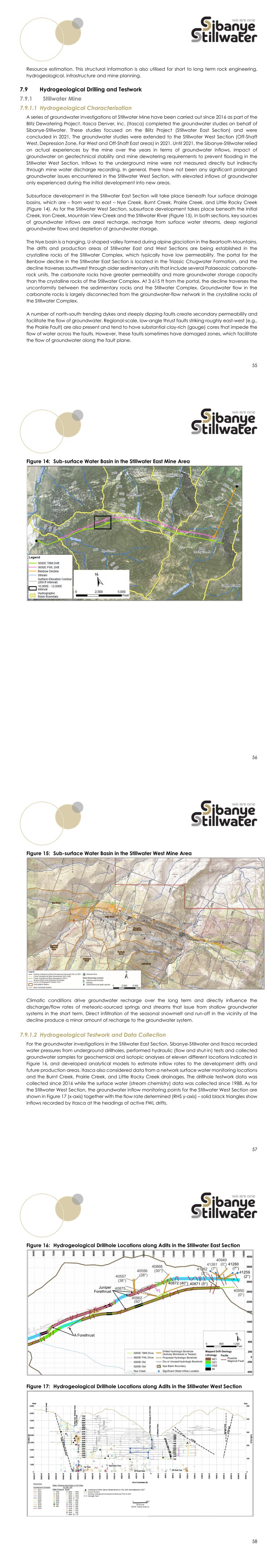 55 Resource estimation. This structural information is also utilised for short to long term rock engineering, hydrogeological, infrastructure and mine planning. Hydrogeological Drilling and Testwork Stillwater Mine 7.9.1.1 Hydrogeological Characterisation A series of groundwater investigations at Stillwater Mine have been carried out since 2016 as part of the Blitz Dewatering Project. Itasca Denver, Inc. (Itasca) completed the groundwater studies on behalf of Sibanye-Stillwater. These studies focused on the Blitz Project (Stillwater East Section) and were concluded in 2021. The groundwater studies were extended to the Stillwater West Section (Off-Shaft West, Depression Zone, Far West and Off-Shaft East areas) in 2021. Until 2021, the Sibanye-Stillwater relied on actual experiences by the mine over the years in terms of groundwater inflows, impact of groundwater on geotechnical stability and mine dewatering requirements to prevent flooding in the Stillwater West Section. Inflows to the underground mine were not measured directly but indirectly through mine water discharge recording. In general, there have not been any significant prolonged groundwater issues encountered in the Stillwater West Section, with elevated inflows of groundwater only experienced during the initial development into new areas. Subsurface development in the Stillwater East Section will take place beneath four surface drainage basins, which are – from west to east – Nye Creek, Burnt Creek, Prairie Creek, and Little Rocky Creek (Figure 14). As for the Stillwater West Section, subsurface development takes place beneath the Initial Creek, Iron Creek, Mountain View Creek and the Stillwater River (Figure 15). In both sections, key sources of groundwater inflows are areal recharge, recharge from surface water streams, deep regional groundwater flows and depletion of groundwater storage. The Nye basin is a hanging, U-shaped valley formed during alpine glaciation in the Beartooth Mountains. The drifts and production areas of Stillwater East and West Sections are being established in the crystalline rocks of the Stillwater Complex, which typically have low permeability. The portal for the Benbow decline in the Stillwater East Section is located in the Triassic Chugwater Formation, and the decline traverses southwest through older sedimentary units that include several Palaeozoic carbonate- rock units. The carbonate rocks have greater permeability and more groundwater storage capacity than the crystalline rocks of the Stillwater Complex. At 3 615 ft from the portal, the decline traverses the unconformity between the sedimentary rocks and the Stillwater Complex. Groundwater flow in the carbonate rocks is largely disconnected from the groundwater-flow network in the crystalline rocks of the Stillwater Complex. A number of north-south trending dykes and steeply dipping faults create secondary permeability and facilitate the flow of groundwater. Regional-scale, low-angle thrust faults striking roughly east-west (e.g., the Prairie Fault) are also present and tend to have substantial clay-rich (gouge) cores that impede the flow of water across the faults. However, these faults sometimes have damaged zones, which facilitate the flow of groundwater along the fault plane. 56 Figure 14: Sub-surface Water Basin in the Stillwater East Mine Area 57 Figure 15: Sub-surface Water Basin in the Stillwater West Mine Area Climatic conditions drive groundwater recharge over the long term and directly influence the discharge/flow rates of meteoric-sourced springs and streams that issue from shallow groundwater systems in the short term. Direct infiltration of the seasonal snowmelt and run-off in the vicinity of the decline produce a minor amount of recharge to the groundwater system. 7.9.1.2 Hydrogeological Testwork and Data Collection For the groundwater investigations in the Stillwater East Section, Sibanye-Stillwater and Itasca recorded water pressures from underground drillholes, performed hydraulic (flow and shut-in) tests and collected groundwater samples for geochemical and isotopic analyses at eleven different locations indicated in Figure 16, and developed analytical models to estimate inflow rates to the development drifts and future production areas. Itasca also considered data from a network surface water monitoring locations and the Burnt Creek, Prairie Creek, and Little Rocky Creek drainages. The drillhole testwork data was collected since 2016 while the surface water (stream chemistry) data was collected since 1988. As for the Stillwater West Section, the groundwater inflow monitoring points for the Stillwater West Section are shown in Figure 17 (x-axis) together with the flow rate determined (RHS y-axis) – solid black triangles show inflows recorded by Itasca at the headings of active FWL drifts. 58 Figure 16: Hydrogeological Drillhole Locations along Adits in the Stillwater East Section Figure 17: Hydrogeological Drillhole Locations along Adits in the Stillwater West Section