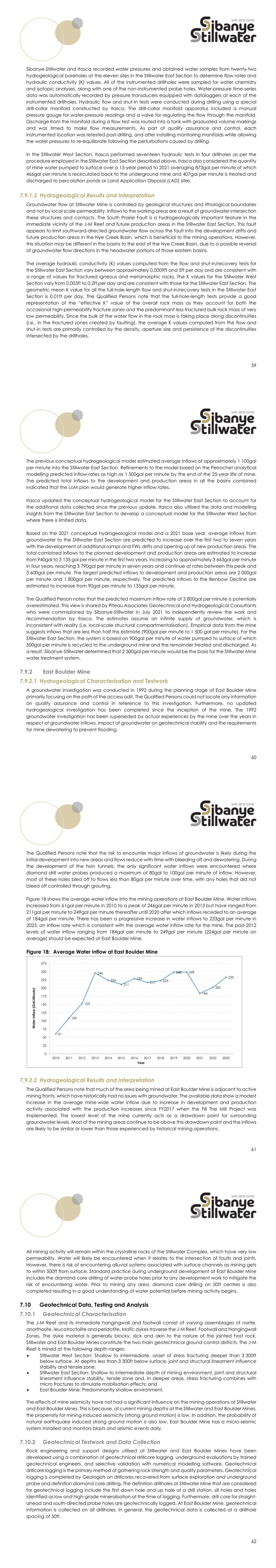 59 Sibanye-Stillwater and Itasca recorded water pressures and obtained water samples from twenty-two hydrogeological boreholes at the eleven sites in the Stillwater East Section to determine flow rates and hydraulic conductivity (K) values. All of the instrumented drillholes were sampled for water chemistry and isotopic analyses, along with one of the non-instrumented probe holes. Water-pressure time-series data was automatically recorded by pressure transducers equipped with dataloggers at each of the instrumented drillholes. Hydraulic flow and shut-in tests were conducted during drilling using a special drill-collar manifold constructed by Itasca. The drill-collar manifold apparatus included a manual pressure gauge for water-pressure readings and a valve for regulating the flow through the manifold. Discharge from the manifold during a flow test was routed into a tank with graduated volume markings and was timed to make flow measurements. As part of quality assurance and control, each instrumented location was retested post-drilling, and after installing monitoring manifolds while allowing the water pressures to re-equilibrate following the perturbations caused by drilling. In the Stillwater West Section, Itasca performed seventeen hydraulic tests in four drillholes as per the procedure employed in the Stillwater East Section described above. Itasca also considered the quantity of mine water pumped to surface over a 15-year period to 2021 averaging 873gal per minute of which 466gal per minute is recirculated back to the underground mine and 407gal per minute is treated and discharged to percolation ponds or Land Application Disposal (LAD) sites. 7.9.1.3 Hydrogeological Results and Interpretation Groundwater flow at Stillwater Mine is controlled by geological structures and lithological boundaries and not by local scale permeability. Inflows to the working areas are a result of groundwater intersection these structures and contacts. The South Prairie Fault is a hydrogeologically important feature in the immediate vicinity of the J-M Reef and future production areas in the Stillwater East Section. This fault appears to limit southward-directed groundwater flow across the fault into the development drifts and future production areas in the Nye Creek Basin, which is beneficial to the mining operations. However, this situation may be different in the basins to the east of the Nye Creek Basin, due to a possible reversal of groundwater flow directions in the headwater portions of those eastern basins. The average hydraulic conductivity (K) values computed from the flow and shut-in/recovery tests for the Stillwater East Section vary between approximately 0.0009ft and 5ft per day and are consistent with a range of values for fractured igneous and metamorphic rocks. The K values for the Stillwater West Section vary from 0.003ft to 0.2ft per day and are consistent with those for the Stillwater East Section. The geometric mean K value for all the full-hole-length flow and shut-in/recovery tests in the Stillwater East Section is 0.01ft per day. The Qualified Persons note that the full-hole-length tests provide a good representation of the “effective K” value of the overall rock mass as they account for both the occasional high-permeability fracture zones and the predominant less-fractured bulk rock mass of very low permeability. Since the bulk of the water flow in the rock mass is taking place along discontinuities (i.e., in the fractured zones created by faulting), the average K values computed from the flow and shut-in tests are primarily controlled by the density, aperture size and persistence of the discontinuities intersected by the drillholes. 60 The previous conceptual hydrogeological model estimated average inflows of approximately 1 100gal per minute into the Stillwater East Section. Refinements to the model based on the Perrochet analytical modelling predicted inflow rates as high as 1 500gal per minute by the end of the 25-year life of mine. The predicted total inflows to the development and production areas in all the basins combined indicated that the LoM plan would generate higher inflow rates. Itasca updated the conceptual hydrogeological model for the Stillwater East Section to account for the additional data collected since the previous update. Itasca also utilised the data and modelling insights from the Stillwater East Section to develop a conceptual model for the Stillwater West Section where there is limited data. Based on the 2021 conceptual hydrogeological model and a 2021 base year, average inflows from groundwater to the Stillwater East Section are predicted to increase over the first two to seven years with the development of additional ramps and FWL drifts and opening up of new production areas. The total combined inflows to the planned development and production areas are estimated to increase from 940gal to 3 135 gal per minute in the first two years, increasing to approximately 3 663gal per minute in four years, reaching 3 790gal per minute in seven years and continue at rates between this peak and 3 600gal per minute. The largest predicted inflows to development and production areas are 2 000gal per minute and 1 800gal per minute, respectively. The predicted inflows to the Benbow Decline are estimated to increase from 90gal per minute to 135gal per minute. The Qualified Person notes that the predicted maximum inflow rate of 3 800gal per minute is potentially overestimated. This view is shared by Piteau Associates Geotechnical and Hydrogeological Consultants who were commissioned by Sibanye-Stillwater in July 2021 to independently review the work and recommendation by Itasca. The estimates assume an infinite supply of groundwater, which is inconsistent with reality (i.e. local-scale structural compartmentalisation). Empirical data from the mine suggests inflows that are less than half this estimate (900gal per minute to 1 500 gal per minute). For the Stillwater Eas