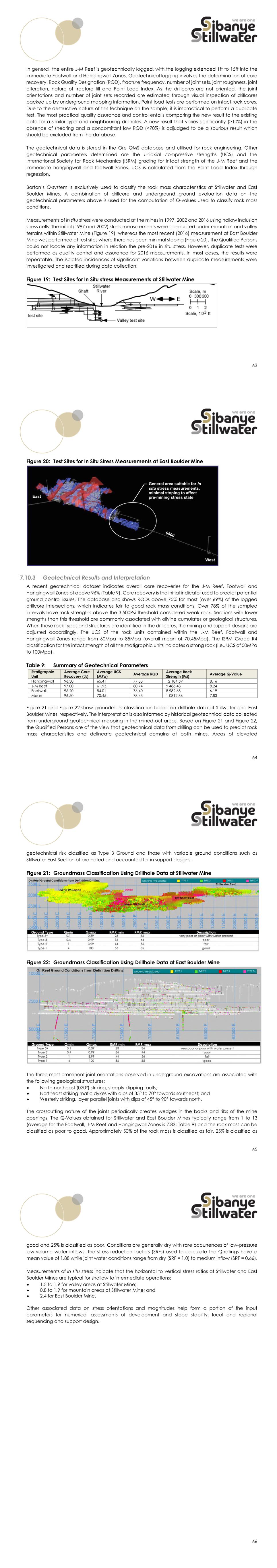 63 In general, the entire J-M Reef is geotechnically logged, with the logging extended 1ft to 15ft into the immediate Footwall and Hangingwall Zones. Geotechnical logging involves the determination of core recovery, Rock Quality Designation (RQD), fracture frequency, number of joint sets, joint roughness, joint alteration, nature of fracture fill and Point Load Index. As the drillcores are not oriented, the joint orientations and number of joint sets recorded are estimated through visual inspection of drillcores backed up by underground mapping information. Point load tests are performed on intact rock cores. Due to the destructive nature of this technique on the sample, it is impractical to perform a duplicate test. The most practical quality assurance and control entails comparing the new result to the existing data for a similar type and neighbouring drillholes. A new result that varies significantly (>10%) in the absence of shearing and a concomitant low RQD (<70%) is adjudged to be a spurious result which should be excluded from the database. The geotechnical data is stored in the Ore QMS database and utilised for rock engineering. Other geotechnical parameters determined are the uniaxial compressive strengths (UCS) and the International Society for Rock Mechanics (ISRM) grading for intact strength of the J-M Reef and the immediate hangingwall and footwall zones. UCS is calculated from the Point Load Index through regression. Barton’s Q-system is exclusively used to classify the rock mass characteristics at Stillwater and East Boulder Mines. A combination of drillcore and underground ground evaluation data on the geotechnical parameters above is used for the computation of Q-values used to classify rock mass conditions. Measurements of in situ stress were conducted at the mines in 1997, 2002 and 2016 using hollow inclusion stress cells. The initial (1997 and 2002) stress measurements were conducted under mountain and valley terrains within Stillwater Mine (Figure 19), whereas the most recent (2016) measurement at East Boulder Mine was performed at test sites where there has been minimal stoping (Figure 20). The Qualified Persons could not locate any information in relation the pre-2016 in situ stress. However, duplicate tests were performed as quality control and assurance for 2016 measurements. In most cases, the results were repeatable. The isolated incidences of significant variations between duplicate measurements were investigated and rectified during data collection. Figure 19: Test Sites for In Situ stress Measurements at Stillwater Mine 64 Figure 20: Test Sites for In Situ Stress Measurements at East Boulder Mine Geotechnical Results and Interpretation A recent geotechnical dataset indicates overall core recoveries for the J-M Reef, Footwall and Hangingwall Zones of above 96% (Table 9). Core recovery is the initial indicator used to predict potential ground control issues. The database also shows RQDs above 75% for most (over 69%) of the logged drillcore intersections, which indicates fair to good rock mass conditions. Over 78% of the sampled intervals have rock strengths above the 3 500Psi threshold considered weak rock. Sections with lower strengths than this threshold are commonly associated with olivine cumulates or geological structures. When these rock types and structures are identified in the drillcores, the mining and support designs are adjusted accordingly. The UCS of the rock units contained within the J-M Reef, Footwall and Hangingwall Zones range from 60Mpa to 85Mpa (overall mean of 70.45Mpa). The ISRM Grade R4 classification for the intact strength of all the stratigraphic units indicates a strong rock (i.e., UCS of 50MPa to 100Mpa). Table 9: Summary of Geotechnical Parameters Stratigraphic Unit Average Core Recovery (%) Average UCS (MPa) Average RQD Average Rock Strength (Psi) Average Q-Value Hangingwall 96.30 65.41 77.83 12 184.59 8.16 J-M Reef 97.00 61.93 80.74 9 486.48 8.24 Footwall 96.20 84.01 76.40 8 982.68 6.19 Mean 96.50 70.45 78.43 1 0812.86 7.83 Figure 21 and Figure 22 show groundmass classification based on drillhole data at Stillwater and East Boulder Mines, respectively. The interpretation is also informed by historical geotechnical data collected from underground geotechnical mapping in the mined-out areas. Based on Figure 21 and Figure 22, the Qualified Persons are of the view that geotechnical data from drilling can be used to predict rock mass characteristics and delineate geotechnical domains at both mines. Areas of elevated 65 geotechnical risk classified as Type 3 Ground and those with variable ground conditions such as Stillwater East Section of are noted and accounted for in support designs. Figure 21: Groundmass Classification Using Drillhole Data at Stillwater Mine Figure 22: Groundmass Classification Using Drillhole Data at East Boulder Mine The three most prominent joint orientations observed in underground excavations are associated with the following geological structures:  North-northeast (020°) striking, steeply dipping faults;  Northeast striking mafic dykes with dips of 35° to 70° towards southeast; and  Westerly striking, layer parallel joints with dips of 45° to 90° towards north. The crosscutting nature of the joints periodically creates wedges in the backs and ribs of the mine openings. The Q-Values obtained for Stillwater and East Boulder Mines typically range from 1 to 13 (average for the Footwall, J-M Reef and Hangingwall Zones is 7.83; Table 9) and the rock mass can be classified as poor to good. Approximately 50% of the rock mass is classified as fair, 25% is classified as 66 good and 25% is classified as poor. Conditions are generally dry with rare occurrences of low-pressure low-volume water inflows. The stress reduction factors (SRFs) used to calculate the Q-ratings have a mean value of 1.88 while joint water conditions range from dry (SRF = 1.0) to medium inflow (SRF = 0.66). Measurements of in situ 