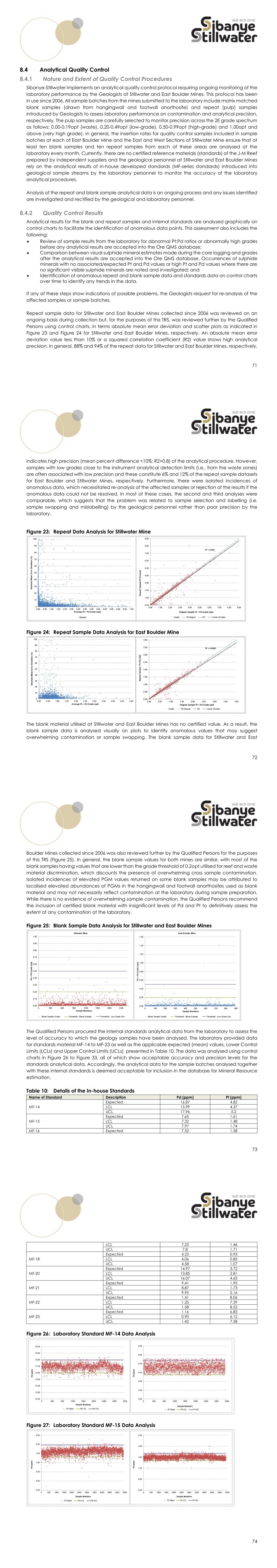 71 Analytical Quality Control Nature and Extent of Quality Control Procedures Sibanye-Stillwater implements an analytical quality control protocol requiring ongoing monitoring of the laboratory performance by the Geologists at Stillwater and East Boulder Mines. This protocol has been in use since 2006. All sample batches from the mines submitted to the laboratory include matrix matched blank samples (drawn from hangingwall and footwall anorthosite) and repeat (pulp) samples introduced by Geologists to assess laboratory performance on contamination and analytical precision, respectively. The pulp samples are carefully selected to monitor precision across the 2E grade spectrum as follows: 0.00-0.19opt (waste), 0.20-0.49opt (low-grade), 0.50-0.99opt (high-grade) and 1.00opt and above (very high grade). In general, the insertion rates for quality control samples included in sample batches at each of East Boulder Mine and the East and West Sections of Stillwater Mine ensure that at least ten blank samples and ten repeat samples from each of these areas are analysed at the laboratory every month. Currently, there are no certified reference materials (standards) of the J-M Reef prepared by independent suppliers and the geological personnel at Stillwater and East Boulder Mines rely on the analytical results of in-house developed standards (MF-series standards) introduced into geological sample streams by the laboratory personnel to monitor the accuracy of the laboratory analytical procedures. Analysis of the repeat and blank sample analytical data is an ongoing process and any issues identified are investigated and rectified by the geological and laboratory personnel. Quality Control Results Analytical results for the blank and repeat samples and internal standards are analysed graphically on control charts to facilitate the identification of anomalous data points. This assessment also includes the following:  Review of sample results from the laboratory for abnormal Pt:Pd ratios or abnormally high grades before any analytical results are accepted into the Ore QMS database;  Comparison between visual sulphide mineral estimates made during the core logging and grades after the analytical results are accepted into the Ore QMS database. Occurrences of sulphide minerals with no associated/expected Pt and Pd values or high Pt and Pd values where there are no significant visible sulphide minerals are noted and investigated; and  Identification of anomalous repeat and blank sample data and standards data on control charts over time to identify any trends in the data. If any of these steps show indications of possible problems, the Geologists request for re-analysis of the affected samples or sample batches. Repeat sample data for Stillwater and East Boulder Mines collected since 2006 was reviewed on an ongoing basis during collection but, for the purposes of this TRS, was reviewed further by the Qualified Persons using control charts, in terms absolute mean error deviation and scatter plots as indicated in Figure 23 and Figure 24 for Stillwater and East Boulder Mines, respectively. An absolute mean error deviation value less than 10% or a squared correlation coefficient (R2) value shows high analytical precision. In general, 88% and 94% of the repeat data for Stillwater and East Boulder Mines, respectively, 72 indicates high precision (mean percent difference <10%; R2>0.8) of the analytical procedure. However, samples with low grades close to the instrument analytical detection limits (i.e., from the waste zones) are often associated with low precision and these constitute 6% and 12% of the repeat sample datasets for East Boulder and Stillwater Mines, respectively. Furthermore, there were isolated incidences of anomalous data, which necessitated re-analysis of the affected samples or rejection of the results if the anomalous data could not be resolved. In most of these cases, the second and third analyses were comparable, which suggests that the problem was related to sample selection and labelling (i.e. sample swapping and mislabelling) by the geological personnel rather than poor precision by the laboratory. Figure 23: Repeat Data Analysis for Stillwater Mine Figure 24: Repeat Sample Data Analysis for East Boulder Mine The blank material utilised at Stillwater and East Boulder Mines has no certified value. As a result, the blank sample data is analysed visually on plots to identify anomalous values that may suggest overwhelming contamination or sample swapping. The blank sample data for Stillwater and East 73 Boulder Mines collected since 2006 was also reviewed further by the Qualified Persons for the purposes of this TRS (Figure 25). In general, the blank sample values for both mines are similar, with most of the blank samples having values that are lower than the grade threshold of 0.2opt utilised for reef and waste material discrimination, which discounts the presence of overwhelming cross sample contamination. Isolated incidences of elevated PGM values returned on some blank samples may be attributed to localised elevated abundances of PGMs in the hangingwall and footwall anorthosites used as blank material and may not necessarily reflect contamination at the laboratory during sample preparation. While there is no evidence of overwhelming sample contamination, the Qualified Persons recommend the inclusion of certified blank material with insignificant levels of Pd and Pt to definitively assess the extent of any contamination at the laboratory. Figure 25: Blank Sample Data Analysis for Stillwater and East Boulder Mines The Qualified Persons procured the internal standards analytical data from the laboratory to assess the level of accuracy to which the geology samples have been analysed. The laboratory provided data for standards material MF-14 to MF-23 as well as the applicable expected (mean) values, Lower Control Limits (LCLs) and Upper Control Limits (UCLs) presented in Table 10. The d