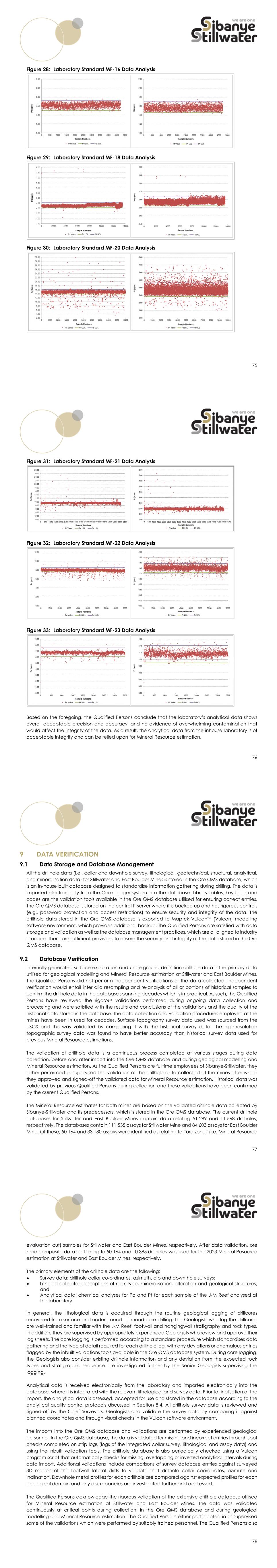 75 Figure 28: Laboratory Standard MF-16 Data Analysis Figure 29: Laboratory Standard MF-18 Data Analysis Figure 30: Laboratory Standard MF-20 Data Analysis 76 Figure 31: Laboratory Standard MF-21 Data Analysis Figure 32: Laboratory Standard MF-22 Data Analysis Figure 33: Laboratory Standard MF-23 Data Analysis Based on the foregoing, the Qualified Persons conclude that the laboratory’s analytical data shows overall acceptable precision and accuracy, and no evidence of overwhelming contamination that would affect the integrity of the data. As a result, the analytical data from the inhouse laboratory is of acceptable integrity and can be relied upon for Mineral Resource estimation. 77 DATA VERIFICATION Data Storage and Database Management All the drillhole data (i.e., collar and downhole survey, lithological, geotechnical, structural, analytical, and mineralisation data) for Stillwater and East Boulder Mines is stored in the Ore QMS database, which is an in-house built database designed to standardise information gathering during drilling. The data is imported electronically from the Core Logger system into the database. Library tables, key fields and codes are the validation tools available in the Ore QMS database utilised for ensuring correct entries. The Ore QMS database is stored on the central IT server where it is backed up and has rigorous controls (e.g., password protection and access restrictions) to ensure security and integrity of the data. The drillhole data stored in the Ore QMS database is exported to Maptek VulcanTM (Vulcan) modelling software environment, which provides additional backup. The Qualified Persons are satisfied with data storage and validation as well as the database management practices, which are all aligned to industry practice. There are sufficient provisions to ensure the security and integrity of the data stored in the Ore QMS database. Database Verification Internally generated surface exploration and underground definition drillhole data is the primary data utilised for geological modelling and Mineral Resource estimation at Stillwater and East Boulder Mines. The Qualified Persons did not perform independent verifications of the data collected. Independent verification would entail inter alia resampling and re-analysis of all or portions of historical samples to confirm the drillhole data in the database spanning decades which is impractical. As such, the Qualified Persons have reviewed the rigorous validations performed during ongoing data collection and processing and were satisfied with the results and conclusions of the validations and the quality of the historical data stored in the database. The data collection and validation procedures employed at the mines have been in used for decades. Surface topography survey data used was sourced from the USGS and this was validated by comparing it with the historical survey data. The high-resolution topographic survey data was found to have better accuracy than historical survey data used for previous Mineral Resource estimations. The validation of drillhole data is a continuous process completed at various stages during data collection, before and after import into the Ore QMS database and during geological modelling and Mineral Resource estimation. As the Qualified Persons are fulltime employees of Sibanye-Stillwater, they either performed or supervised the validation of the drillhole data collected at the mines after which they approved and signed-off the validated data for Mineral Resource estimation. Historical data was validated by previous Qualified Persons during collection and these validations have been confirmed by the current Qualified Persons. The Mineral Resource estimates for both mines are based on the validated drillhole data collected by Sibanye-Stillwater and its predecessors, which is stored in the Ore QMS database. The current drillhole databases for Stillwater and East Boulder Mines contain data relating 51 289 and 11 568 drillholes, respectively. The databases contain 111 535 assays for Stillwater Mine and 84 603 assays for East Boulder Mine. Of these, 50 164 and 33 180 assays were identified as relating to “ore zone” (i.e. Mineral Resource 78 evaluation cut) samples for Stillwater and East Boulder Mines, respectively. After data validation, ore zone composite data pertaining to 50 164 and 10 385 drillholes was used for the 2023 Mineral Resource estimation at Stillwater and East Boulder Mines, respectively. The primary elements of the drillhole data are the following:  Survey data: drillhole collar co-ordinates, azimuth, dip and down hole surveys;  Lithological data: descriptions of rock type, mineralisation, alteration and geological structures; and  Analytical data: chemical analyses for Pd and Pt for each sample of the J-M Reef analysed at the laboratory. In general, the lithological data is acquired through the routine geological logging of drillcores recovered from surface and underground diamond core drilling. The Geologists who log the drillcores are well-trained and familiar with the J-M Reef, footwall and hangingwall stratigraphy and rock types. In addition, they are supervised by appropriately experienced Geologists who review and approve their log sheets. The core logging is performed according to a standard procedure which standardises data gathering and the type of detail required for each drillhole log, with any deviations or anomalous entries flagged by the inbuilt validations tools available in the Ore QMS database system. During core logging, the Geologists also consider existing drillhole information and any deviation from the expected rock types and stratigraphic sequence are investigated further by the Senior Geologists supervising the logging. Analytical data is received electronically from the laboratory and imported electronically into the database, where it is integrated with the relevant lithological and survey data. Prior to finalisation of the