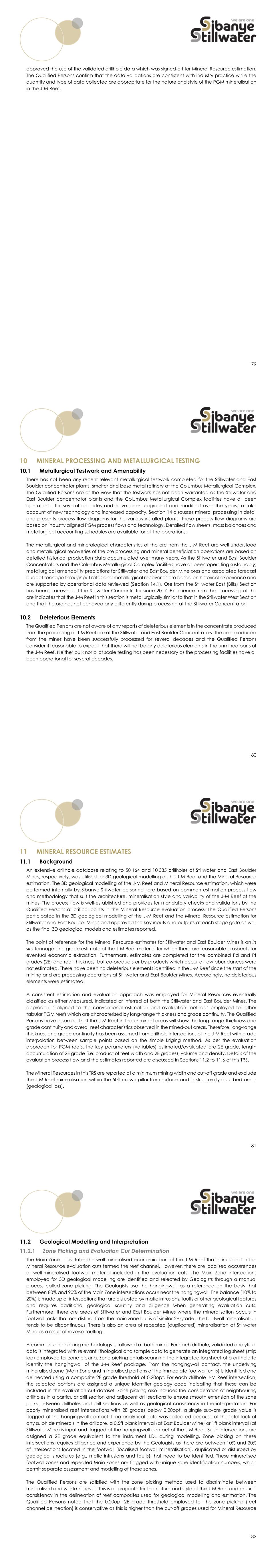 79 approved the use of the validated drillhole data which was signed-off for Mineral Resource estimation. The Qualified Persons confirm that the data validations are consistent with industry practice while the quantity and type of data collected are appropriate for the nature and style of the PGM mineralisation in the J-M Reef. 80 MINERAL PROCESSING AND METALLURGICAL TESTING Metallurgical Testwork and Amenability There has not been any recent relevant metallurgical testwork completed for the Stillwater and East Boulder concentrator plants, smelter and base metal refinery at the Columbus Metallurgical Complex. The Qualified Persons are of the view that the testwork has not been warranted as the Stillwater and East Boulder concentrator plants and the Columbus Metallurgical Complex facilities have all been operational for several decades and have been upgraded and modified over the years to take account of new technology and increased capacity. Section 14 discusses mineral processing in detail and presents process flow diagrams for the various installed plants. These process flow diagrams are based on industry aligned PGM process flows and technology. Detailed flow sheets, mass balances and metallurgical accounting schedules are available for all the operations. The metallurgical and mineralogical characteristics of the ore from the J-M Reef are well-understood and metallurgical recoveries of the ore processing and mineral beneficiation operations are based on detailed historical production data accumulated over many years. As the Stillwater and East Boulder Concentrators and the Columbus Metallurgical Complex facilities have all been operating sustainably, metallurgical amenability predictions for Stillwater and East Boulder Mine ores and associated forecast budget tonnage throughput rates and metallurgical recoveries are based on historical experience and are supported by operational data reviewed (Section 14.1). Ore from the Stillwater East (Blitz) Section has been processed at the Stillwater Concentrator since 2017. Experience from the processing of this ore indicates that the J-M Reef in this section is metallurgically similar to that in the Stillwater West Section and that the ore has not behaved any differently during processing at the Stillwater Concentrator. Deleterious Elements The Qualified Persons are not aware of any reports of deleterious elements in the concentrate produced from the processing of J-M Reef ore at the Stillwater and East Boulder Concentrators. The ores produced from the mines have been successfully processed for several decades and the Qualified Persons consider it reasonable to expect that there will not be any deleterious elements in the unmined parts of the J-M Reef. Neither bulk nor pilot scale testing has been necessary as the processing facilities have all been operational for several decades. 81 MINERAL RESOURCE ESTIMATES Background An extensive drillhole database relating to 50 164 and 10 385 drillholes at Stillwater and East Boulder Mines, respectively, was utilised for 3D geological modelling of the J-M Reef and the Mineral Resource estimation. The 3D geological modelling of the J-M Reef and Mineral Resource estimation, which were performed internally by Sibanye-Stillwater personnel, are based on common estimation process flow and methodology that suit the architecture, mineralisation style and variability of the J-M Reef at the mines. The process flow is well-established and provides for mandatory checks and validations by the Qualified Persons at critical points in the Mineral Resource evaluation process. The Qualified Persons participated in the 3D geological modelling of the J-M Reef and the Mineral Resource estimation for Stillwater and East Boulder Mines and approved the key inputs and outputs at each stage gate as well as the final 3D geological models and estimates reported. The point of reference for the Mineral Resource estimates for Stillwater and East Boulder Mines is an in situ tonnage and grade estimate of the J-M Reef material for which there are reasonable prospects for eventual economic extraction. Furthermore, estimates are completed for the combined Pd and Pt grades (2E) and reef thickness, but co-products or by-products which occur at low abundances were not estimated. There have been no deleterious elements identified in the J-M Reef since the start of the mining and ore processing operations at Stillwater and East Boulder Mines. Accordingly, no deleterious elements were estimated. A consistent estimation and evaluation approach was employed for Mineral Resources eventually classified as either Measured, Indicated or Inferred at both the Stillwater and East Boulder Mines. The approach is aligned to the conventional estimation and evaluation methods employed for other tabular PGM reefs which are characterised by long-range thickness and grade continuity. The Qualified Persons have assumed that the J-M Reef in the unmined areas will show the long-range thickness and grade continuity and overall reef characteristics observed in the mined-out areas. Therefore, long-range thickness and grade continuity has been assumed from drillhole intersections of the J-M Reef with grade interpolation between sample points based on the simple kriging method. As per the evaluation approach for PGM reefs, the key parameters (variables) estimated/evaluated are 2E grade, length accumulation of 2E grade (i.e. product of reef width and 2E grades), volume and density. Details of the evaluation process flow and the estimates reported are discussed in Sections 11.2 to 11.6 of this TRS. The Mineral Resources in this TRS are reported at a minimum mining width and cut-off grade and exclude the J-M Reef mineralisation within the 50ft crown pillar from surface and in structurally disturbed areas (geological loss). 82 Geological Modelling and Interpretation Zone Picking and Evaluation Cut Determination The Main Zone constitutes the well-mineralised economic part o