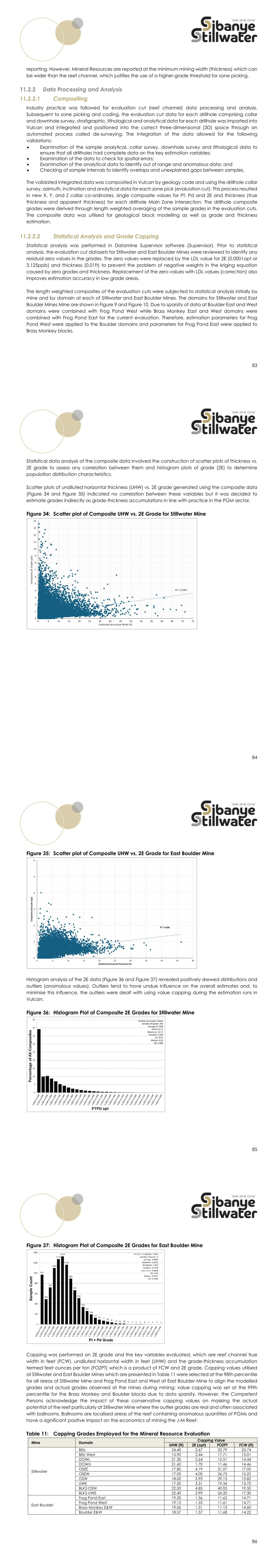 83 reporting. However, Mineral Resources are reported at the minimum mining width (thickness) which can be wider than the reef channel, which justifies the use of a higher-grade threshold for zone picking. Data Processing and Analysis 11.2.2.1 Compositing Industry practice was followed for evaluation cut (reef channel) data processing and analysis. Subsequent to zone picking and coding, the evaluation cut data for each drillhole comprising collar and downhole survey, stratigraphic, lithological and analytical data for each drillhole was imported into Vulcan and integrated and positioned into the correct three-dimensional (3D) space through an automated process called de-surveying. The integration of the data allowed for the following validations:  Examination of the sample analytical, collar survey, downhole survey and lithological data to ensure that all drillholes had complete data on the key estimation variables;  Examination of the data to check for spatial errors;  Examination of the analytical data to identify out of range and anomalous data; and  Checking of sample intervals to identify overlaps and unexplained gaps between samples. The validated integrated data was composited in Vulcan by geology code and using the drillhole collar survey, azimuth, inclination and analytical data for each zone pick (evaluation cut). This process resulted in new X, Y, and Z collar co-ordinates, single composite values for Pt, Pd and 2E and thickness (true thickness and apparent thickness) for each drillhole Main Zone intersection. The drillhole composite grades were derived through length weighted averaging of the sample grades in the evaluation cuts. The composite data was utilised for geological block modelling as well as grade and thickness estimation. 11.2.2.2 Statistical Analysis and Grade Capping Statistical analysis was performed in Datamine Supervisor software (Supervisor). Prior to statistical analysis, the evaluation cut datasets for Stillwater and East Boulder Mines were reviewed to identify any residual zero values in the grades. The zero values were replaced by the LDL value for 2E (0.0001opt or 3.125ppb) and thickness (0.01ft) to prevent the problem of negative weights in the kriging equation caused by zero grades and thickness. Replacement of the zero values with LDL values (correction) also improves estimation accuracy in low grade areas. The length weighted composites of the evaluation cuts were subjected to statistical analysis initially by mine and by domain at each of Stillwater and East Boulder Mines. The domains for Stillwater and East Boulder Mines Mine are shown in Figure 9 and Figure 10. Due to sparsity of data at Boulder East and West domains were combined with Frog Pond West while Brass Monkey East and West domains were combined with Frog Pond East for the current evaluation. Therefore, estimation parameters for Frog Pond West were applied to the Boulder domains and parameters for Frog Pond East were applied to Brass Monkey blocks. 84 Statistical data analysis of the composite data involved the construction of scatter plots of thickness vs. 2E grade to assess any correlation between them and histogram plots of grade (2E) to determine population distribution characteristics. Scatter plots of undiluted horizontal thickness (UHW) vs. 2E grade generated using the composite data (Figure 34 and Figure 35) indicated no correlation between these variables but it was decided to estimate grades indirectly as grade-thickness accumulations in line with practice in the PGM sector. Figure 34: Scatter plot of Composite UHW vs. 2E Grade for Stillwater Mine R² = 0.0347 0 1 2 3 4 5 6 7 8 9 10 11 12 13 14 0 5 10 15 20 25 30 35 40 45 50 55 60 65 70 75 C o m p o s it e 2 E G ra d e ( o p t) Undiluted Horizontal Width (ft) 85 Figure 35: Scatter plot of Composite UHW vs. 2E Grade for East Boulder Mine Histogram analysis of the 2E data (Figure 36 and Figure 37) revealed positively skewed distributions and outliers (anomalous values). Outliers tend to have undue influence on the overall estimates and, to minimise this influence, the outliers were dealt with using value capping during the estimation runs in Vulcan. Figure 36: Histogram Plot of Composite 2E Grades for Stillwater Mine R² = 0.058 0 1 2 3 4 5 6 0 5 10 15 20 25 30 35 40 45 50 C o m p o si te 2 E G ra d e (o p t) Undiluted Horizontal Thickness (ft) 86 Figure 37: Histogram Plot of Composite 2E Grades for East Boulder Mine Capping was performed on 2E grade and the key variables evaluated, which are reef channel true width in feet (FCW), undiluted horizontal width in feet (UHW) and the grade-thickness accumulation termed feet ounces per ton (FOZPT) which is a product of FCW and 2E grade. Capping values utilised at Stillwater and East Boulder Mines which are presented in Table 11 were selected at the 98th percentile for all areas of Stillwater Mine and Frog Pond East and West at East Boulder Mine to align the modelled grades and actual grades observed at the mines during mining; value capping was set at the 99th percentile for the Brass Monkey and Boulder blocks due to data sparsity. However, the Competent Persons acknowledge the impact of these conservative capping values on masking the actual potential of the reef particularly at Stillwater Mine where the outlier grades are real and often associated with ballrooms. Ballrooms are localised areas of the reef containing anomalous quantities of PGMs and have a significant positive impact on the economics of mining the J-M Reef. Table 11: Capping Grades Employed for the Mineral Resource Evaluation Mine Domain Capping Value UHW (ft) 2E (opt) FOZPT FCW (ft) Stillwater Blitz 24.40 2.67 32.79 23.74 Blitz West 15.90 2.44 17.71 15.01 DOWL 21.30 2.64 15.51 14.44 DOWU 21.60 1.70 11.46 14.46 OSEE 17.80 4.19 31.07 17.05 OSEW 17.00 4.00 26.75 15.22 OSW 18.00 3.93 29.13 15.82 UWE 17.50 3.31 19.34 13.72 BLK2-OSW 22.00 4.85 40.05 19.50 BLK2-UWE 22.40 3.99 26.20 17.30 East Boulder Frog Pond Ea