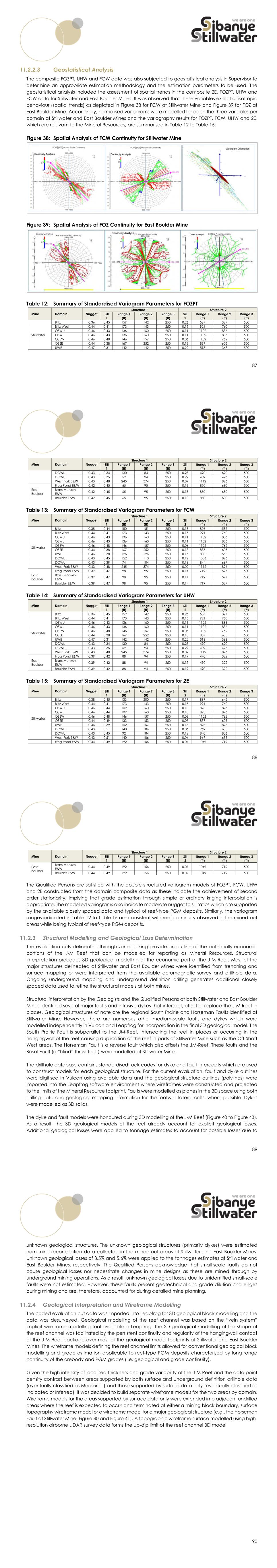 87 11.2.2.3 Geostatistical Analysis The composite FOZPT, UHW and FCW data was also subjected to geostatistical analysis in Supervisor to determine an appropriate estimation methodology and the estimation parameters to be used. The geostatistical analysis included the assessment of spatial trends in the composite 2E, FOZPT, UHW and FCW data for Stillwater and East Boulder Mines. It was observed that these variables exhibit anisotropic behaviour (spatial trends) as depicted in Figure 38 for FCW at Stillwater Mine and Figure 39 for FOZ at East Boulder Mine. Accordingly, normalised variograms were modelled for each the three variables per domain at Stillwater and East Boulder Mines and the variography results for FOZPT, FCW, UHW and 2E, which are relevant to the Mineral Resources, are summarised in Table 12 to Table 15. Figure 38: Spatial Analysis of FCW Continuity for Stillwater Mine Figure 39: Spatial Analysis of FOZ Continuity for East Boulder Mine Table 12: Summary of Standardised Variogram Parameters for FOZPT Mine Domain Nugget Structure 1 Structure 2 Sill 1 Range 1 (ft) Range 2 (ft) Range 3 (ft) Sill 2 Range 1 (ft) Range 2 (ft) Range 3 (ft) Stillwater Blitz 0.36 0.45 159 142 250 0.26 587 327 500 Blitz West 0.44 0.41 173 143 250 0.15 921 760 500 OSWU 0.46 0.43 136 160 250 0.11 1102 886 500 OSWL 0.46 0.43 136 160 250 0.11 1102 886 500 OSEW 0.46 0.48 146 157 250 0.06 1102 762 500 OSEE 0.44 0.38 167 252 250 0.18 887 605 500 UWE 0.47 0.31 142 142 250 0.22 513 368 500 88 Mine Domain Nugget Structure 1 Structure 2 Sill 1 Range 1 (ft) Range 2 (ft) Range 3 (ft) Sill 2 Range 1 (ft) Range 2 (ft) Range 3 (ft) DOWL 0.43 0.34 130 84 250 0.23 490 620 500 DOWU 0.43 0.35 59 94 250 0.22 409 426 500 West Fork E&W 0.43 0.48 245 374 250 0.09 1112 826 500 East Boulder Frog Pond E&W 0.42 0.45 65 95 250 0.13 850 680 500 Brass Monkey E&W 0.42 0.45 65 95 250 0.13 850 680 500 Boulder E&W 0.42 0.45 65 95 250 0.13 850 680 500 Table 13: Summary of Standardised Variogram Parameters for FCW Mine Domain Nugget Structure 1 Structure 2 Sill 1 Range 1 (ft) Range 2 (ft) Range 3 (ft) Sill 2 Range 1 (ft) Range 2 (ft) Range 3 (ft) Stillwater Blitz 0.38 0.44 180 151 250 0.18 806 589 500 Blitz West 0.44 0.41 173 143 250 0.15 921 760 500 OSWU 0.46 0.43 136 160 250 0.11 1102 886 500 OSWL 0.46 0.43 136 160 250 0.11 1102 886 500 OSEW 0.46 0.48 146 157 250 0.06 1102 762 500 OSEE 0.44 0.38 167 252 250 0.18 887 605 500 UWE 0.46 0.38 126 126 250 0.16 803 555 500 DOWL 0.43 0.45 152 110 250 0.12 1086 826 500 DOWU 0.43 0.39 74 104 250 0.18 844 667 500 West Fork E&W 0.43 0.48 245 374 250 0.09 1112 826 500 East Boulder Frog Pond E&W 0.39 0.47 98 95 250 0.14 719 527 500 Brass Monkey E&W 0.39 0.47 98 95 250 0.14 719 527 500 Boulder E&W 0.39 0.47 98 95 250 0.14 719 527 500 Table 14: Summary of Standardised Variogram Parameters for UHW Mine Domain Nugget Structure 1 Structure 2 Sill 1 Range 1 (ft) Range 2 (ft) Range 3 (ft) Sill 2 Range 1 (ft) Range 2 (ft) Range 3 (ft) Stillwater Blitz 0.36 0.45 159 142 250 0.26 587 327 500 Blitz West 0.44 0.41 173 143 250 0.15 921 760 500 OSWU 0.46 0.43 136 160 250 0.11 1102 886 500 OSWL 0.46 0.43 136 160 250 0.11 1102 886 500 OSEW 0.46 0.48 146 157 250 0.06 1102 762 500 OSEE 0.44 0.38 167 252 250 0.18 887 605 500 UWE 0.47 0.31 142 142 250 0.22 513 368 500 DOWL 0.43 0.34 130 84 250 0.23 490 620 500 DOWU 0.43 0.35 59 94 250 0.22 409 426 500 West Fork E&W 0.43 0.48 245 374 250 0.09 1112 826 500 East Boulder Frog Pond E&W 0.39 0.42 88 94 250 0.19 490 322 500 Brass Monkey E&W 0.39 0.42 88 94 250 0.19 490 322 500 Boulder E&W 0.39 0.42 88 94 250 0.19 490 322 500 Table 15: Summary of Standardised Variogram Parameters for 2E Mine Domain Nugget Structure 1 Structure 2 Sill 1 Range 1 (ft) Range 2 (ft) Range 3 (ft) Sill 2 Range 1 (ft) Range 2 (ft) Range 3 (ft) Stillwater Blitz 0.38 0.45 133 200 250 0.17 887 642 500 Blitz West 0.44 0.41 173 143 250 0.15 921 760 500 OSWU 0.46 0.44 109 160 250 0.10 893 876 500 OSWL 0.46 0.44 109 160 250 0.10 893 876 500 OSEW 0.46 0.48 146 157 250 0.06 1102 762 500 OSEE 0.44 0.49 133 153 250 0.07 887 605 500 UWE 0.46 0.39 102 157 250 0.15 826 823 500 DOWL 0.43 0.51 140 106 250 0.06 969 683 500 DOWU 0.43 0.45 92 184 250 0.12 840 806 500 West Fork E&W 0.43 0.51 140 106 250 0.06 969 683 500 Frog Pond E&W 0.44 0.49 192 156 250 0.07 1049 719 500 89 Mine Domain Nugget Structure 1 Structure 2 Sill 1 Range 1 (ft) Range 2 (ft) Range 3 (ft) Sill 2 Range 1 (ft) Range 2 (ft) Range 3 (ft) East Boulder Brass Monkey E&W 0.44 0.49 192 156 250 0.07 1049 719 500 Boulder E&W 0.44 0.49 192 156 250 0.07 1049 719 500 The Qualified Persons are satisfied with the double structured variogram models of FOZPT, FCW, UHW and 2E constructed from the domain composite data as these indicate the achievement of second order stationarity, implying that grade estimation through simple or ordinary kriging interpolation is appropriate. The modelled variograms also indicate moderate nugget to sill ratios which are supported by the available closely spaced data and typical of reef-type PGM deposits. Similarly, the variogram ranges indicated in Table 12 to Table 15 are consistent with reef continuity observed in the mined-out areas while being typical of reef-type PGM deposits. Structural Modelling and Geological Loss Determination The evaluation cuts delineated through zone picking provide an outline of the potentially economic portions of the J-M Reef that can be modelled for reporting as Mineral Resources. Structural interpretation precedes 3D geological modelling of the economic part of the J-M Reef. Most of the major structures delineated at Stillwater and East Boulder Mines were identified from trenching and surface mapping or were interpreted from the available aeromagnetic survey and drillhole data. Ongoing underground mapping and underground definition drilling generates additional closely spaced data used to refine the structural models at both mines. Structural interpretation by the Geologists and the Qualified Persons 