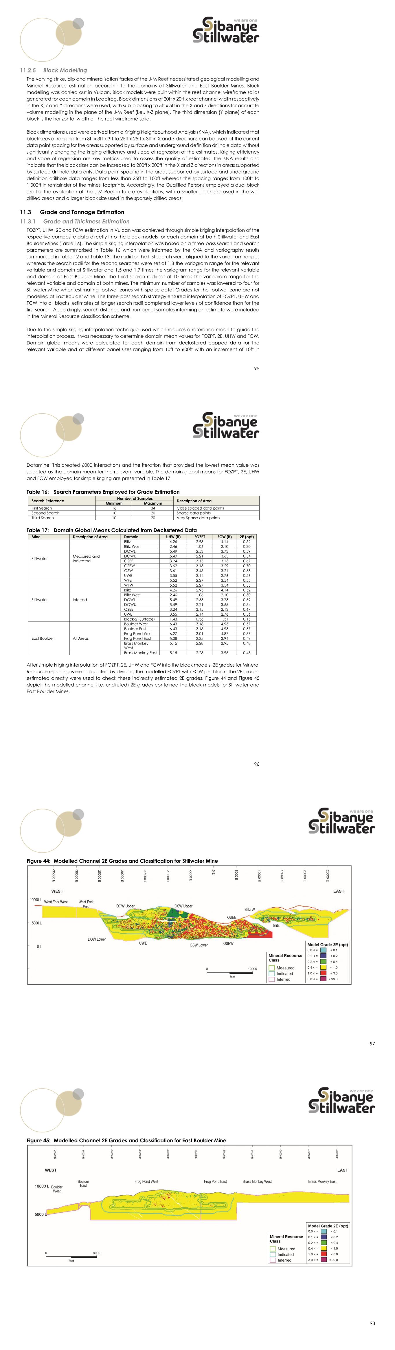 95 Block Modelling The varying strike, dip and mineralisation facies of the J-M Reef necessitated geological modelling and Mineral Resource estimation according to the domains at Stillwater and East Boulder Mines. Block modelling was carried out in Vulcan. Block models were built within the reef channel wireframe solids generated for each domain in Leapfrog. Block dimensions of 20ft x 20ft x reef channel width respectively in the X, Z and Y directions were used, with sub-blocking to 5ft x 5ft in the X and Z directions for accurate volume modelling in the plane of the J-M Reef (i.e., X-Z plane). The third dimension (Y plane) of each block is the horizontal width of the reef wireframe solid. Block dimensions used were derived from a Kriging Neighbourhood Analysis (KNA), which indicated that block sizes of ranging from 3ft x 3ft x 3ft to 25ft x 25ft x 3ft in X and Z directions can be used at the current data point spacing for the areas supported by surface and underground definition drillhole data without significantly changing the kriging efficiency and slope of regression of the estimates. Kriging efficiency and slope of regression are key metrics used to assess the quality of estimates. The KNA results also indicate that the block sizes can be increased to 200ft x 200ft in the X and Z directions in areas supported by surface drillhole data only. Data point spacing in the areas supported by surface and underground definition drillhole data ranges from less than 25ft to 100ft whereas the spacing ranges from 100ft to 1 000ft in remainder of the mines' footprints. Accordingly, the Qualified Persons employed a dual block size for the evaluation of the J-M Reef in future evaluations, with a smaller block size used in the well drilled areas and a larger block size used in the sparsely drilled areas. Grade and Tonnage Estimation Grade and Thickness Estimation FOZPT, UHW, 2E and FCW estimation in Vulcan was achieved through simple kriging interpolation of the respective composite data directly into the block models for each domain at both Stillwater and East Boulder Mines (Table 16). The simple kriging interpolation was based on a three-pass search and search parameters are summarised in Table 16 which were informed by the KNA and variography results summarised in Table 12 and Table 13. The radii for the first search were aligned to the variogram ranges whereas the search radii for the second searches were set at 1.8 the variogram range for the relevant variable and domain at Stillwater and 1.5 and 1.7 times the variogram range for the relevant variable and domain at East Boulder Mine. The third search radii set at 10 times the variogram range for the relevant variable and domain at both mines. The minimum number of samples was lowered to four for Stillwater Mine when estimating footwall zones with sparse data. Grades for the footwall zone are not modelled at East Boulder Mine. The three-pass search strategy ensured interpolation of FOZPT, UHW and FCW into all blocks, estimates at longer search radii completed lower levels of confidence than for the first search. Accordingly, search distance and number of samples informing an estimate were included in the Mineral Resource classification scheme. Due to the simple kriging interpolation technique used which requires a reference mean to guide the interpolation process, it was necessary to determine domain mean values for FOZPT, 2E, UHW and FCW. Domain global means were calculated for each domain from declustered capped data for the relevant variable and at different panel sizes ranging from 10ft to 600ft with an increment of 10ft in 96 Datamine. This created 6000 interactions and the iteration that provided the lowest mean value was selected as the domain mean for the relevant variable. The domain global means for FOZPT, 2E, UHW and FCW employed for simple kriging are presented in Table 17. Table 16: Search Parameters Employed for Grade Estimation Search Reference Number of Samples Description of Area Minimum Maximum First Search 16 34 Close spaced data points Second Search 10 20 Sparse data points Third Search 10 20 Very Sparse data points Table 17: Domain Global Means Calculated from Declustered Data Mine Description of Area Domain UHW (ft) FOZPT FCW (ft) 2E (opt) Stillwater Measured and Indicated Blitz 4.26 2.93 4.14 0.52 Blitz West 2.46 1.06 2.10 0.30 DOWL 5.49 2.53 3.73 0.59 DOWU 5.49 2.21 3.65 0.54 OSEE 3.24 3.15 3.13 0.67 OSEW 3.62 3.13 3.29 0.70 OSW 3.61 3.45 3.21 0.68 UWE 3.55 2.14 2.76 0.56 Stillwater Inferred WFE 5.52 2.27 3.54 0.55 WFW 5.52 2.27 3.54 0.55 Blitz 4.26 2.93 4.14 0.52 Blitz West 2.46 1.06 2.10 0.30 DOWL 5.49 2.53 3.73 0.59 DOWU 5.49 2.21 3.65 0.54 OSEE 3.24 3.15 3.13 0.67 UWE 3.55 2.14 2.76 0.56 Block-2 (Surface) 1.43 0.36 1.31 0.15 East Boulder All Areas Boulder West 6.43 3.18 4.93 0.57 Boulder East 6.43 3.18 4.93 0.57 Frog Pond West 6.27 3.01 4.87 0.57 Frog Pond East 5.08 2.35 3.94 0.49 Brass Monkey West 5.15 2.28 3.95 0.48 Brass Monkey East 5.15 2.28 3.95 0.48 After simple kriging interpolation of FOZPT, 2E, UHW and FCW into the block models, 2E grades for Mineral Resource reporting were calculated by dividing the modelled FOZPT with FCW per block. The 2E grades estimated directly were used to check these indirectly estimated 2E grades. Figure 44 and Figure 45 depict the modelled channel (i.e. undiluted) 2E grades contained the block models for Stillwater and East Boulder Mines. 97 Figure 44: Modelled Channel 2E Grades and Classification for Stillwater Mine 98 Figure 45: Modelled Channel 2E Grades and Classification for East Boulder Mine